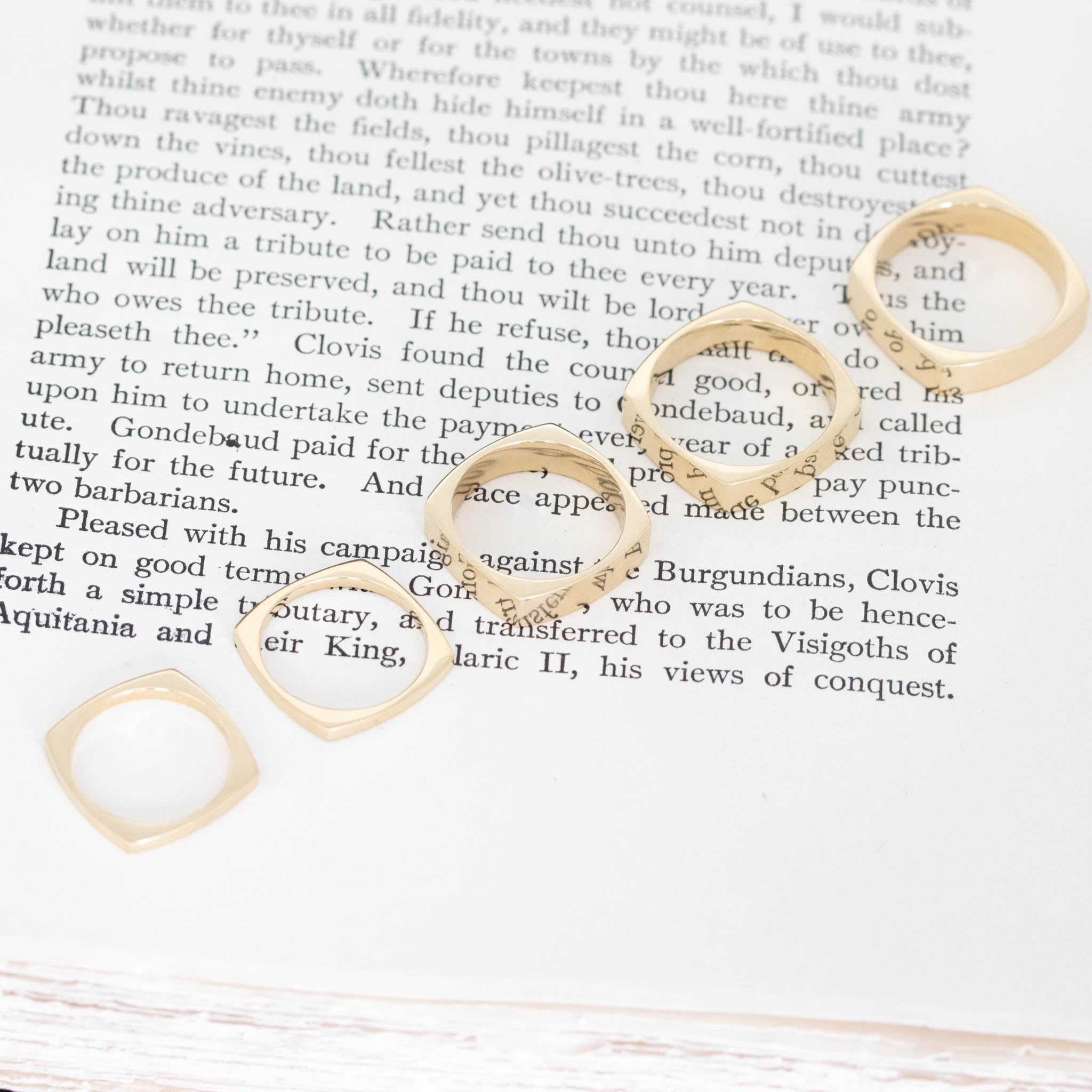 Cast from a vintage set of bands we came across, these square shank gold bands are sleek, bold, and absolutely stunning in 20kt yellow gold. Comfortable on the finger and the coolest vibe. Perfect for daily wear, and stacks well with other bands if that’s your jam!