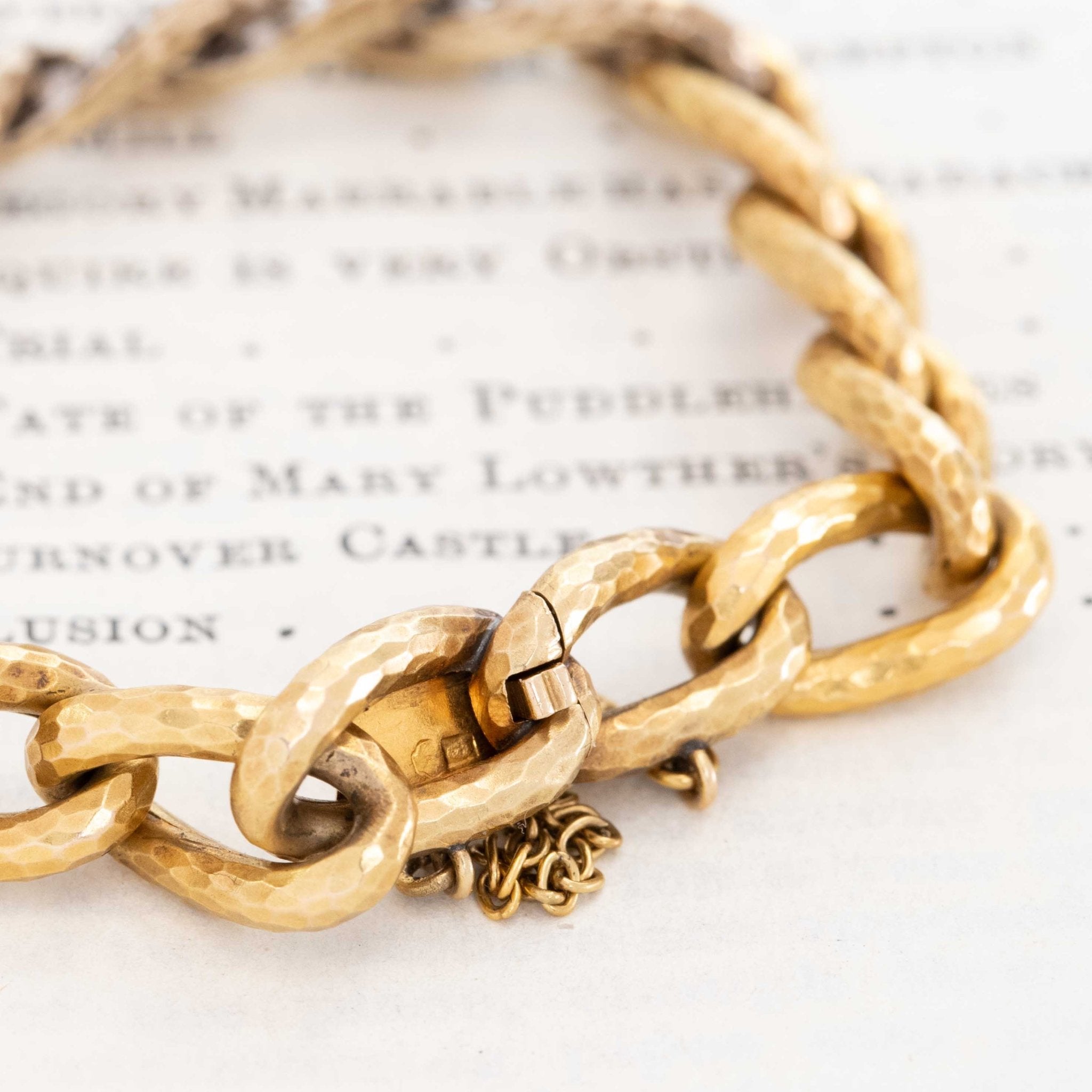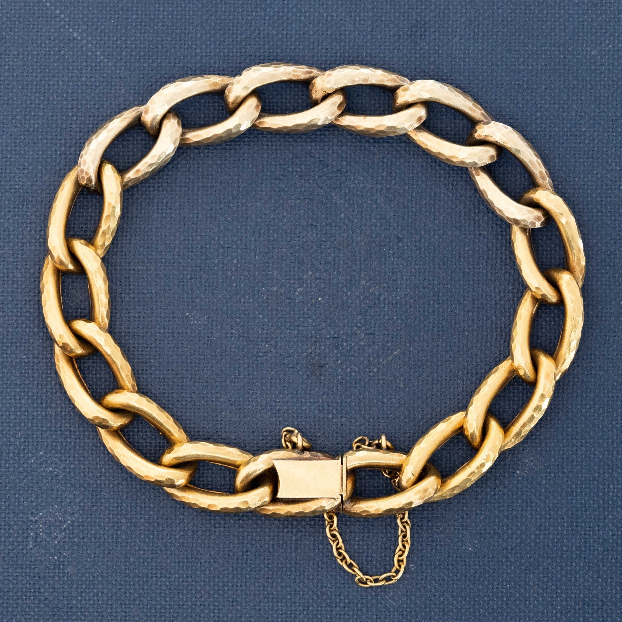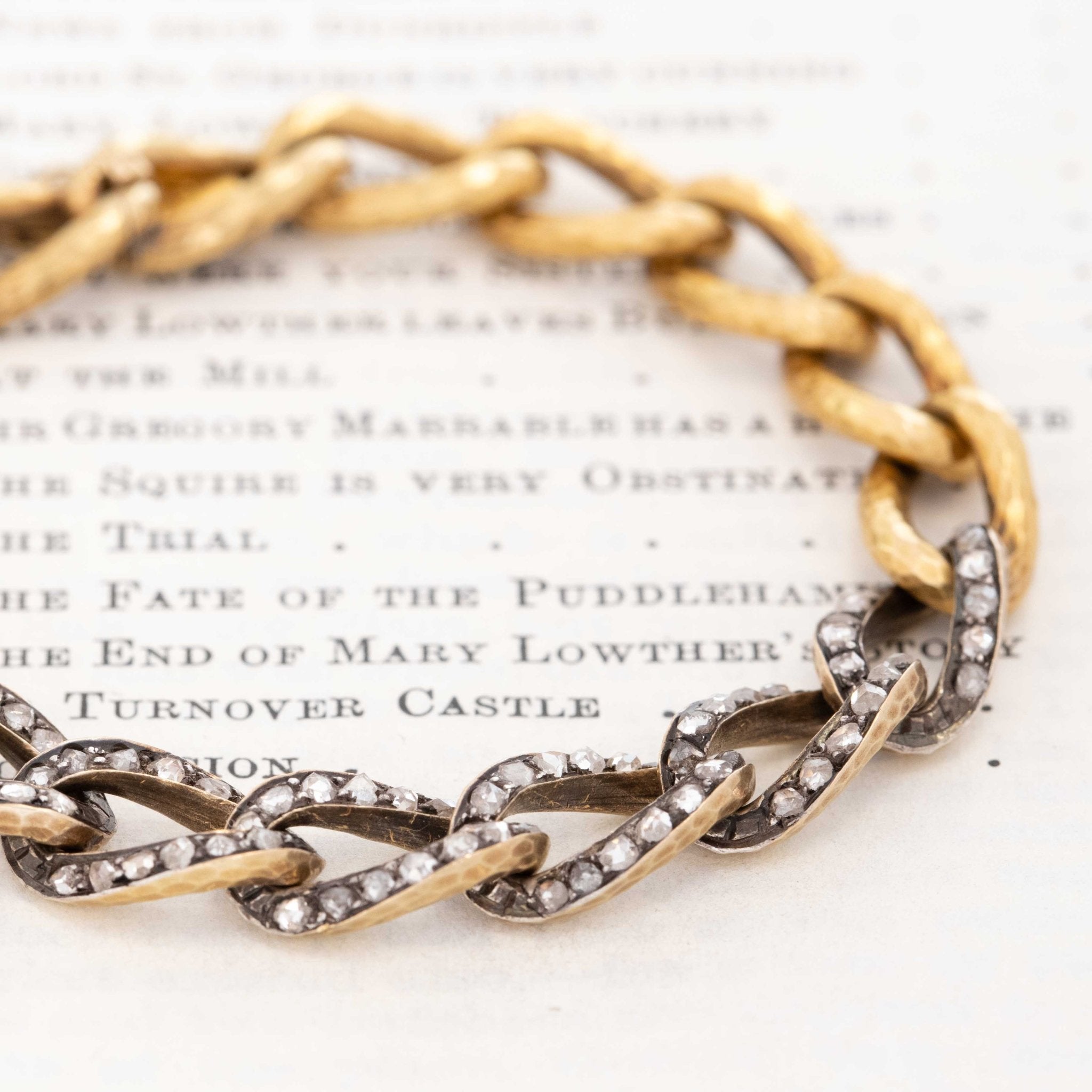 This antique French gold and diamond bracelet has everything one could want from an antique bracelet: rose cut diamonds, oxidized silver, gold links, and that great hammered finish is simply icing on the cake! Best fit for a 6” wrist, the diamonds sit across the top of the wrist and pack quite the punch, as those rose cuts are closed back.