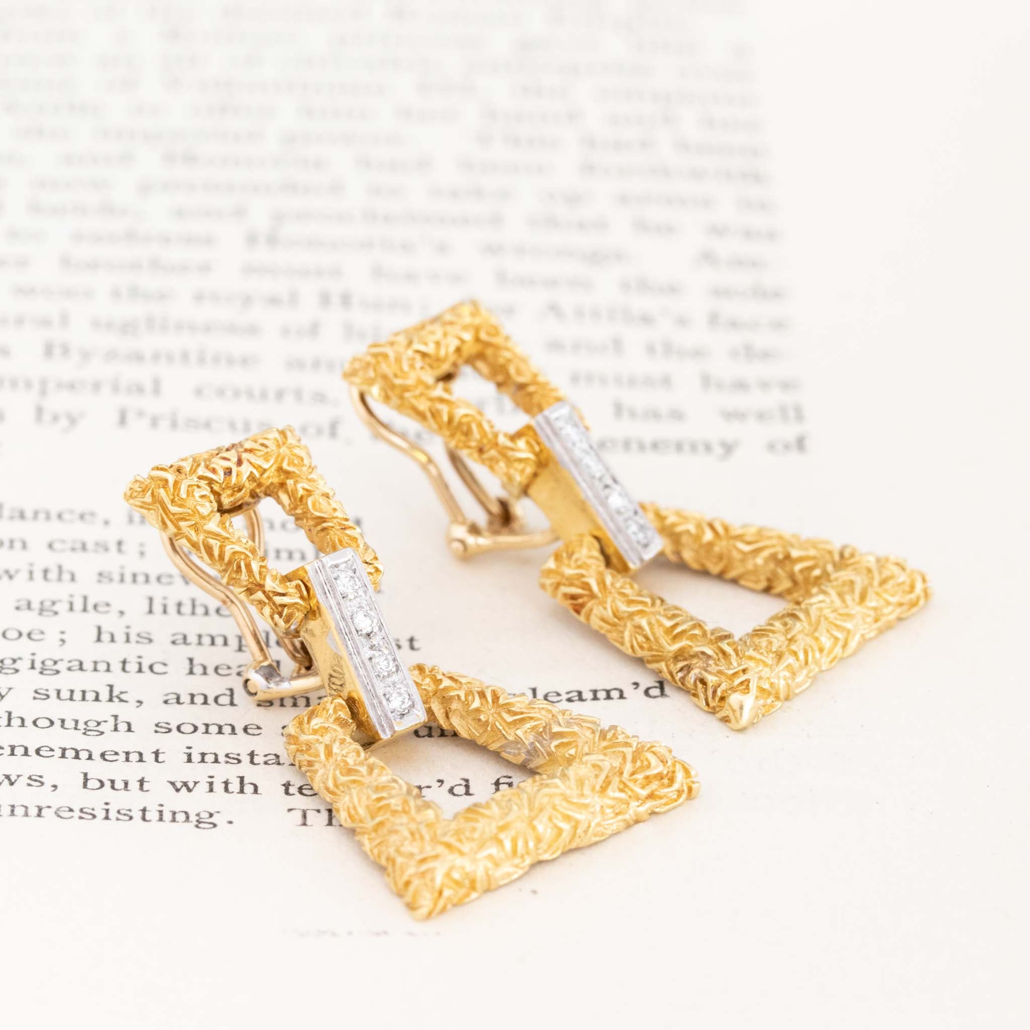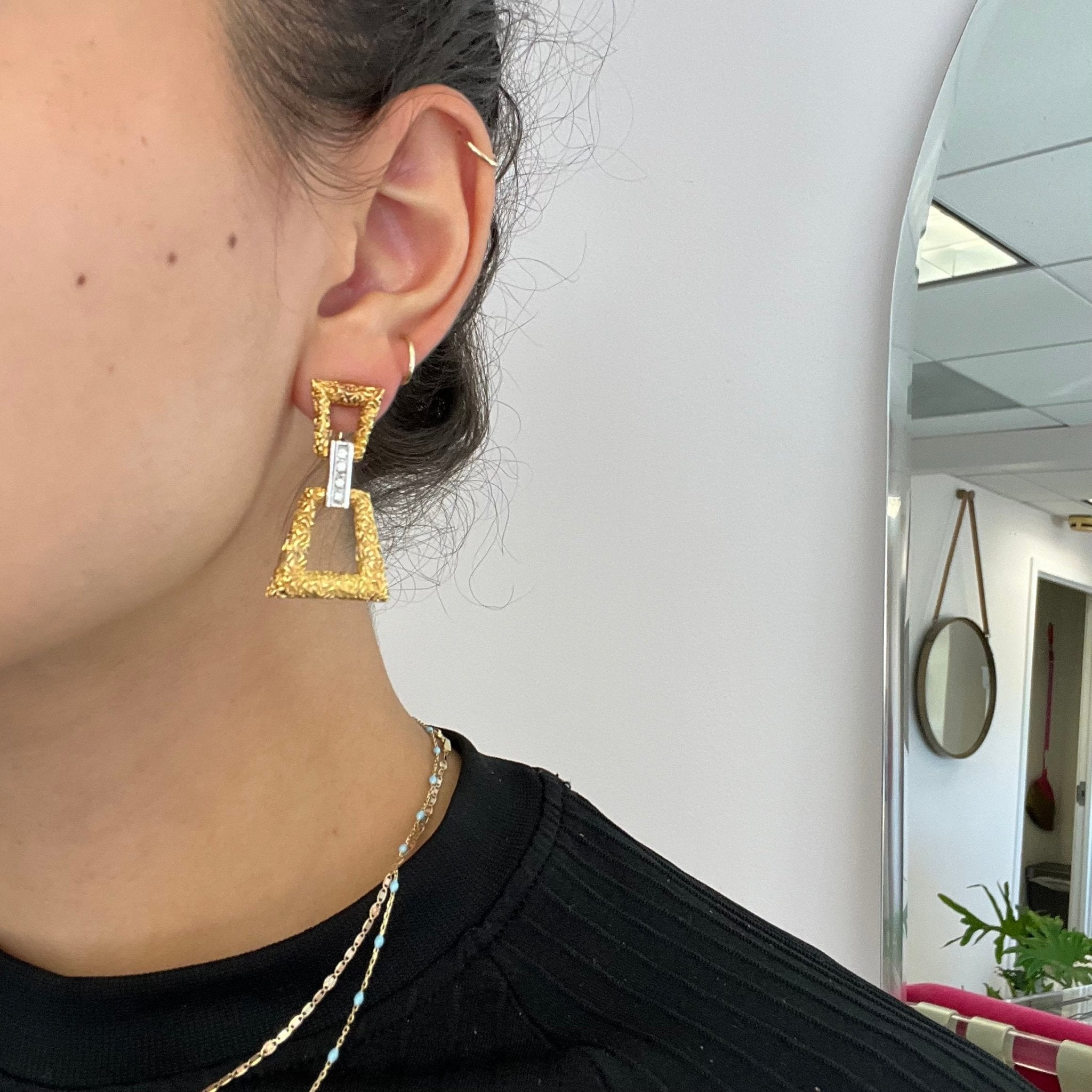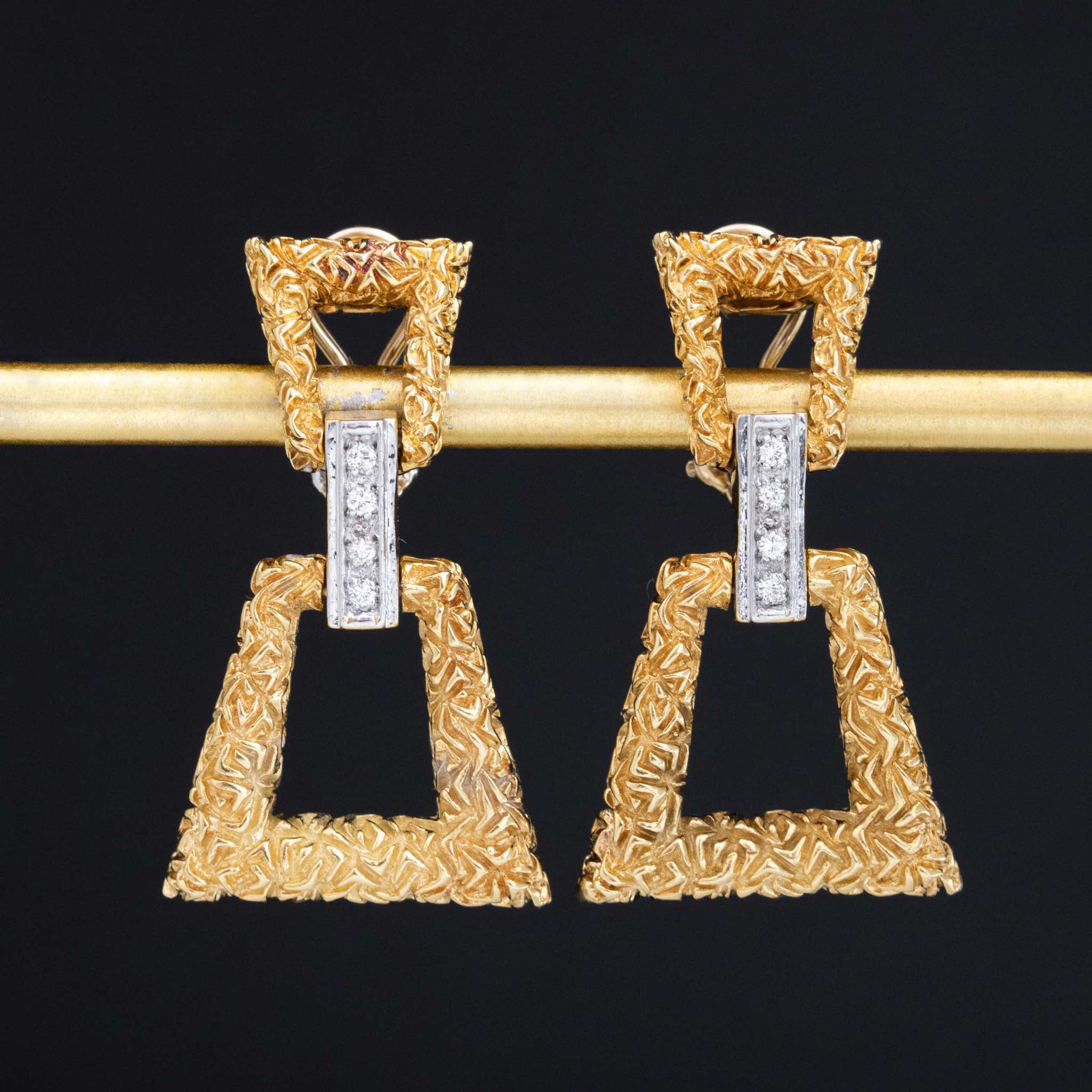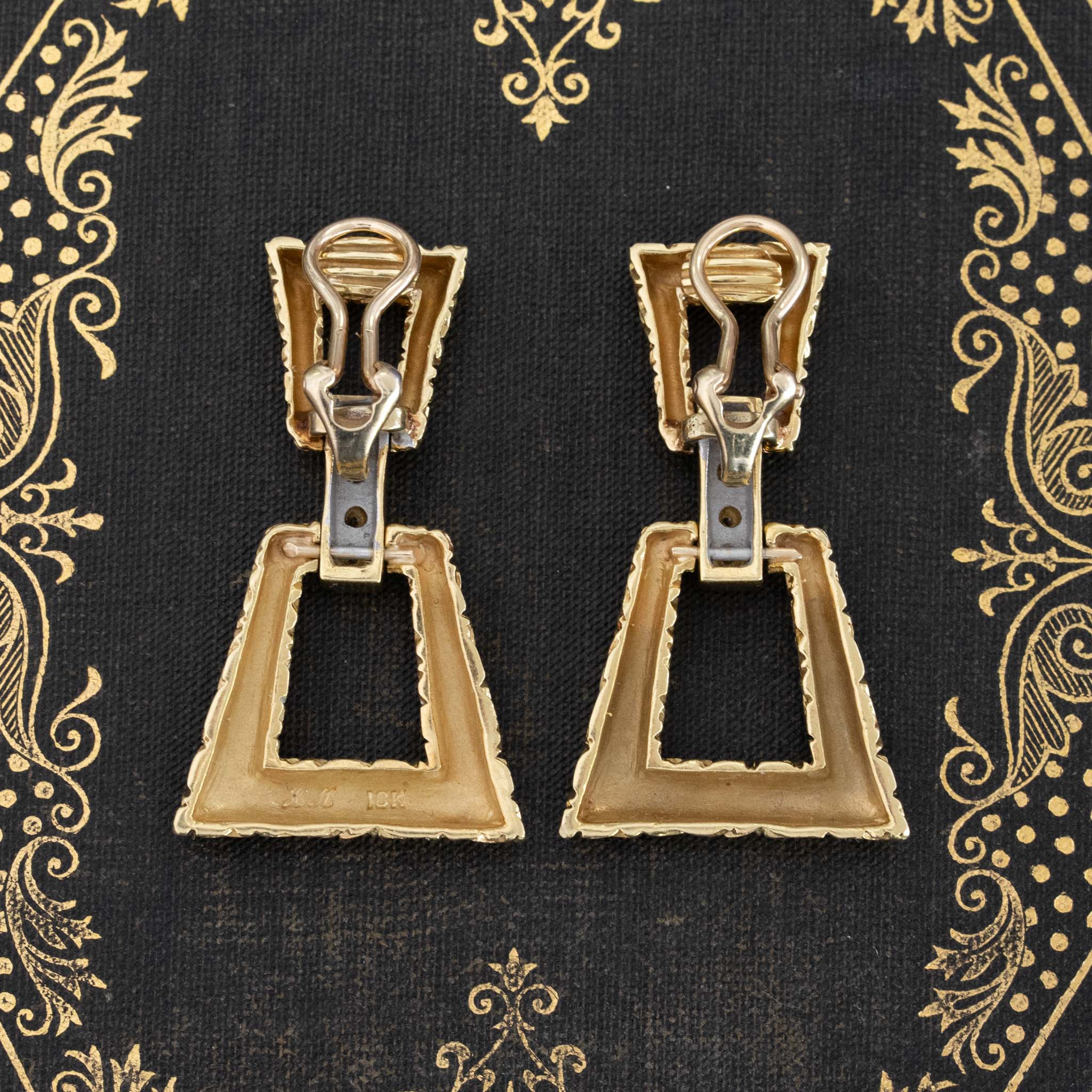 These door knockers are quite possibly the most fabulous pair to come out of your mother’s 1980’s jewelry box. Chunky, geometric trapezoid forms with deep and intricate carvings are connected with a diamond-studded bar in white gold. The result? A bold and gold earring, not for the faint of heart. Not to mention, sexy AF!