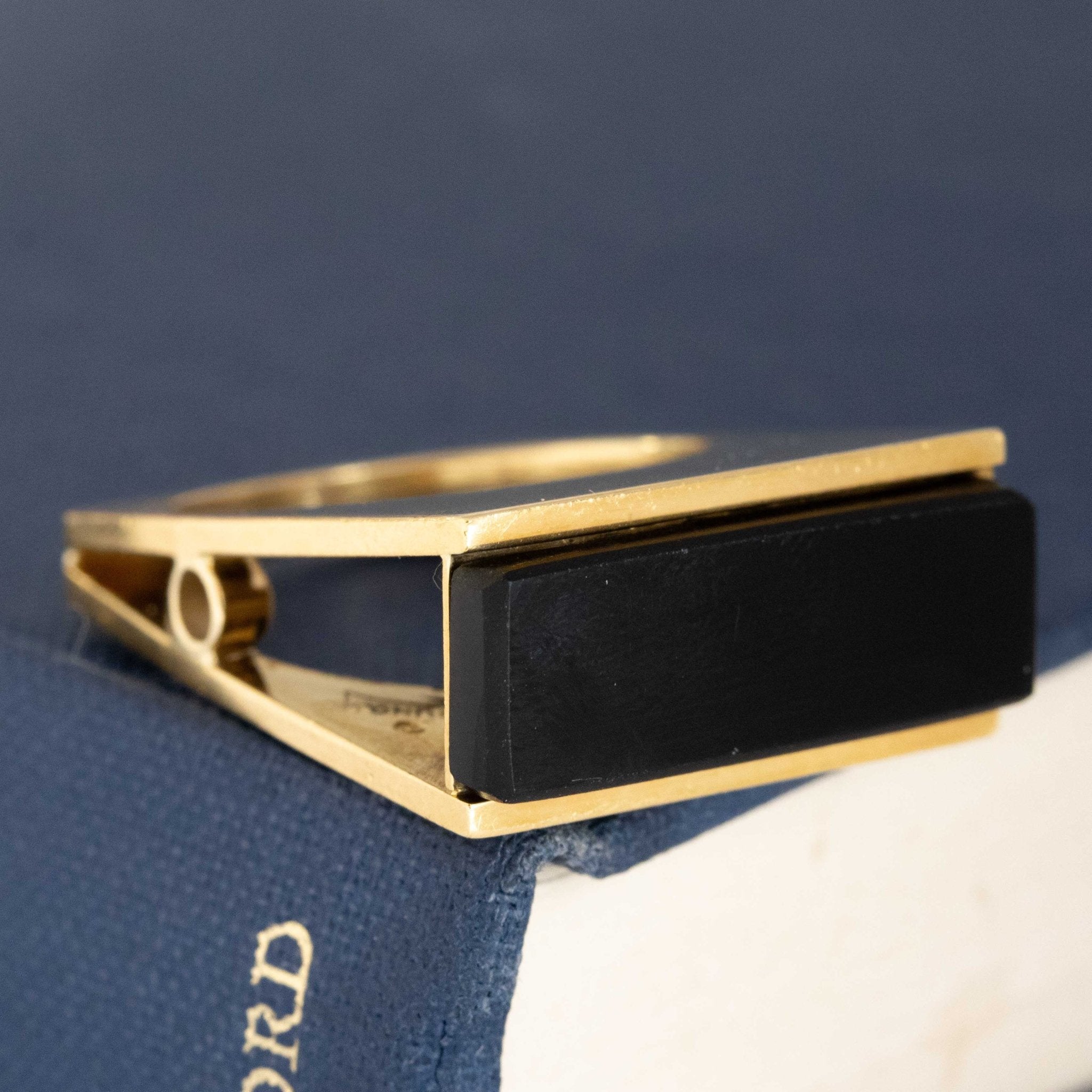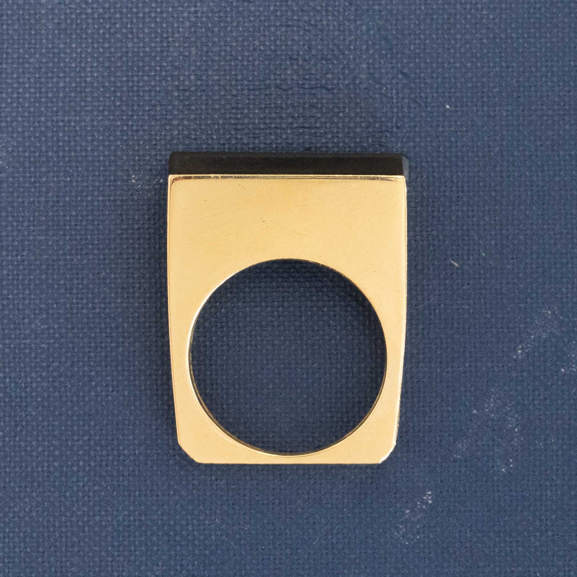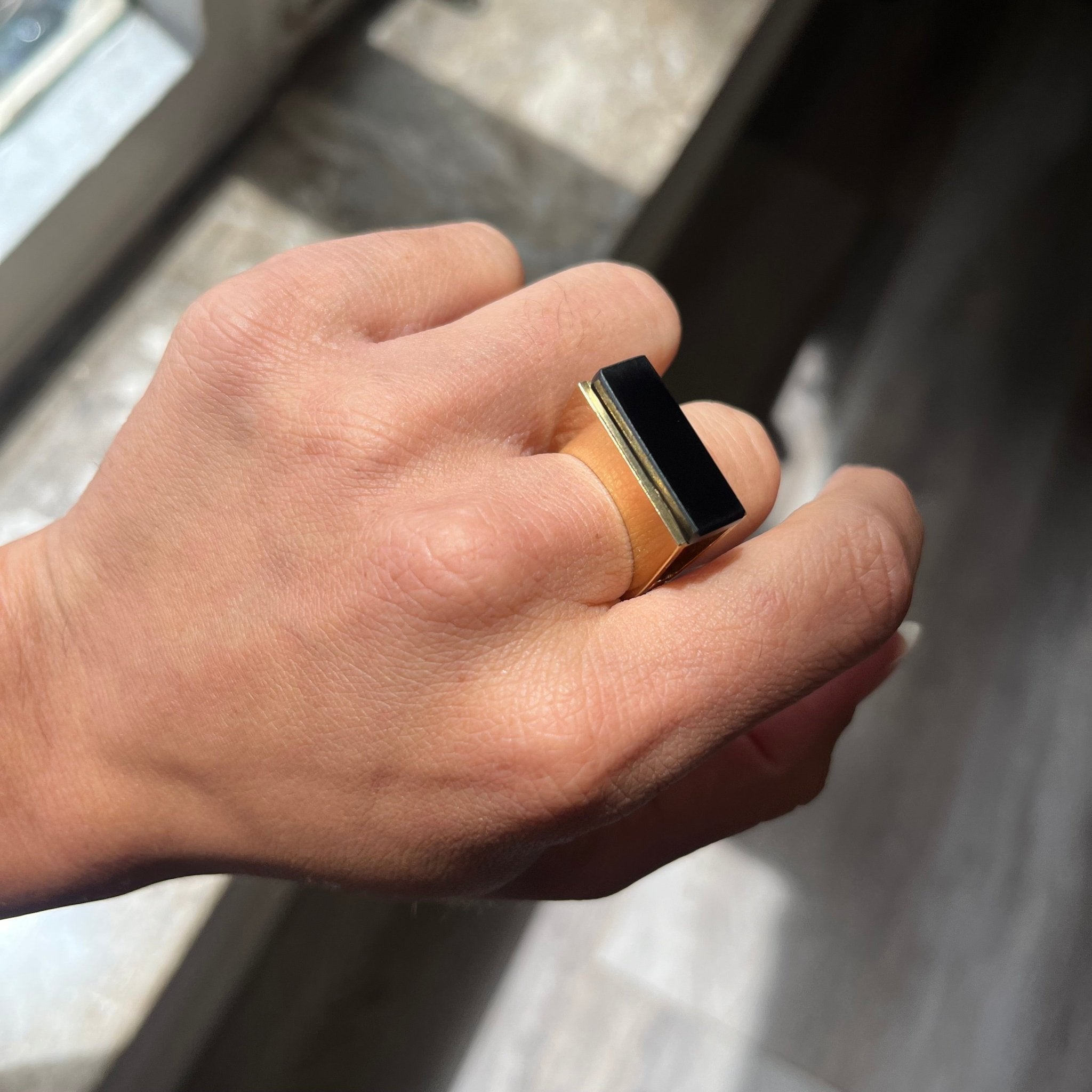 This onyx ring is geometric and bold, with circle details at the split shank in yellow gold. We love how this one wears, packing quite the punch on the hand.