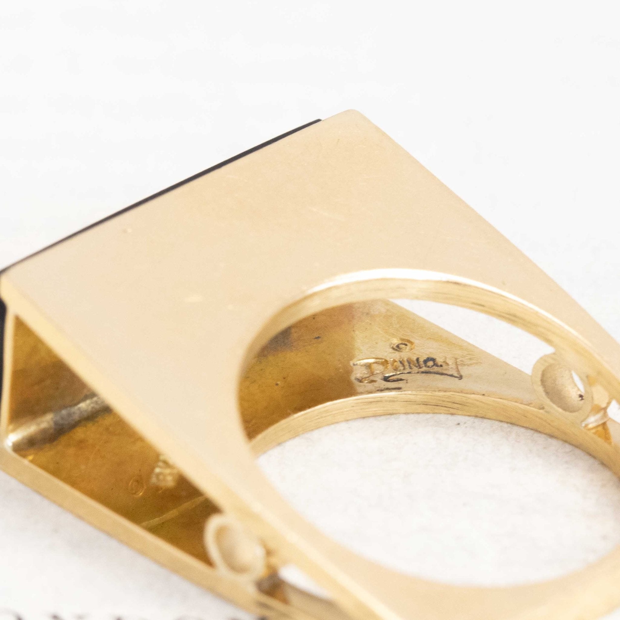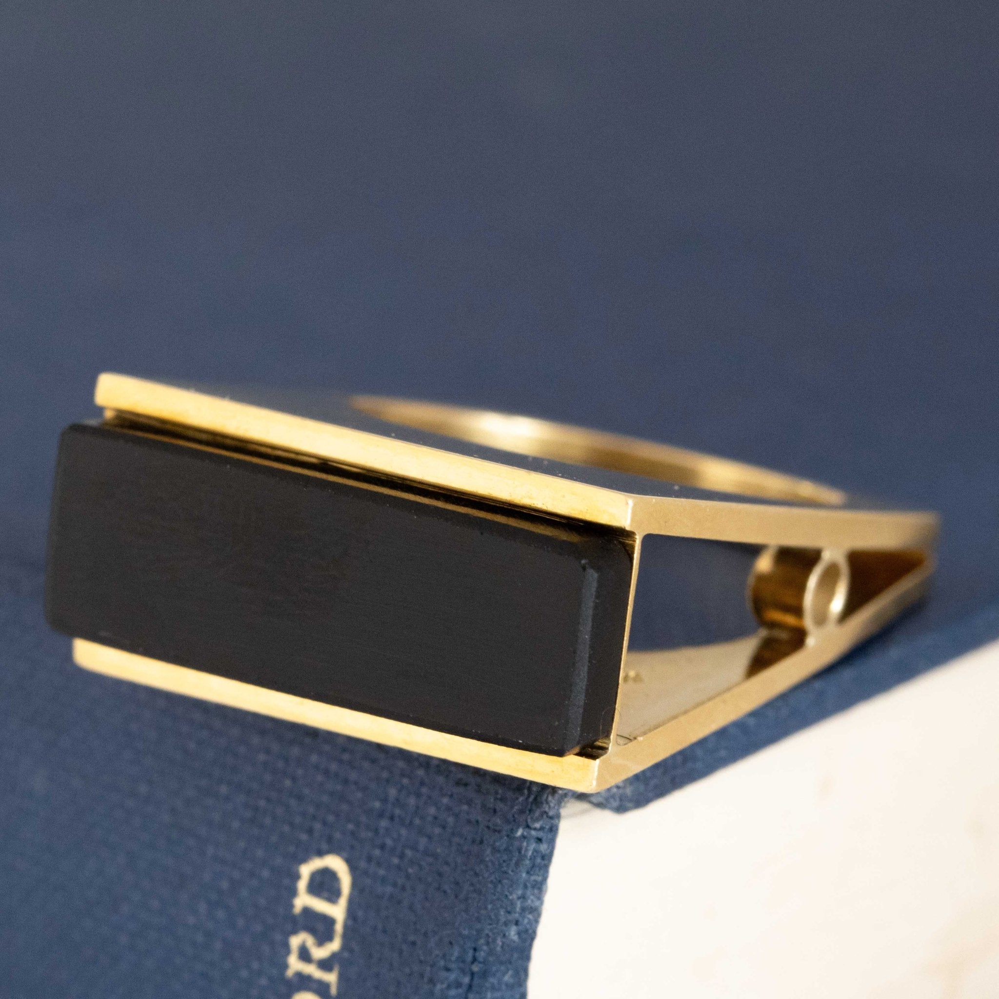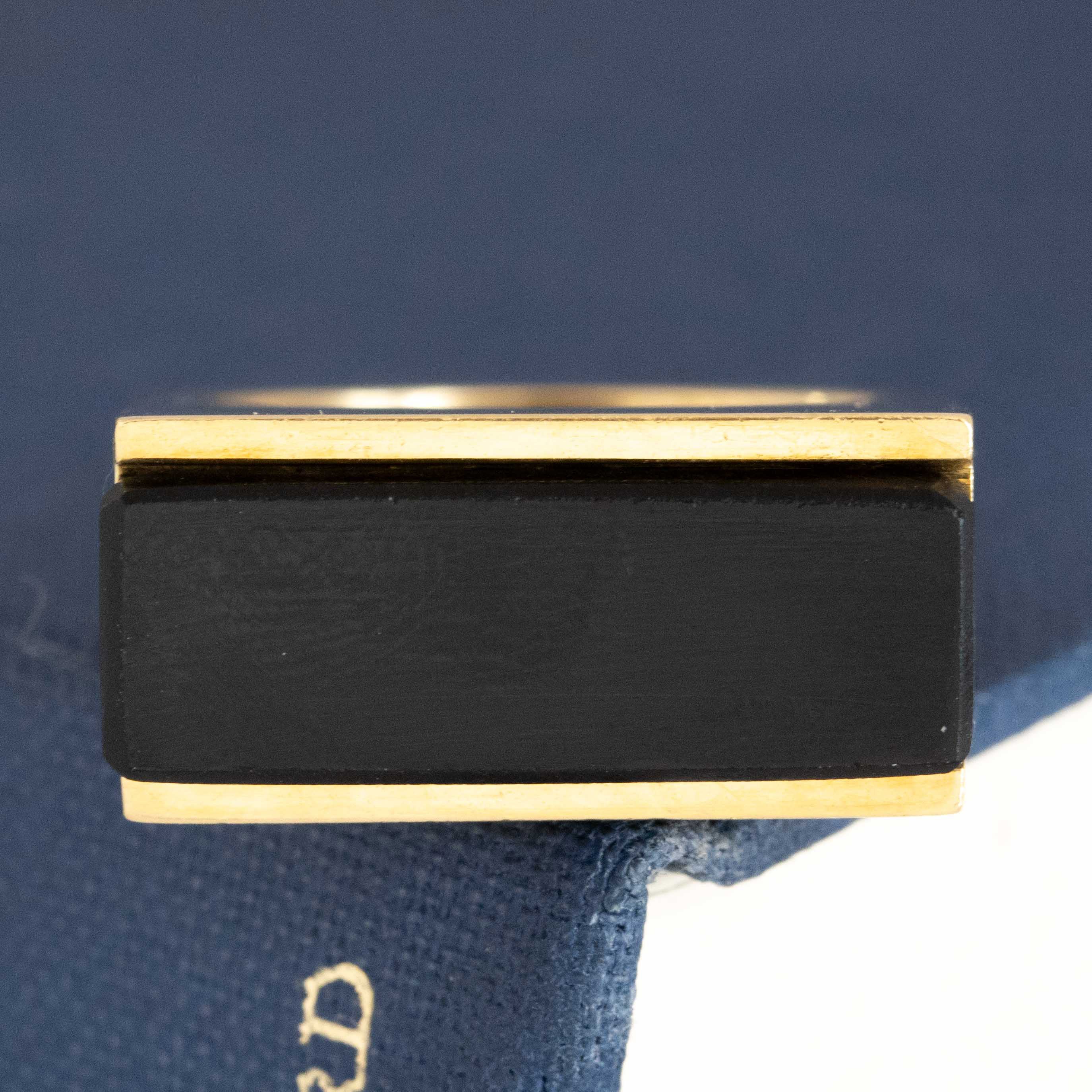 This onyx ring is geometric and bold, with circle details at the split shank in yellow gold. We love how this one wears, packing quite the punch on the hand.