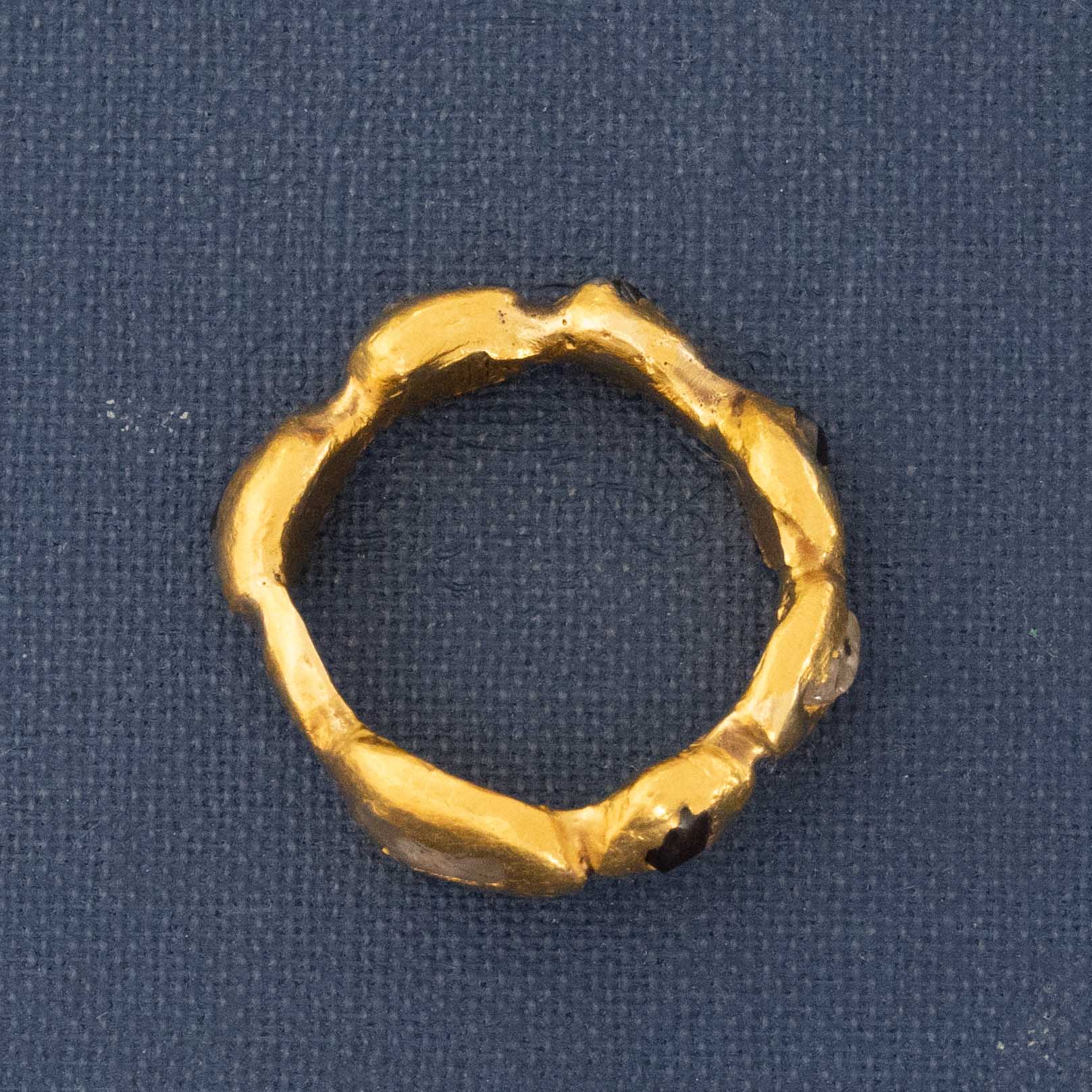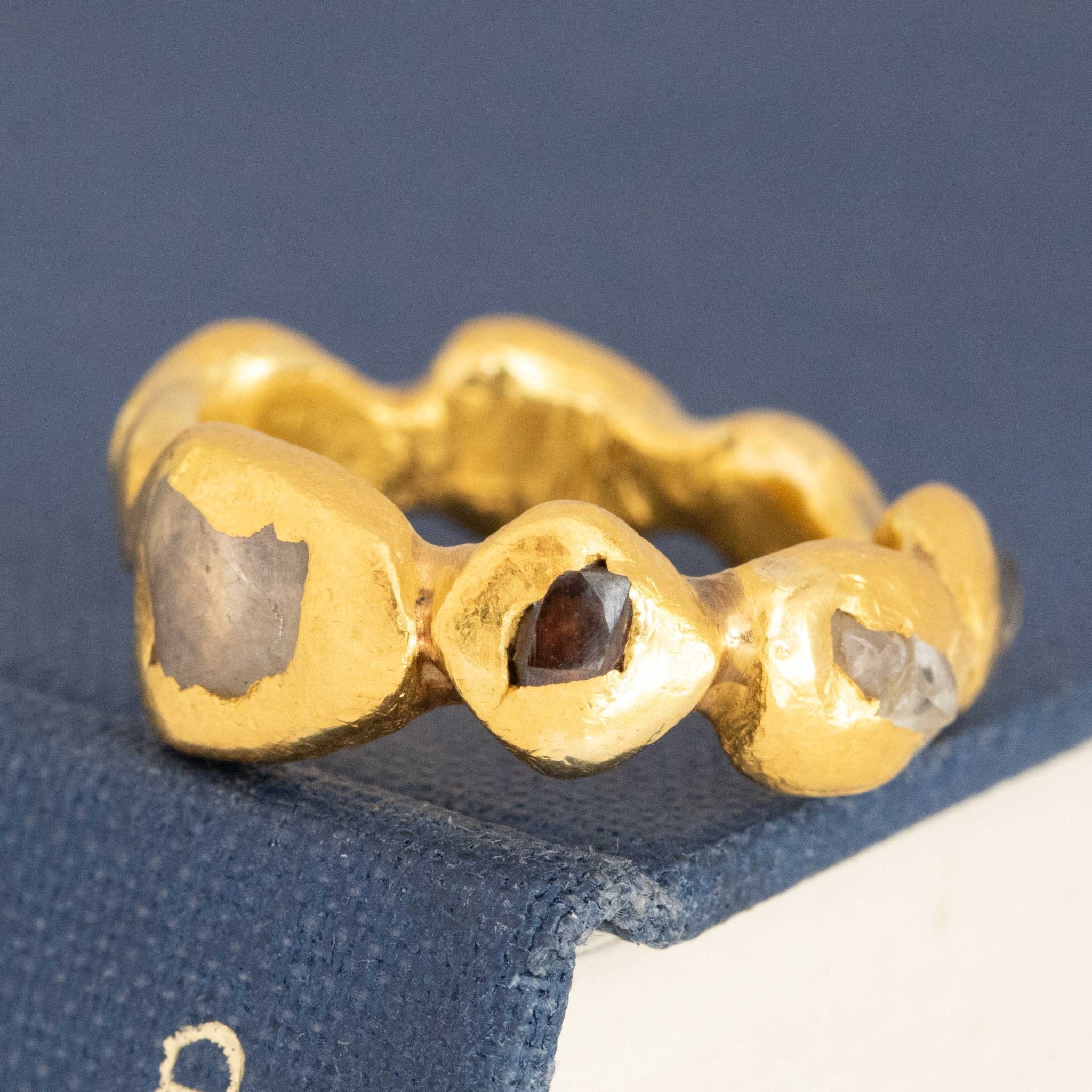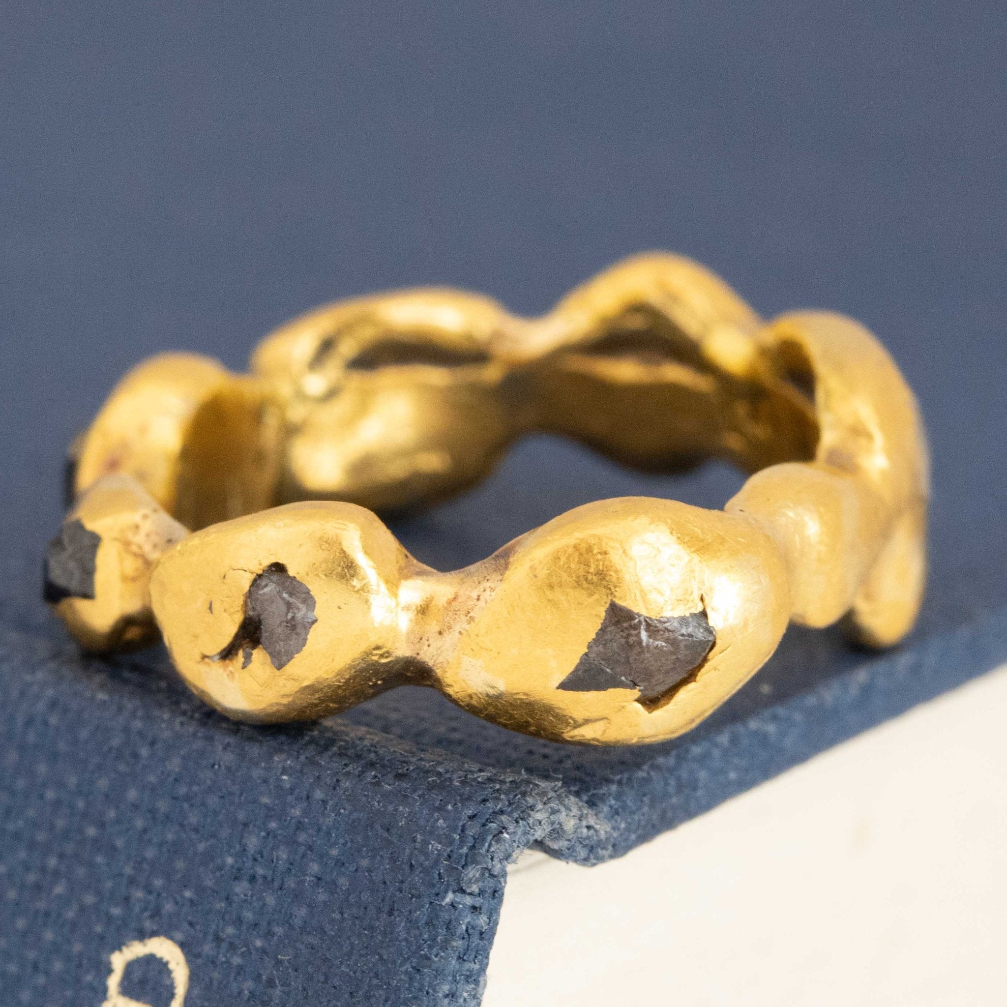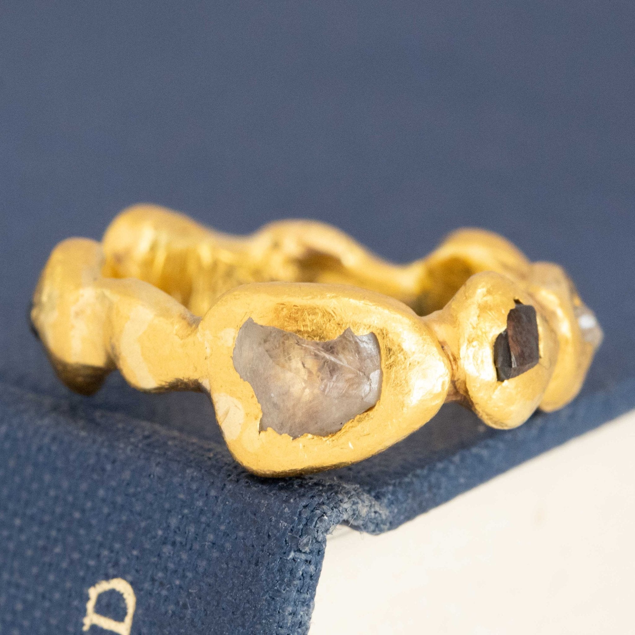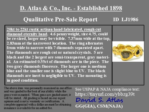 This rustic, artisanal high karat band using diamond rough is perfect for somebody who wants a piece of jewelry that is off the beaten path. The tone of the 20 and 22kt yellow gold is absolutely dreamy, not to mention the heft of the band overall, as well as the feel on the finger! We love how the rough, uncut diamonds vary in tone and size, making for something extremely unique and oh-so special. The natural colors of the diamond rough are so fascinating! 20 to