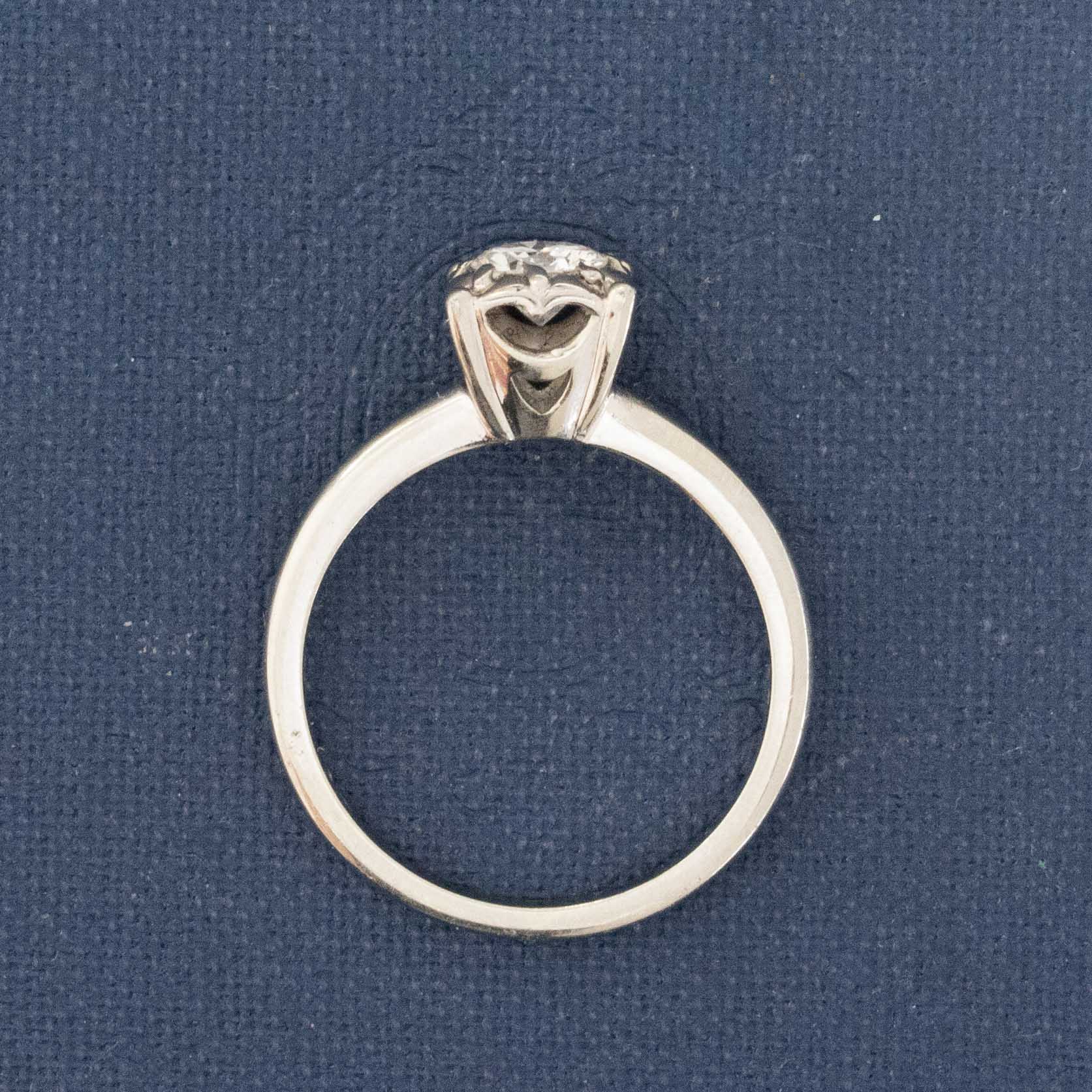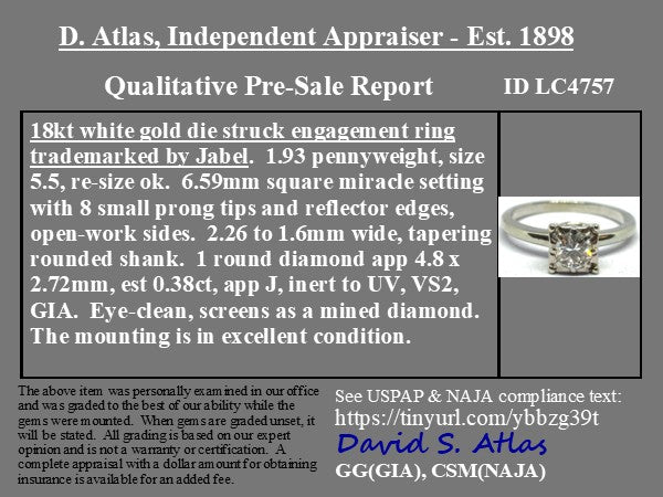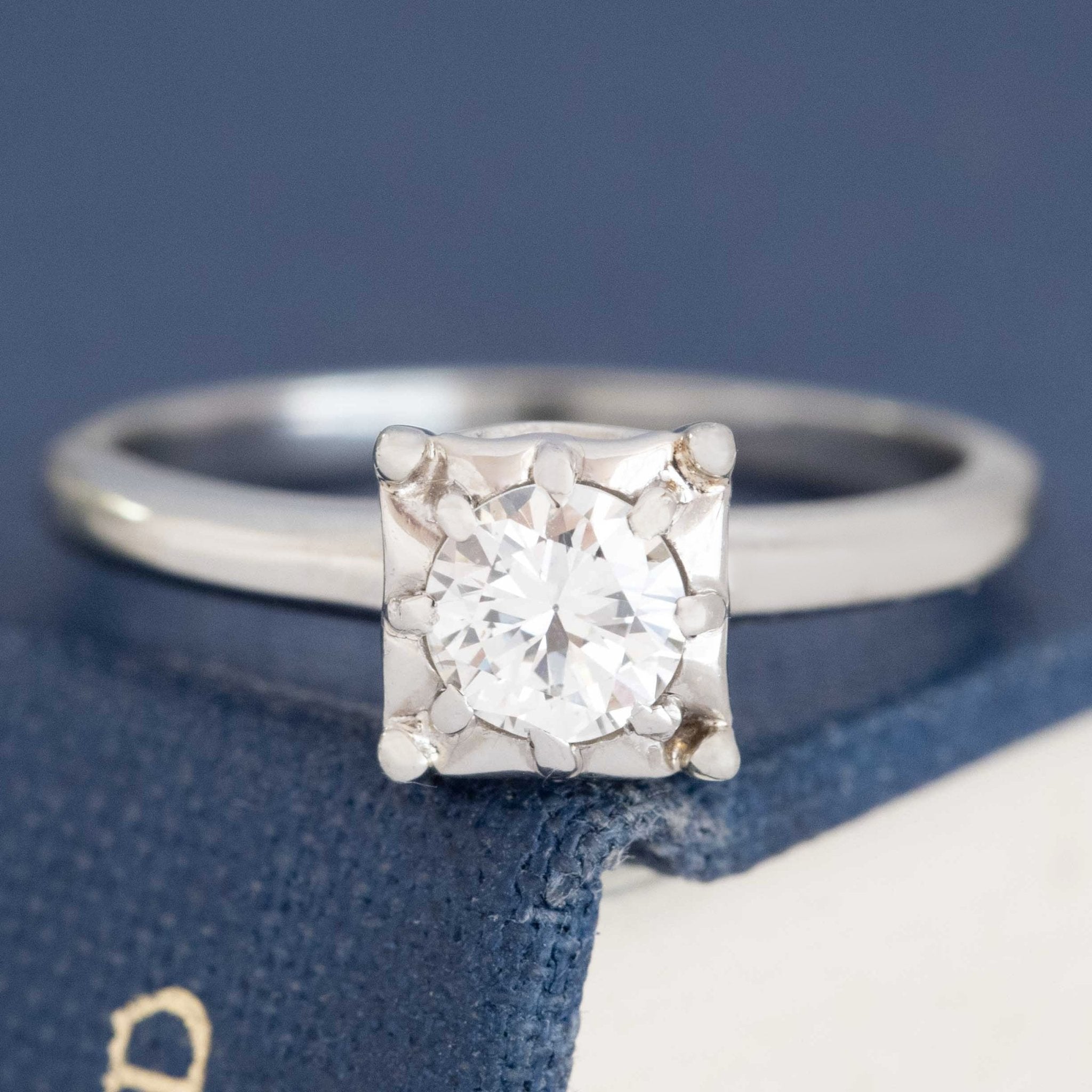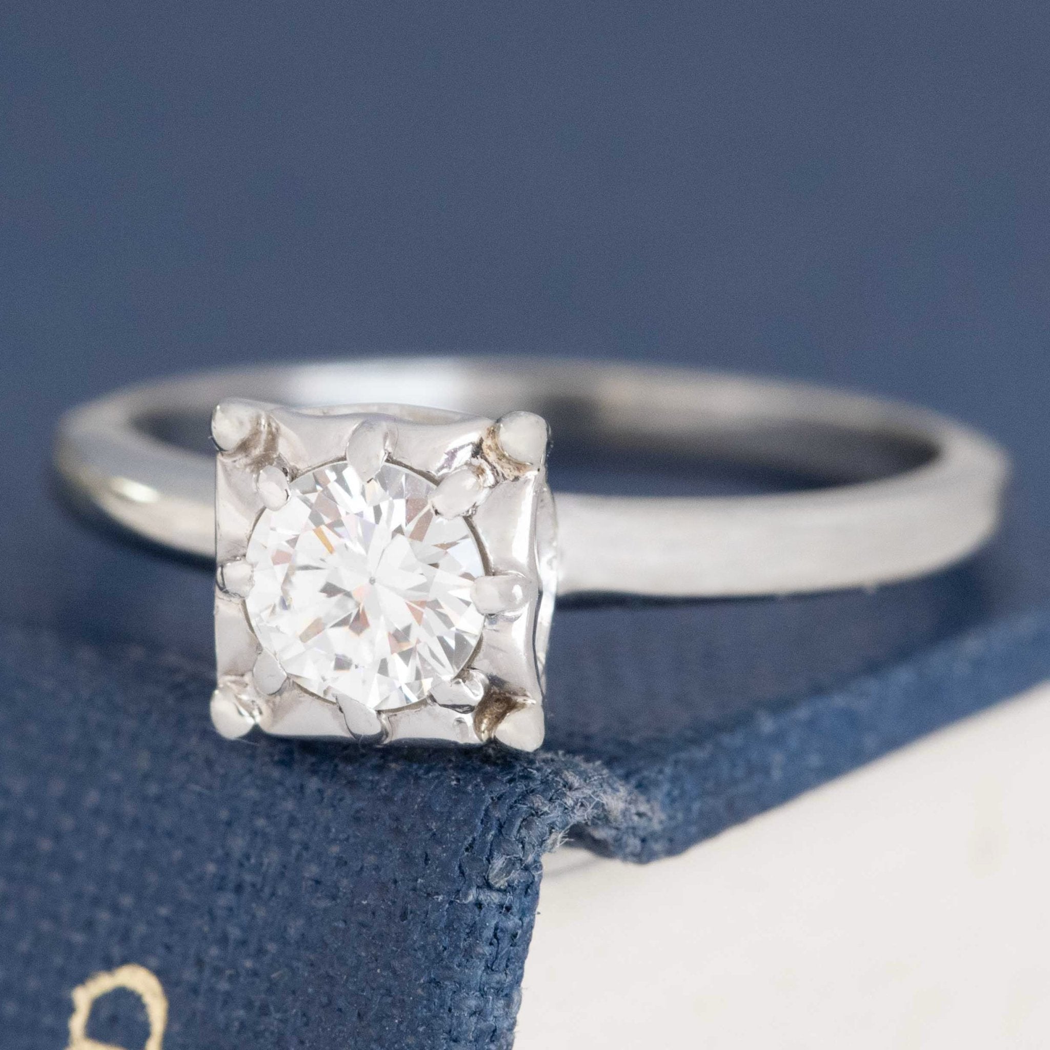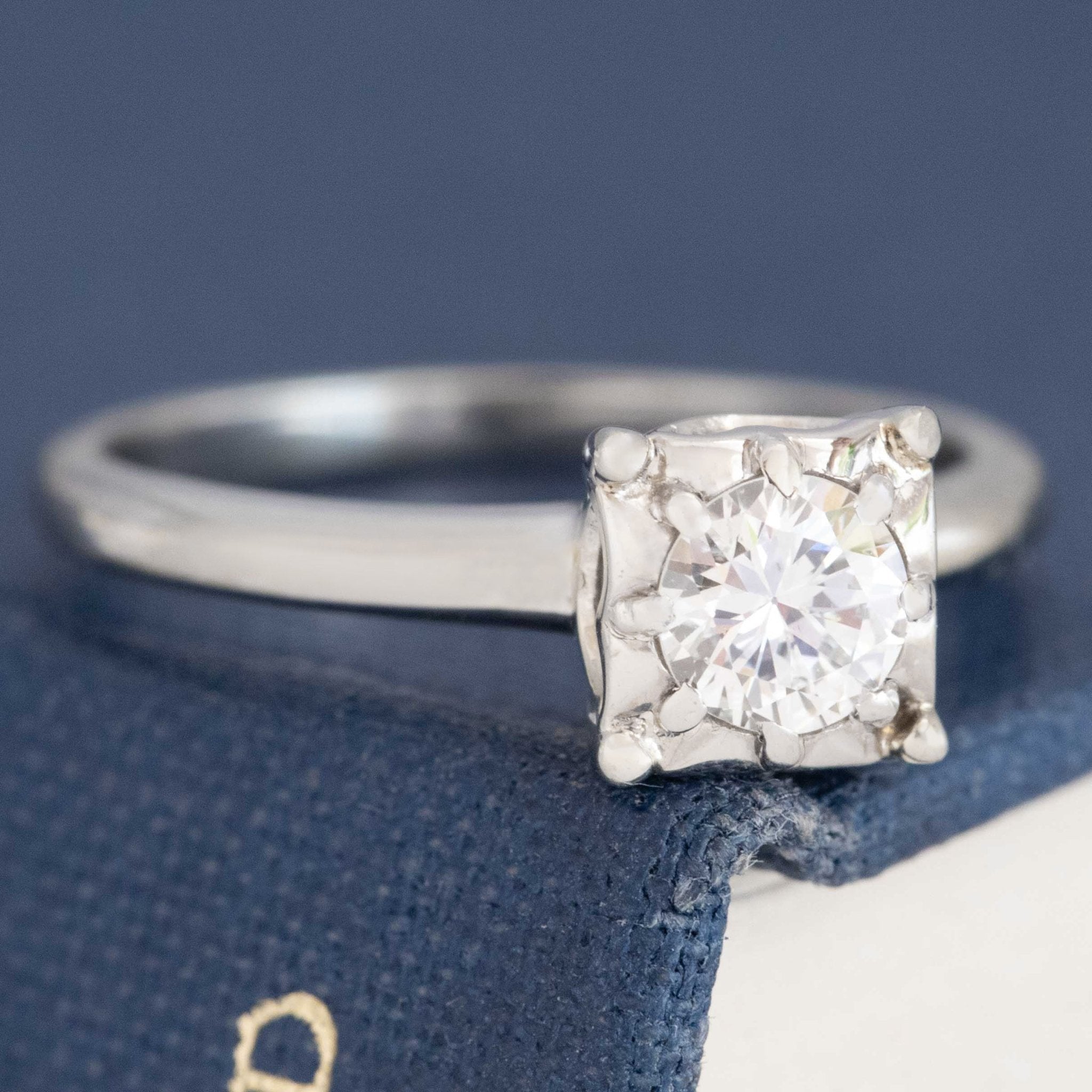 A die-struck engagement ring by the makers Jabel, a famous midcentury jewelry house known for their excellent manufacturing. This solitaire has a round diamond center sitting in a square setting with geometric prongs that offer the perfect amount of contrast and detail. She sits on a slightly tapered shank and has tons of old school charm.
