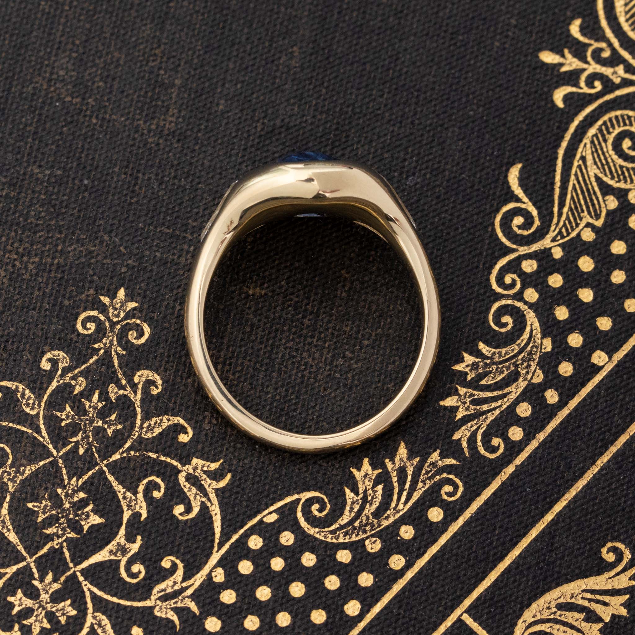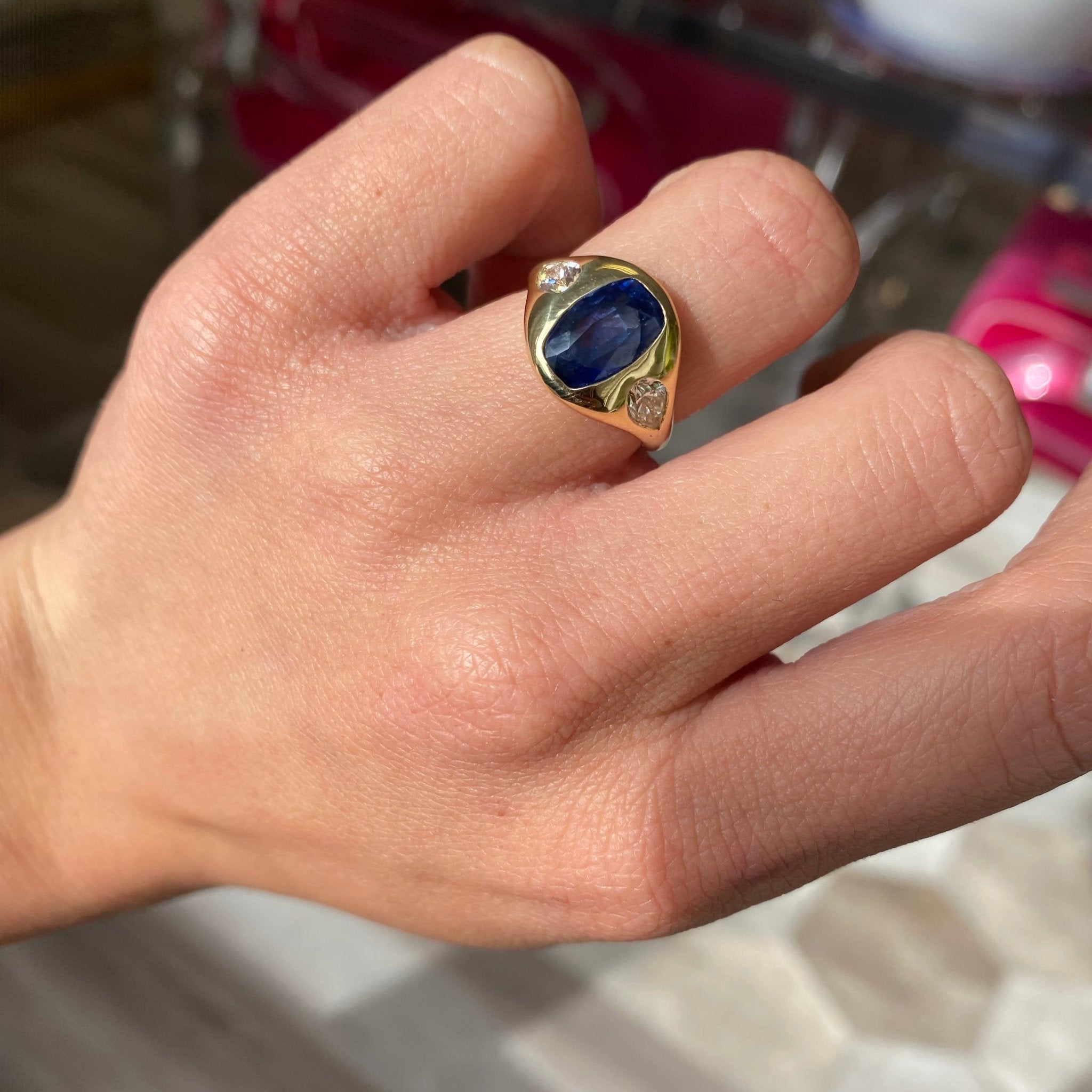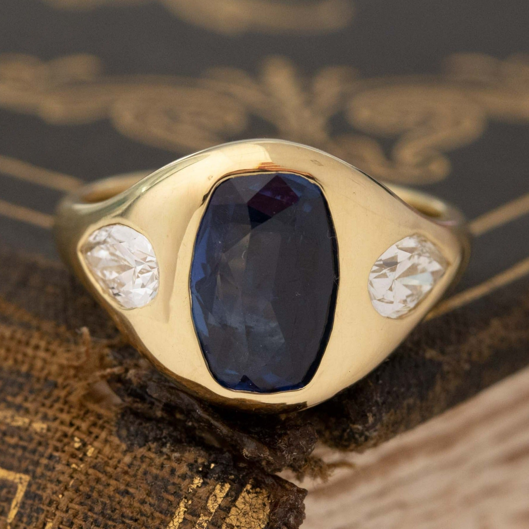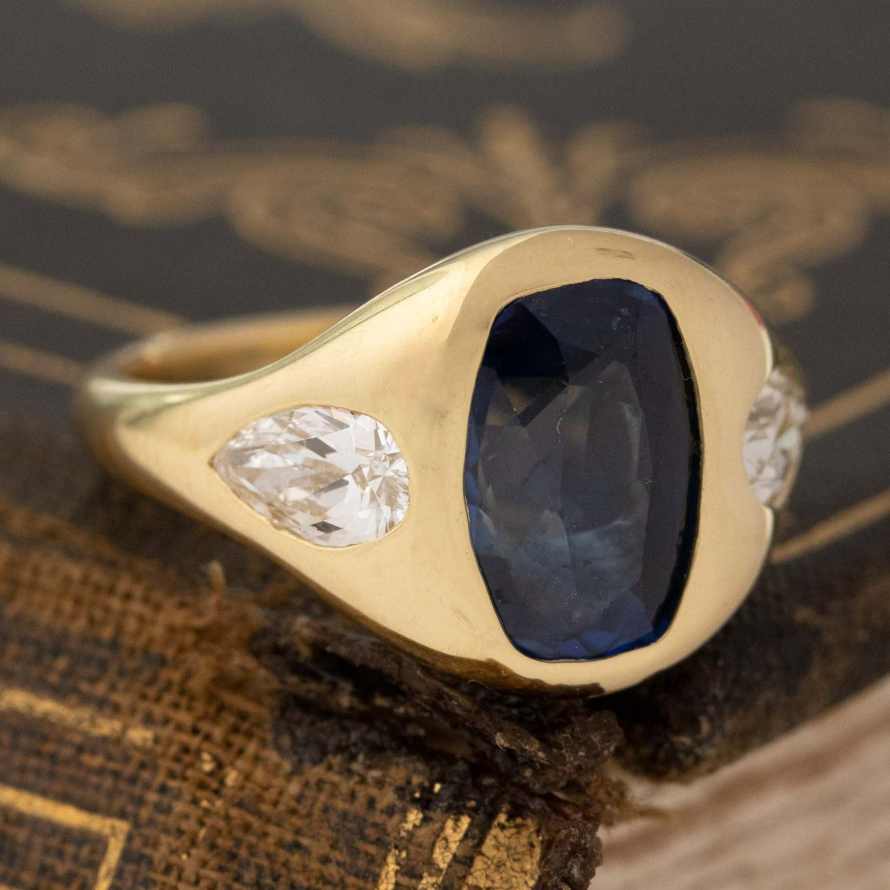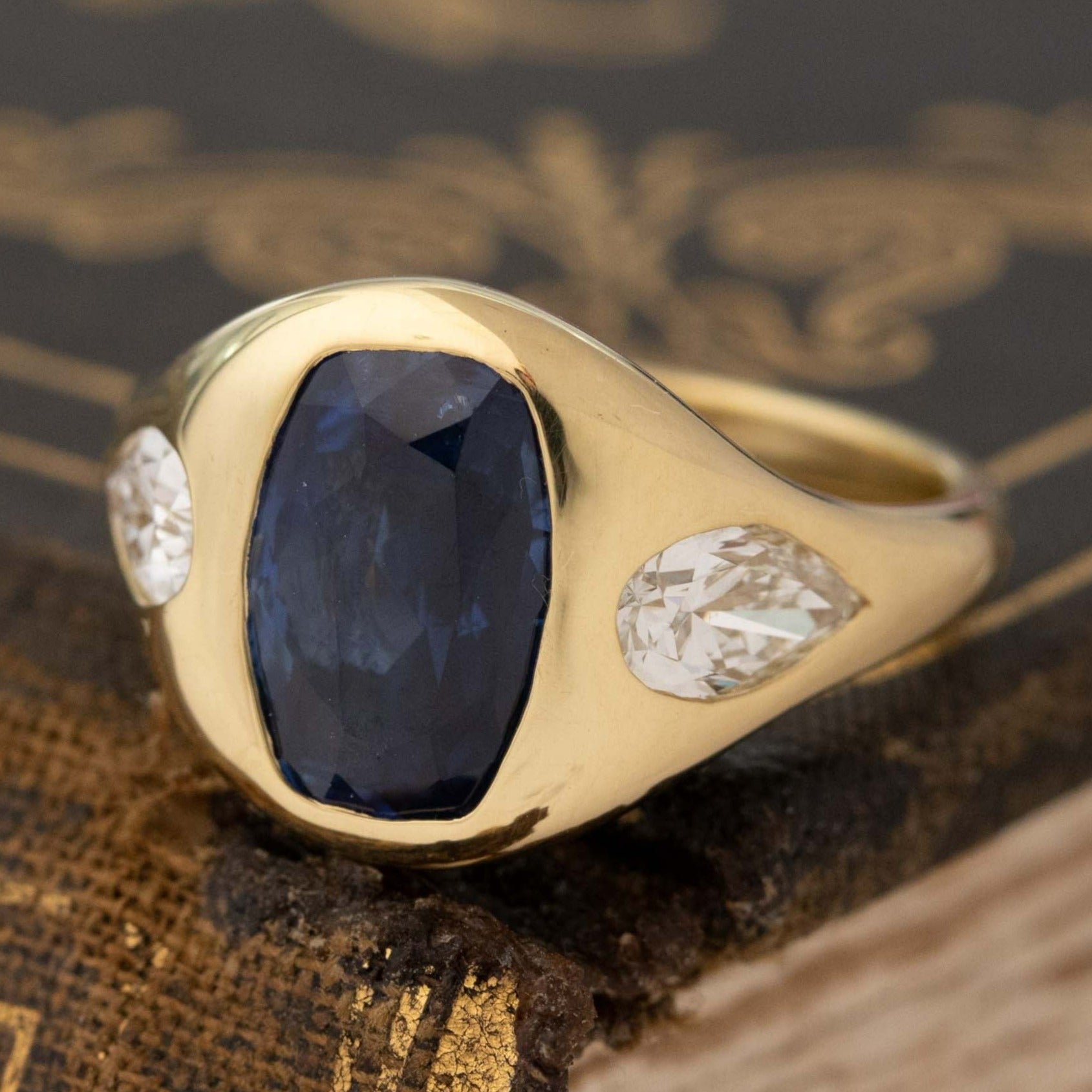 A ring that combines many design elements we love - a gorgeous cushion shaped Burma no-heat sapphire is flanked by 2 vintage pear-shaped diamonds in rich 18kt yellow gold. Low set on the finger, the ring glides on like butter and somehow feels powerful! The sapphire is a deep blue color, lively and rich.