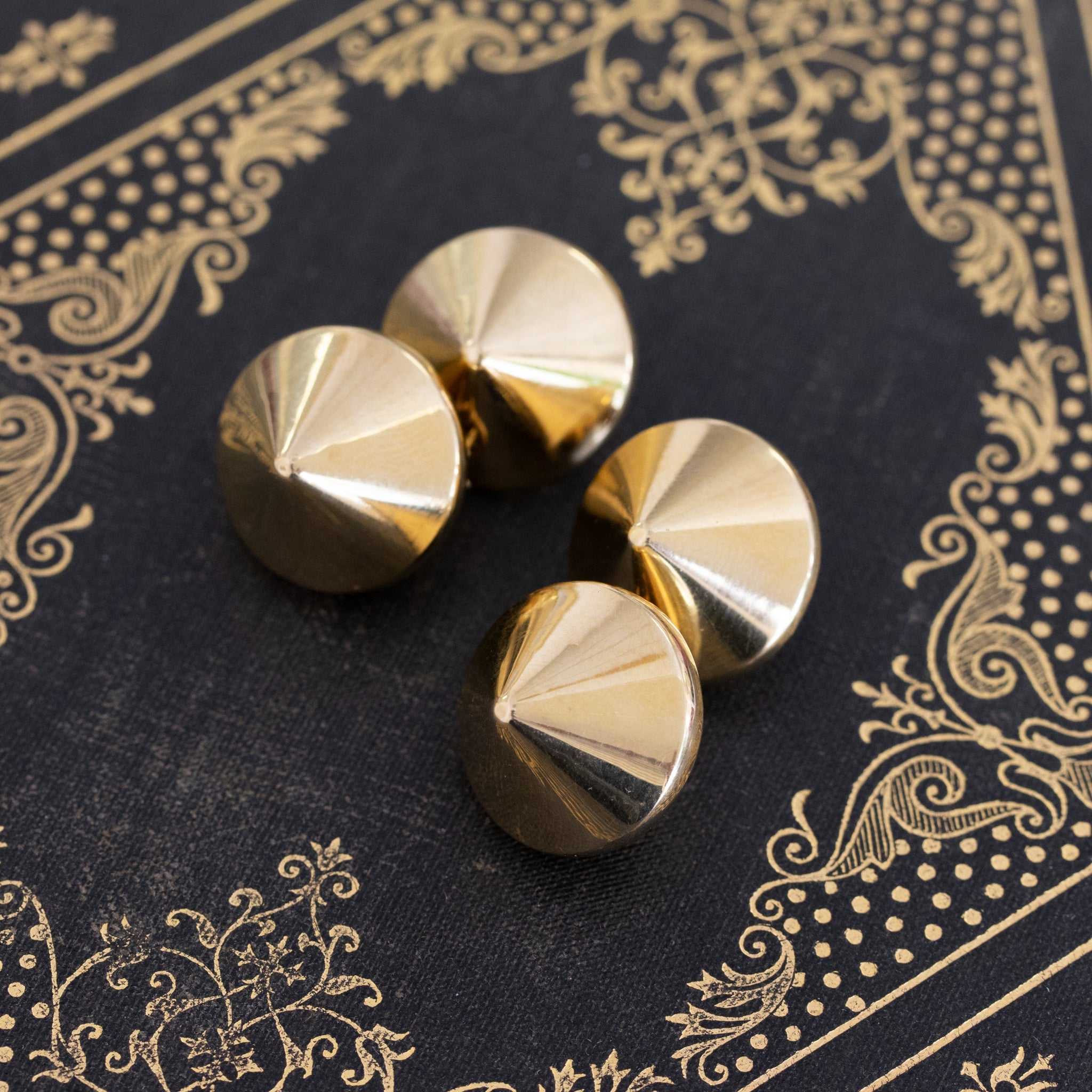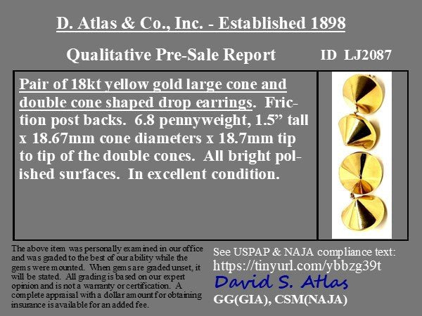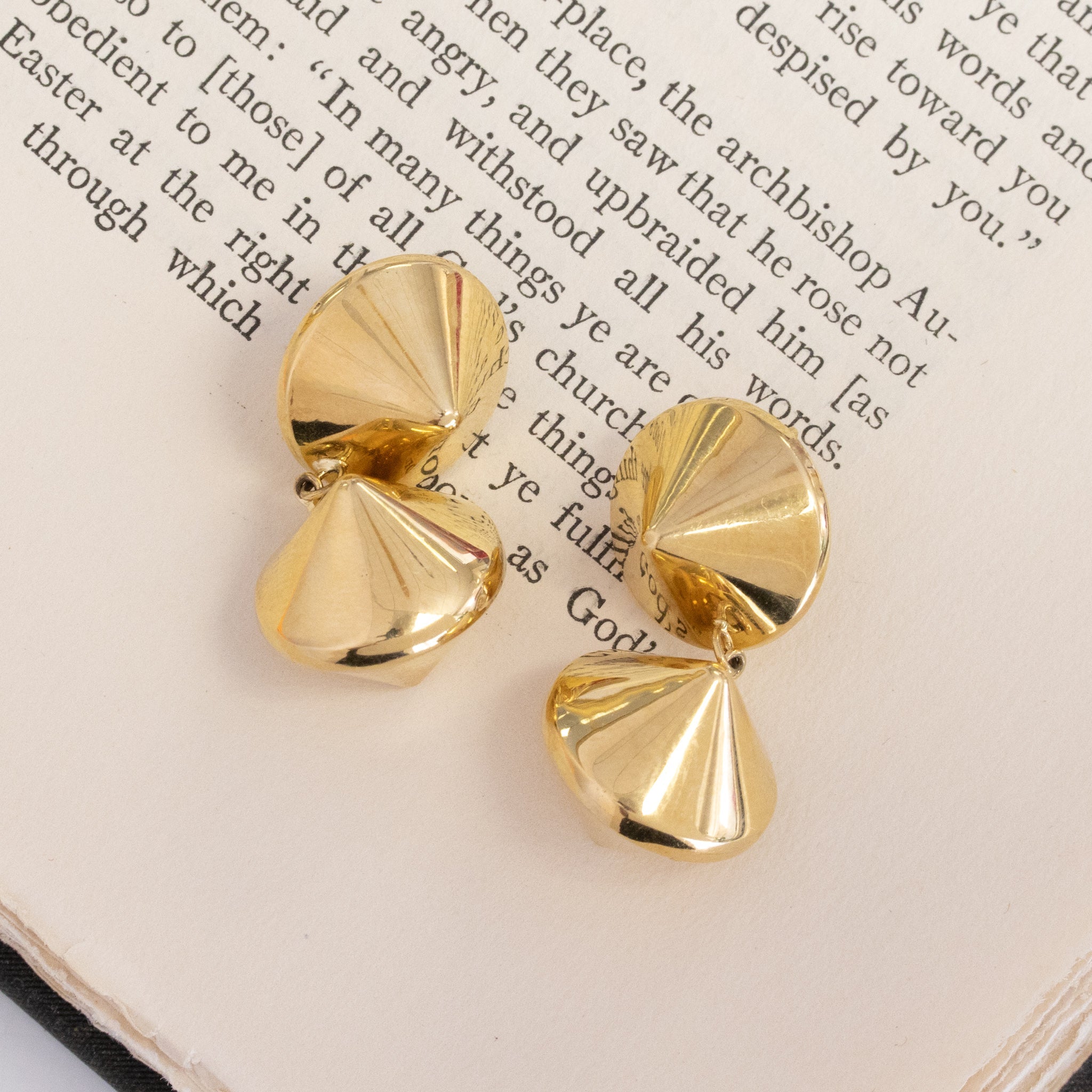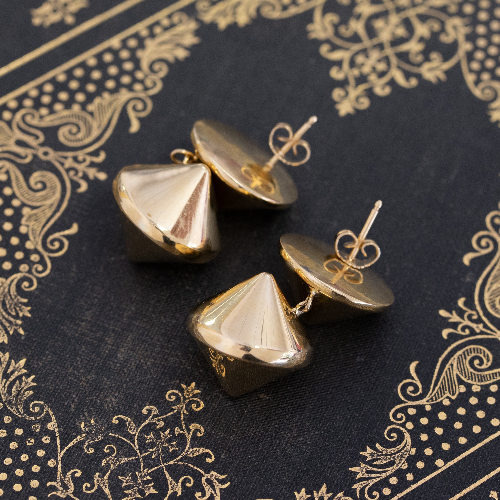 The spherical double-cone drop earrings are the bold and gold look you never knew you needed. The spherical forms are hollow for comfort on the lobe while serving chunky gold shine! We suspect this pair to come from the 1960’s/70’s, as they’ve got funk and fluidity to them that screams mid-century mod. They articulate on the ear in the most fun way and are absolutely glamorous with a bright polished surface.