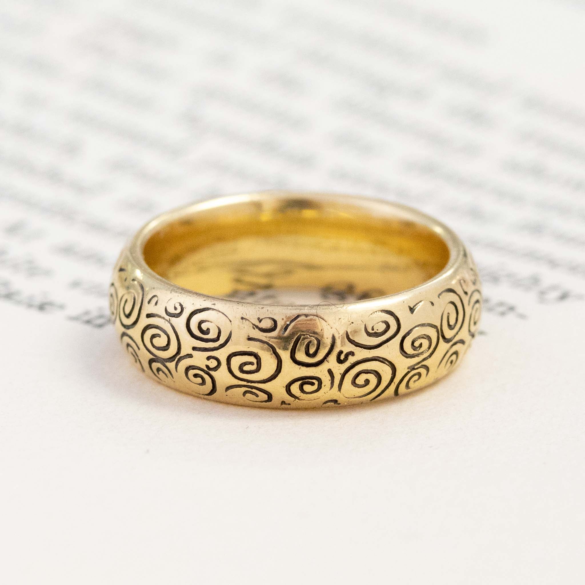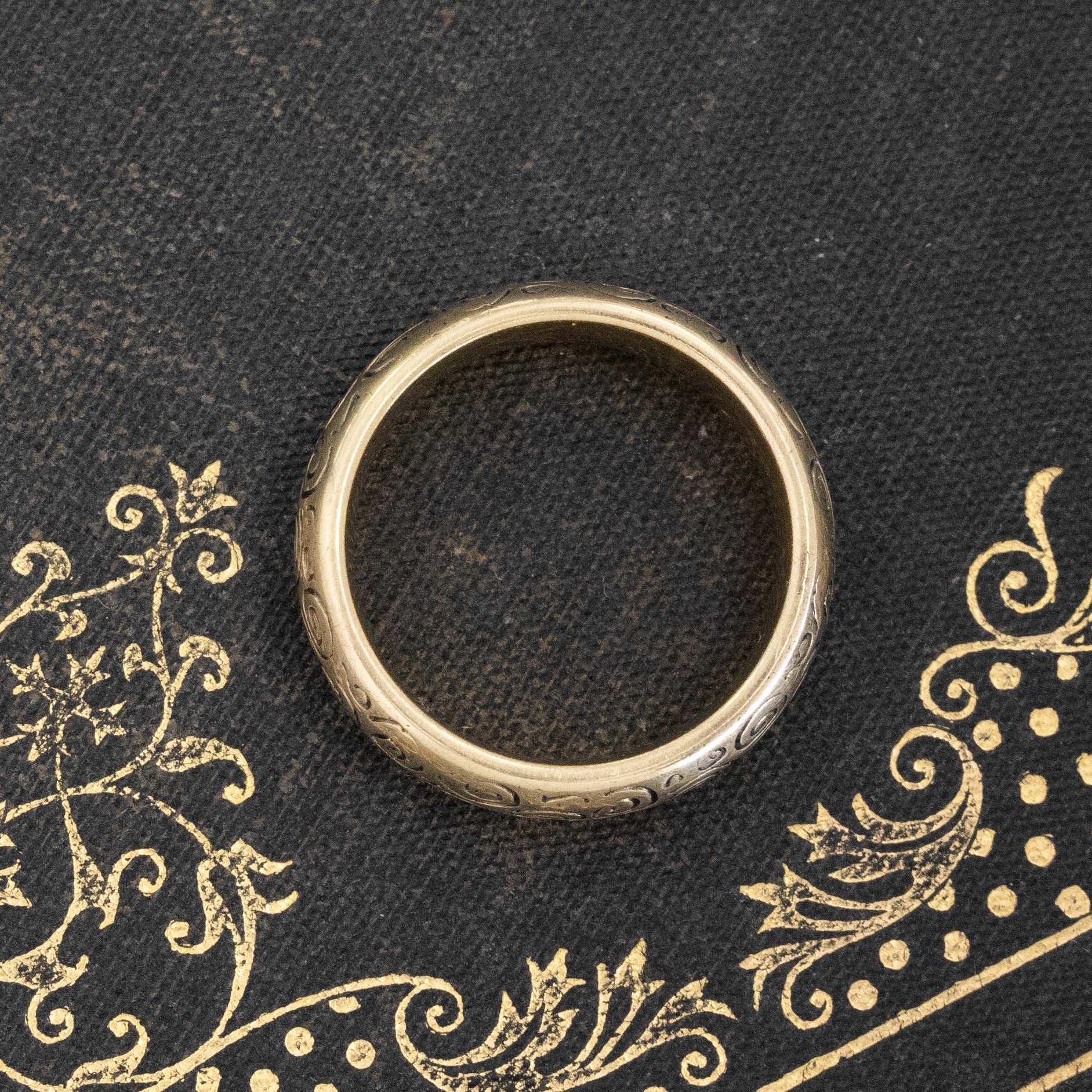 This charming yellow gold band has plenty of character and heft - we’re big fans! An eclectic swirl pattern goes around the entire half-round band, gliding onto one’s fingers in the most smooth, delicious way. We’d love to see this band stacked with the rest of your pieces, as she adds some fun to any jewelry suite.