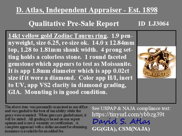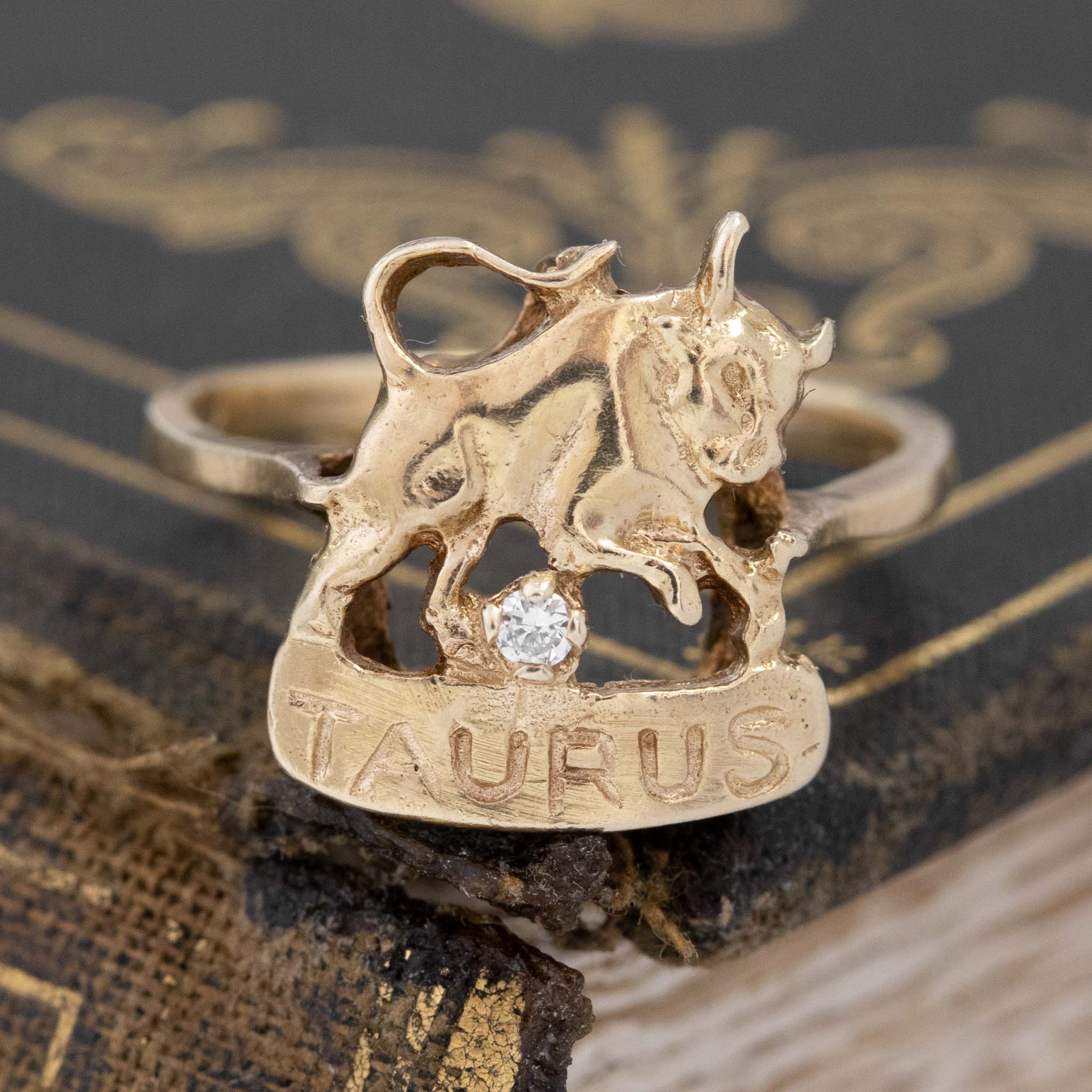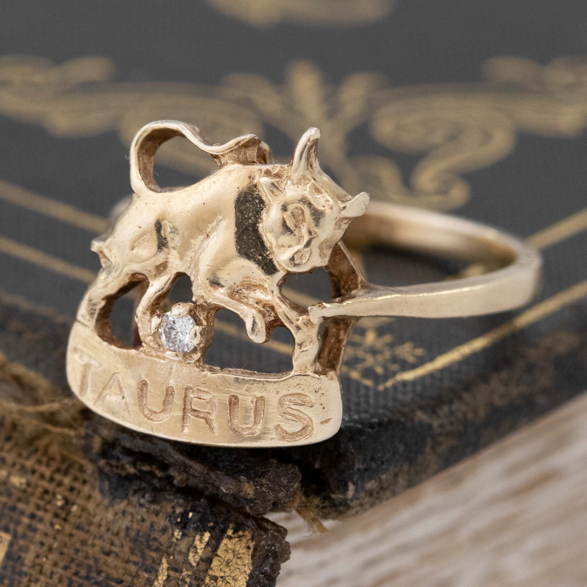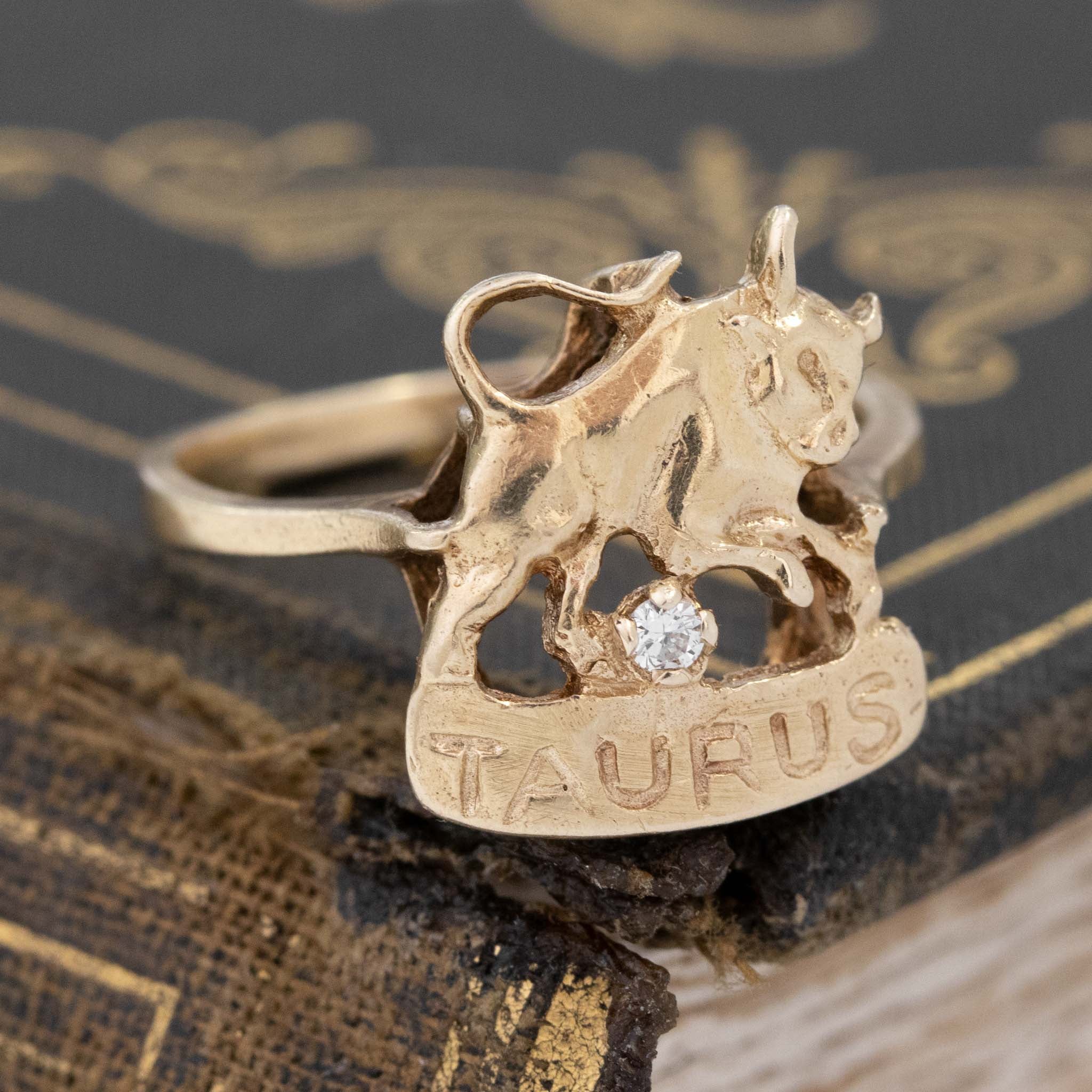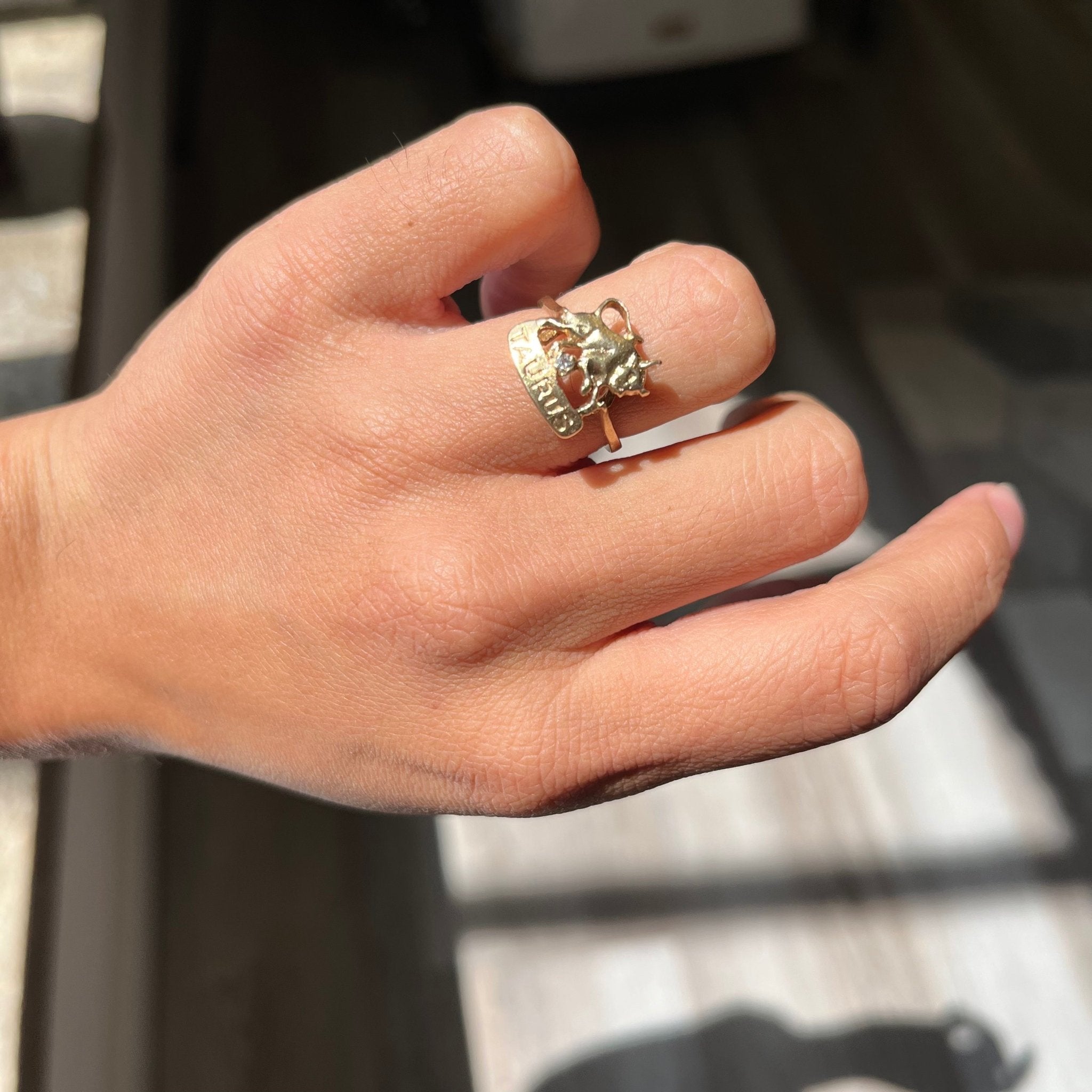 Shoutout to all the Tauruses in the world - y'all have a caring, stubborn, and headstrong way about you that is represented perfectly by the bull. This gold bull ring with a baby diamond and engraved “TAURUS” is the perfect bold and gold accessory for your springtime babies. She sits quite comfortably and low to the finger, with plenty of coverage in a chic detailed way.