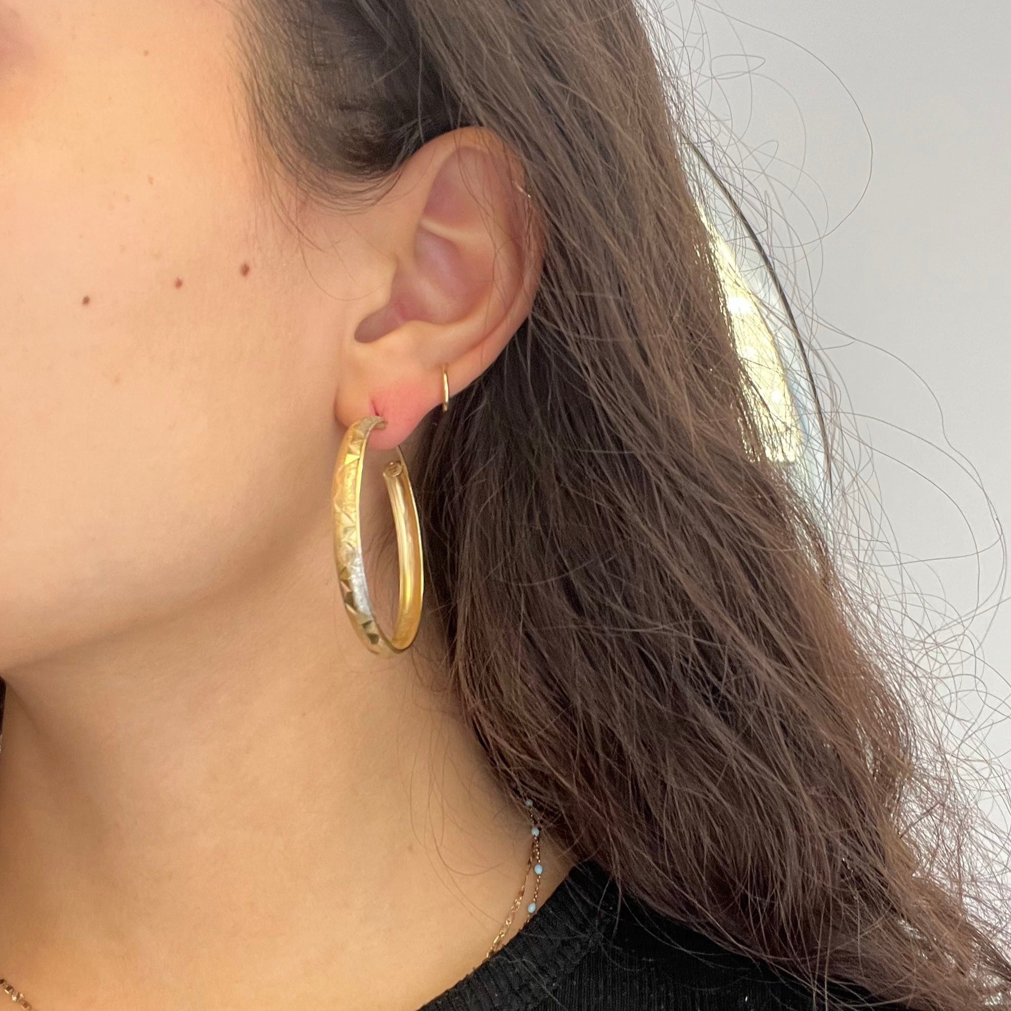 Gold hoops belong in everyone’s jewelry suite - perfect for daily wear in a bold, gold way! They’ve got a texture to them that is absolutely delightful, in addition to the unique two-tone gold going on! Also, big fans of the size on these bad boys.