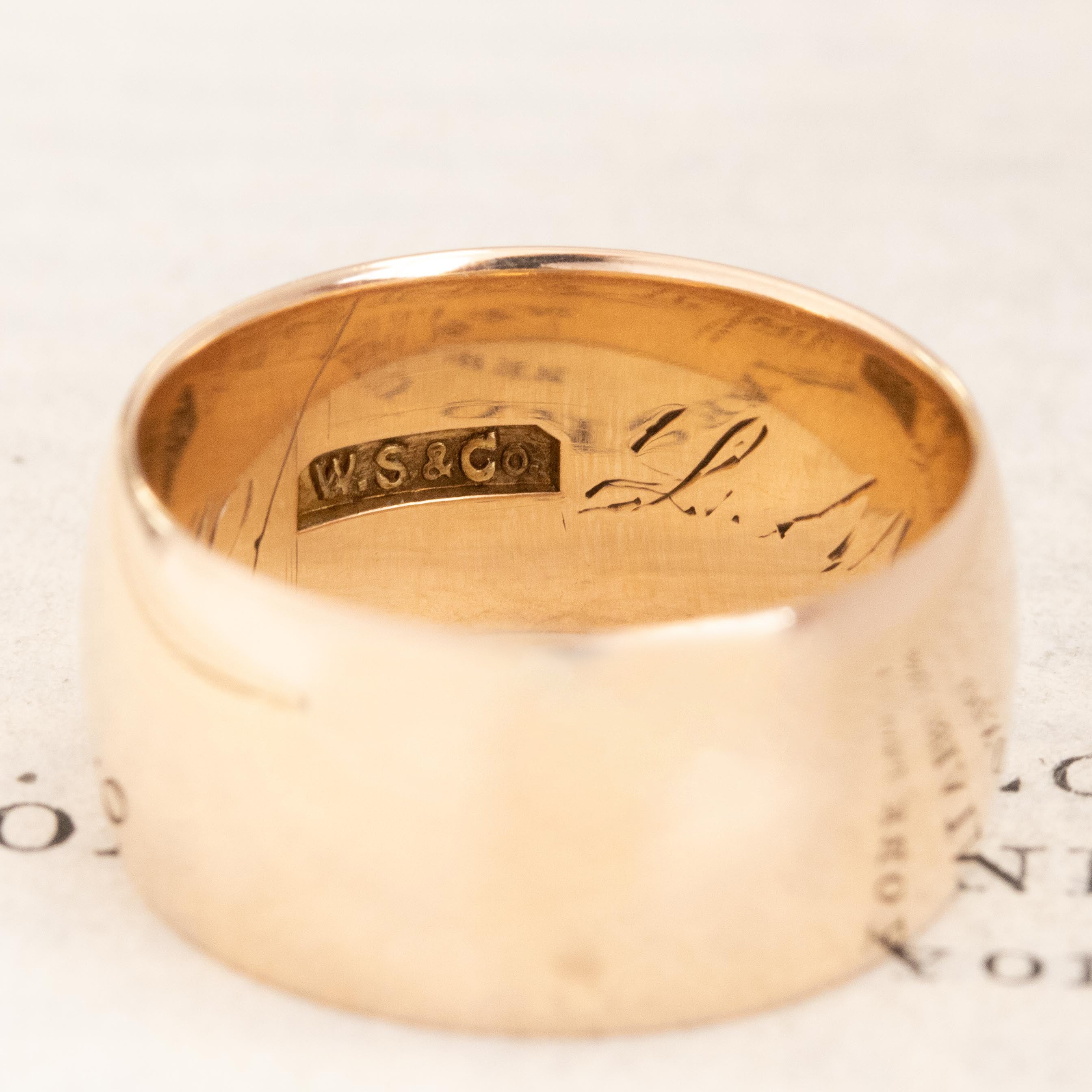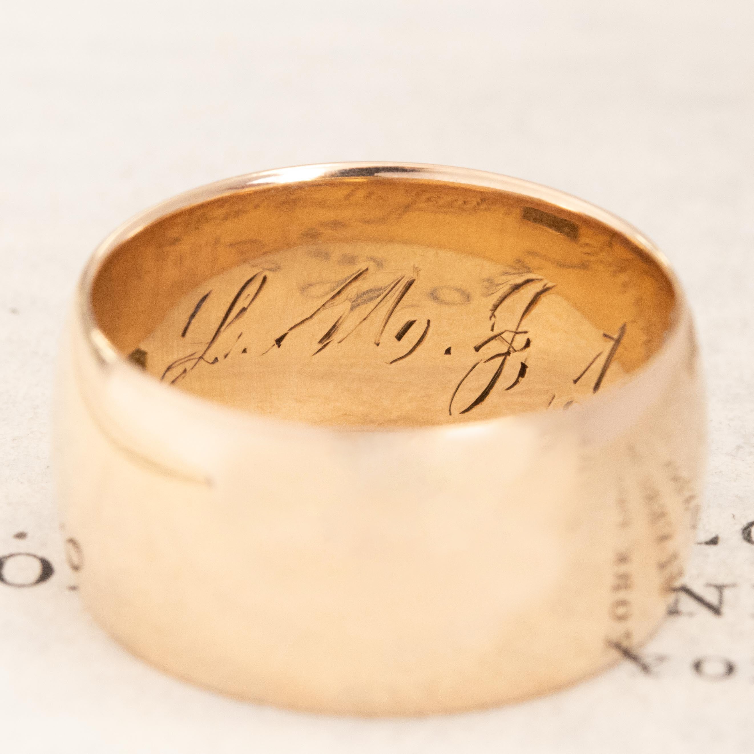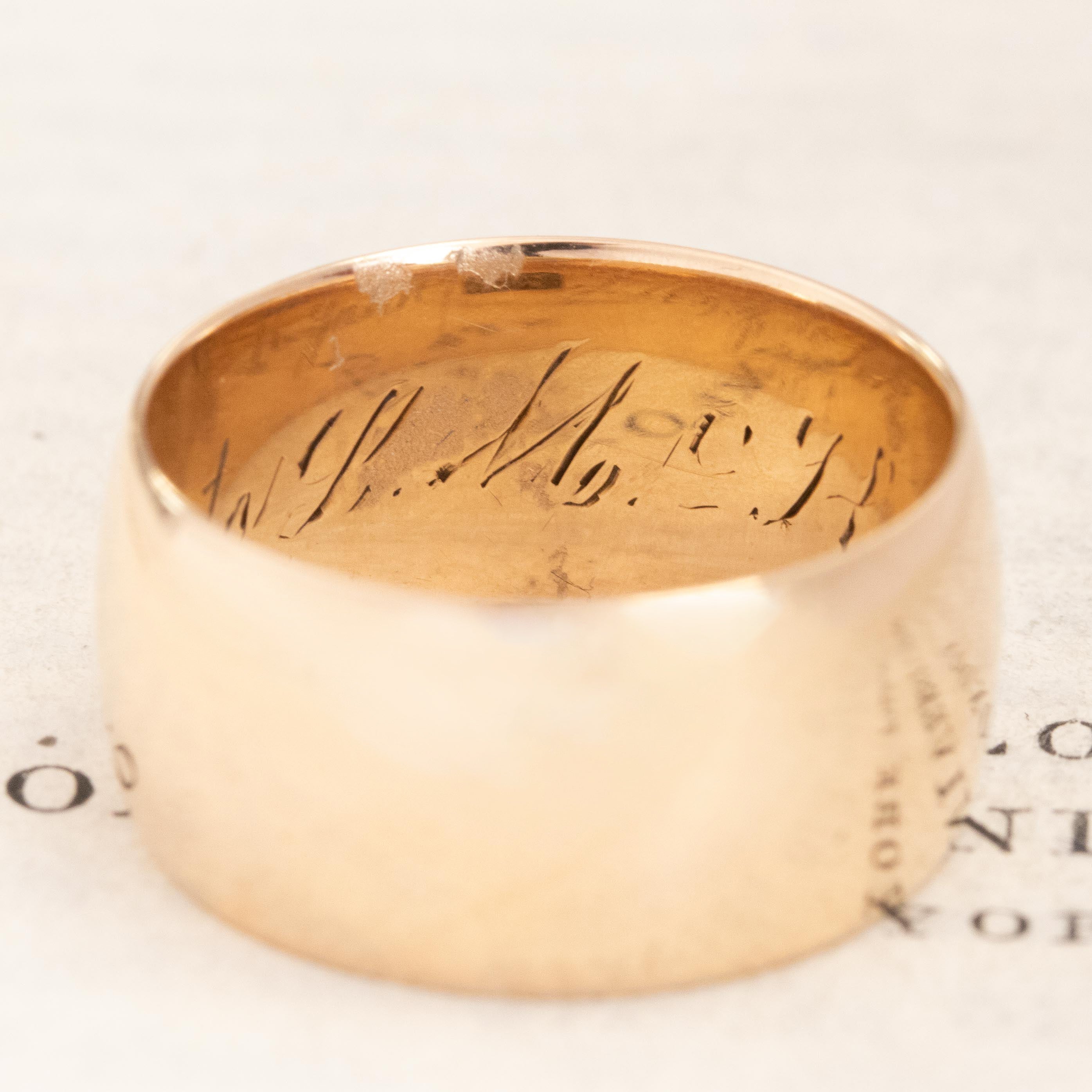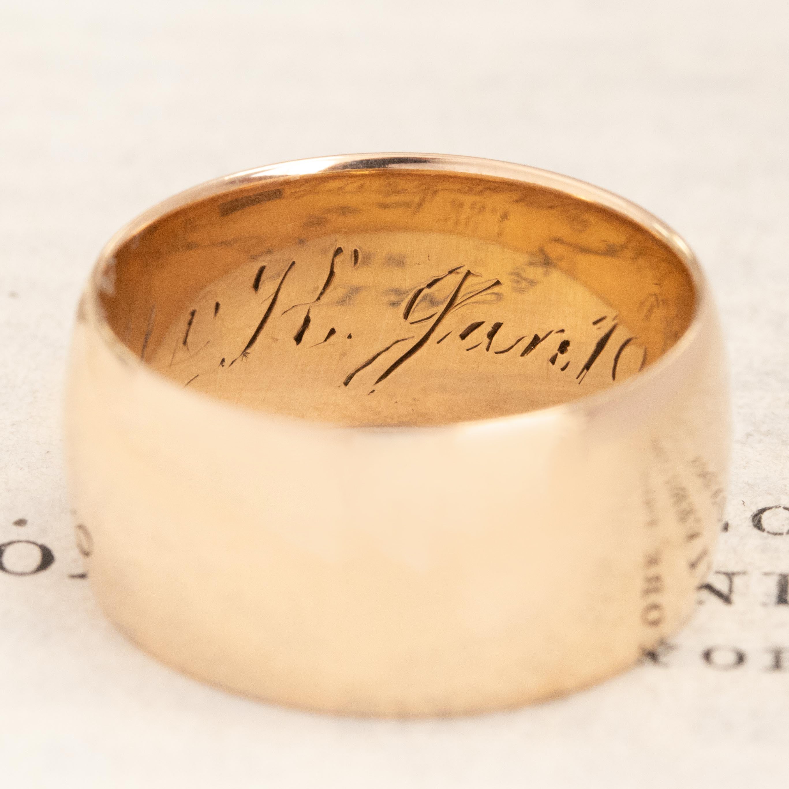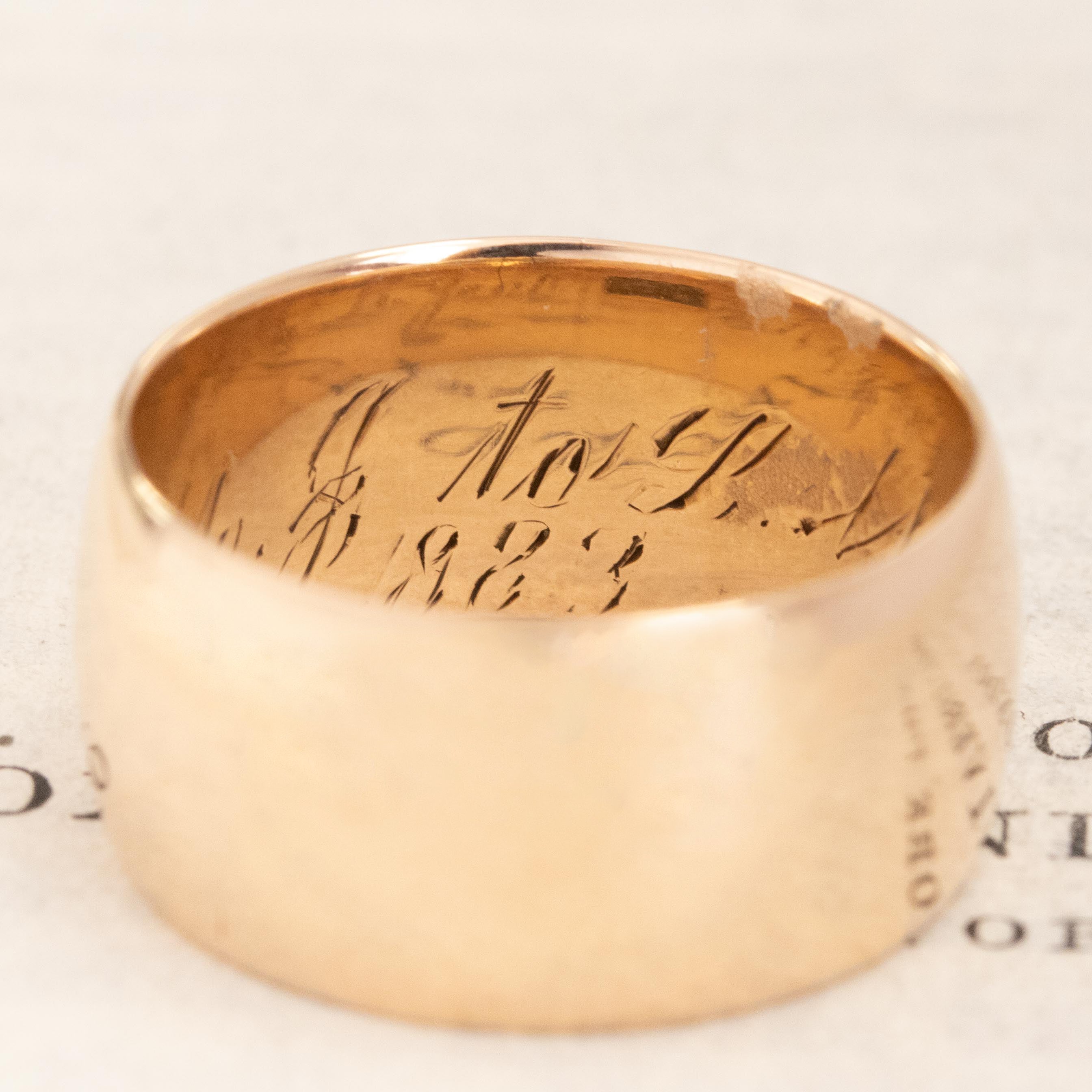 A chunky antique band, buttery smooth from a lifetime of wear and ready to tackle the next 100 years in your band stack. Her engraving on the inside is slightly faded, but clearly read the year 1883 with some memorial initials.