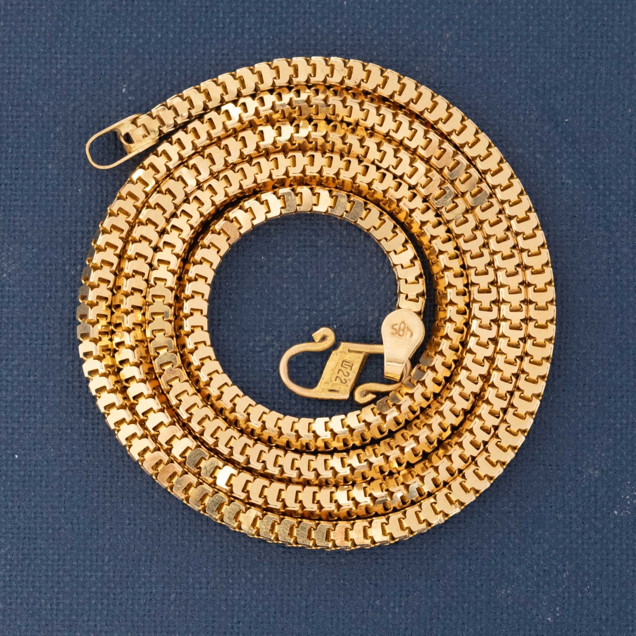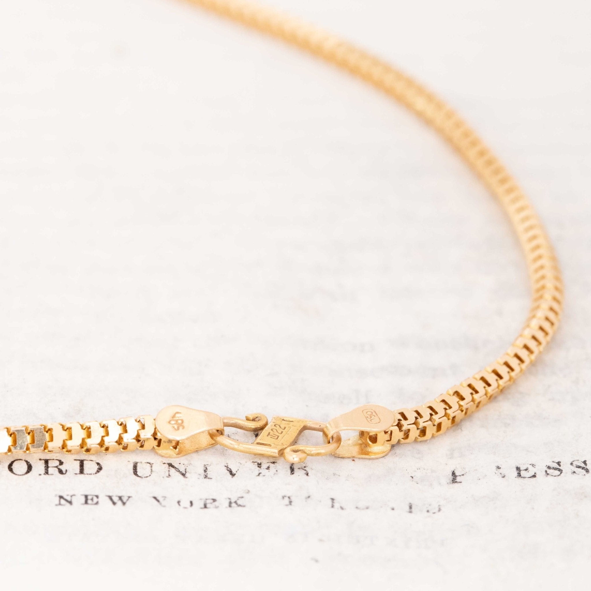 A slinky box link chain, crafted in buttery 18kt gold with a 22kt gold clasp! At 2.3mm in width, we find this chain to be perfectly present with a slight shimmer to it that looks beautiful in the light. Great for solo wear or layered with your favorite antique chain.