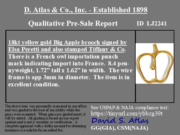 With the recent passing of iconic jewelry designer Elsa Peretti, her pieces and designs have been even more popular and collectible. Drawing her inspiration from nature and her life experiences, this free-from apple brooch is large in scale and style - a wonderful piece to add to one's collection.