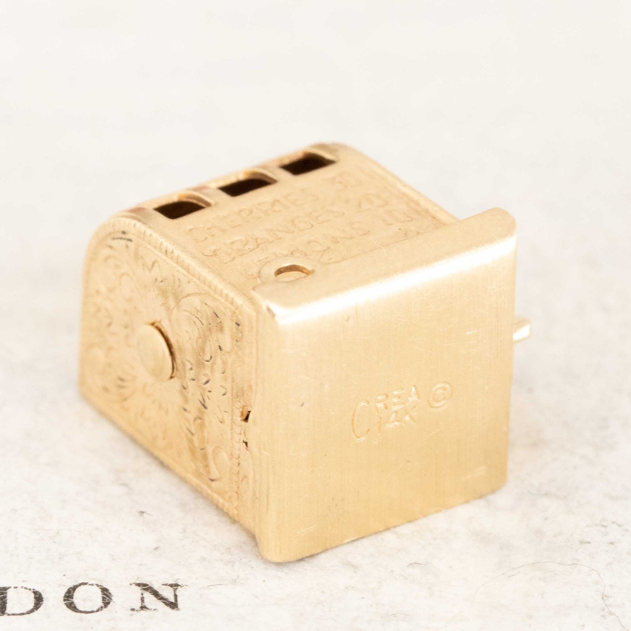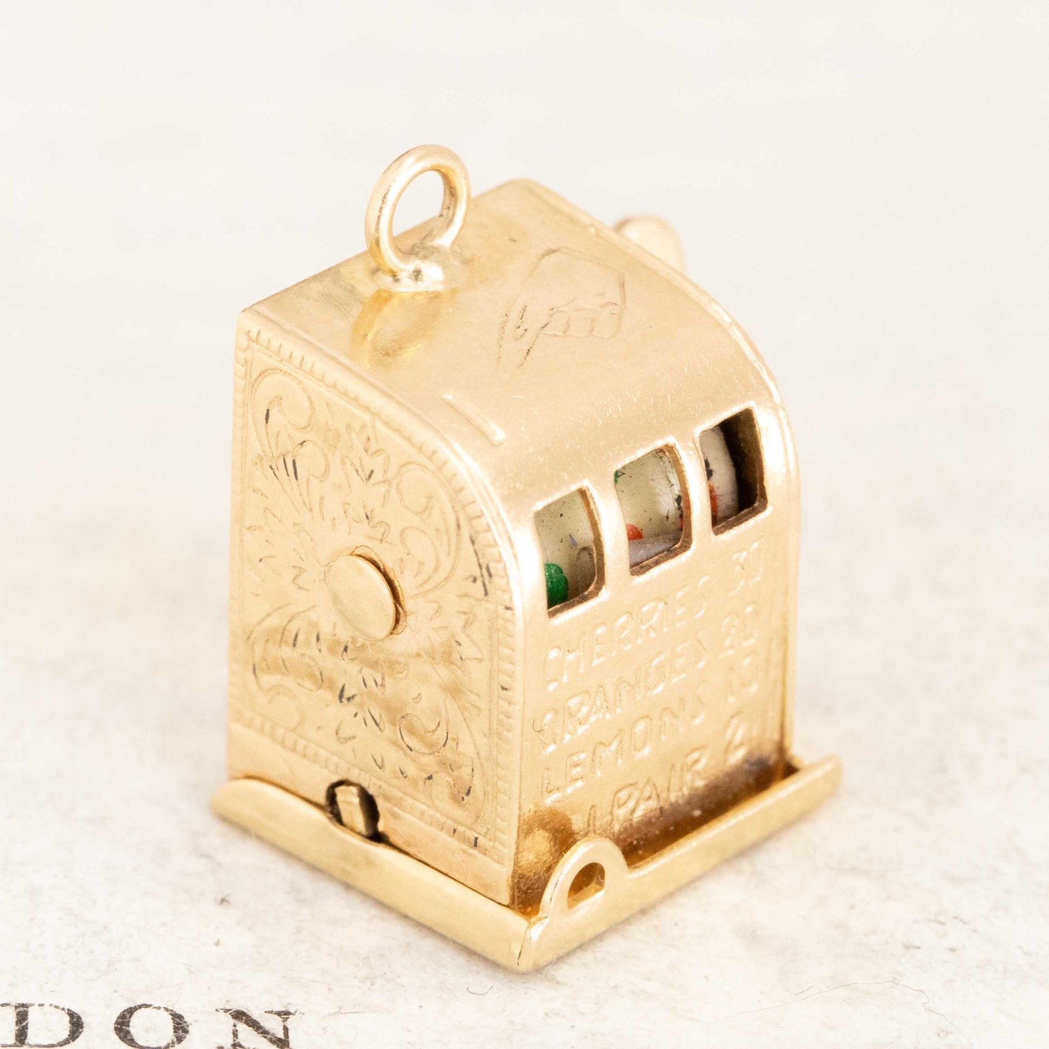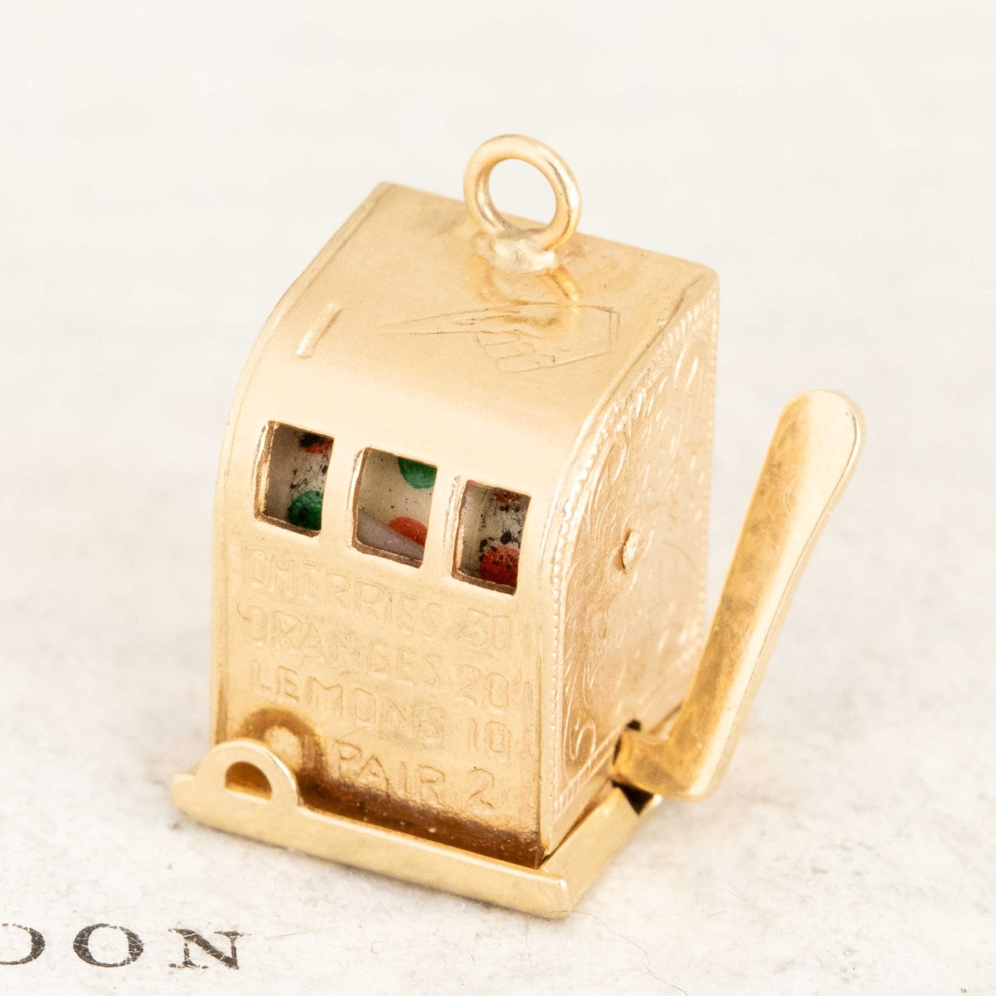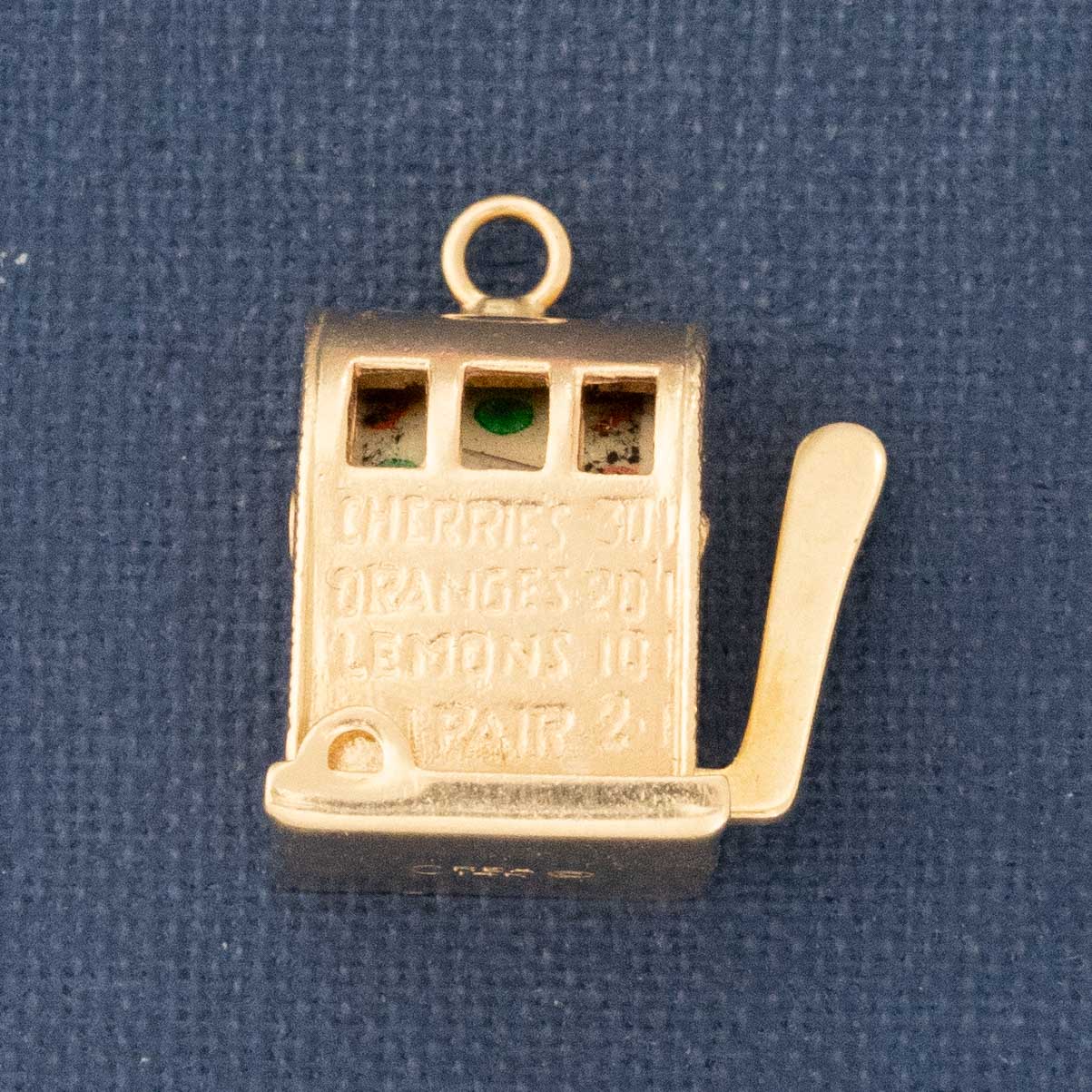 Each time we find any one of these vintage articulating slot machines, we couldn't help ourselves! The articulating arms show the moving windows with images rendered in enamel. Beautiful engraving all over.