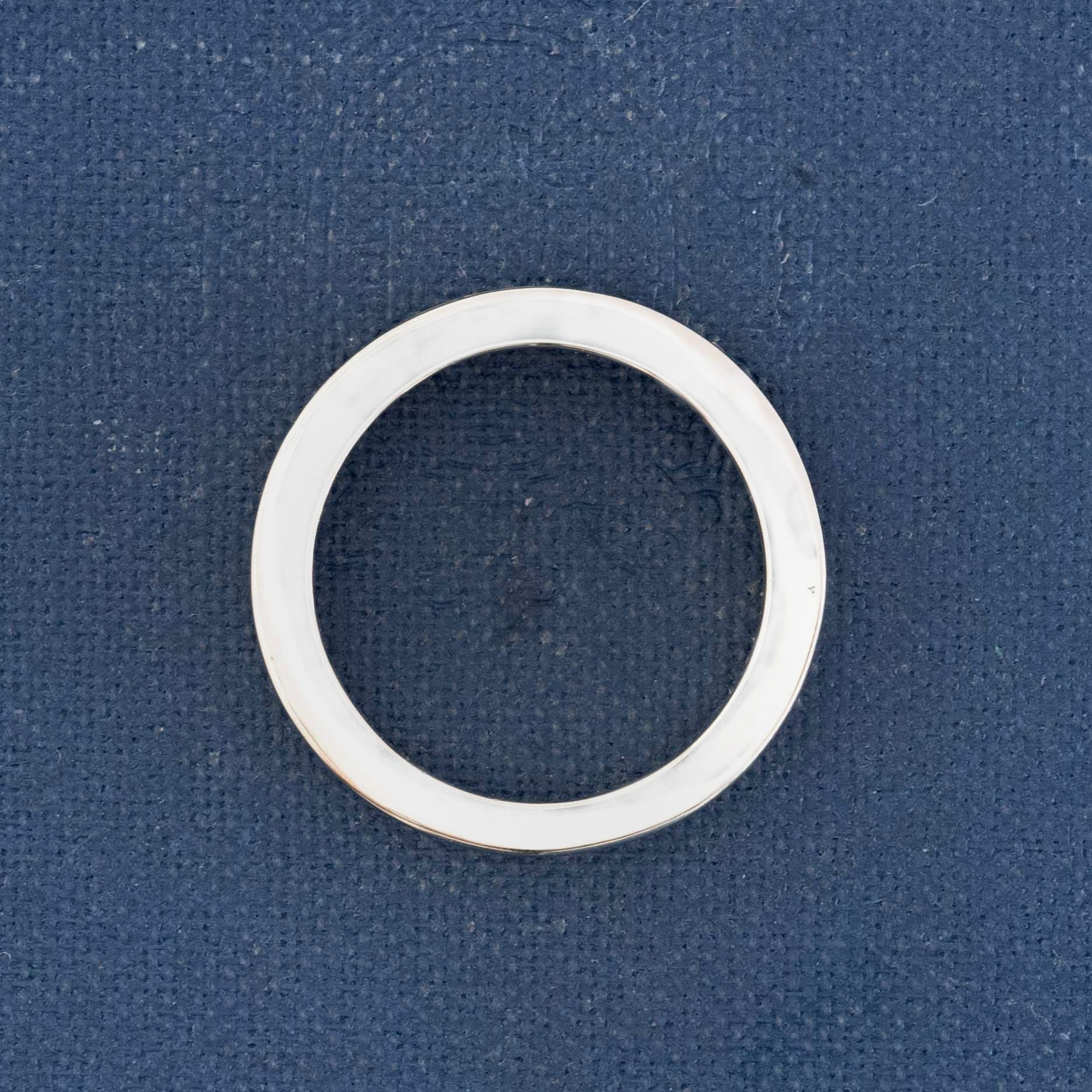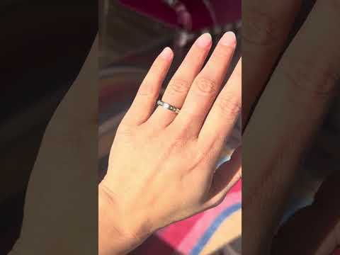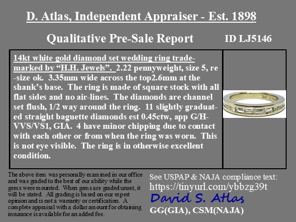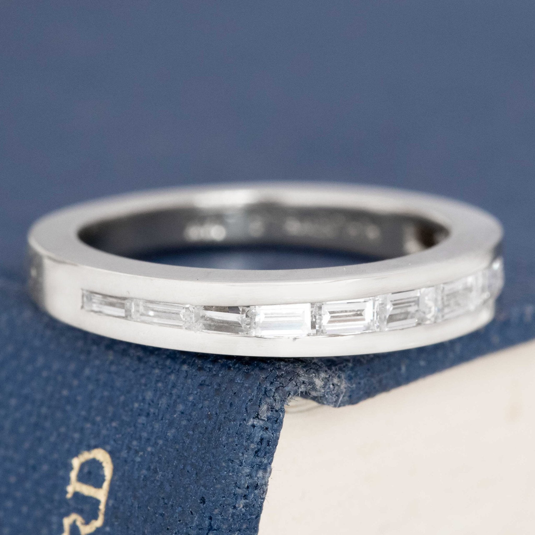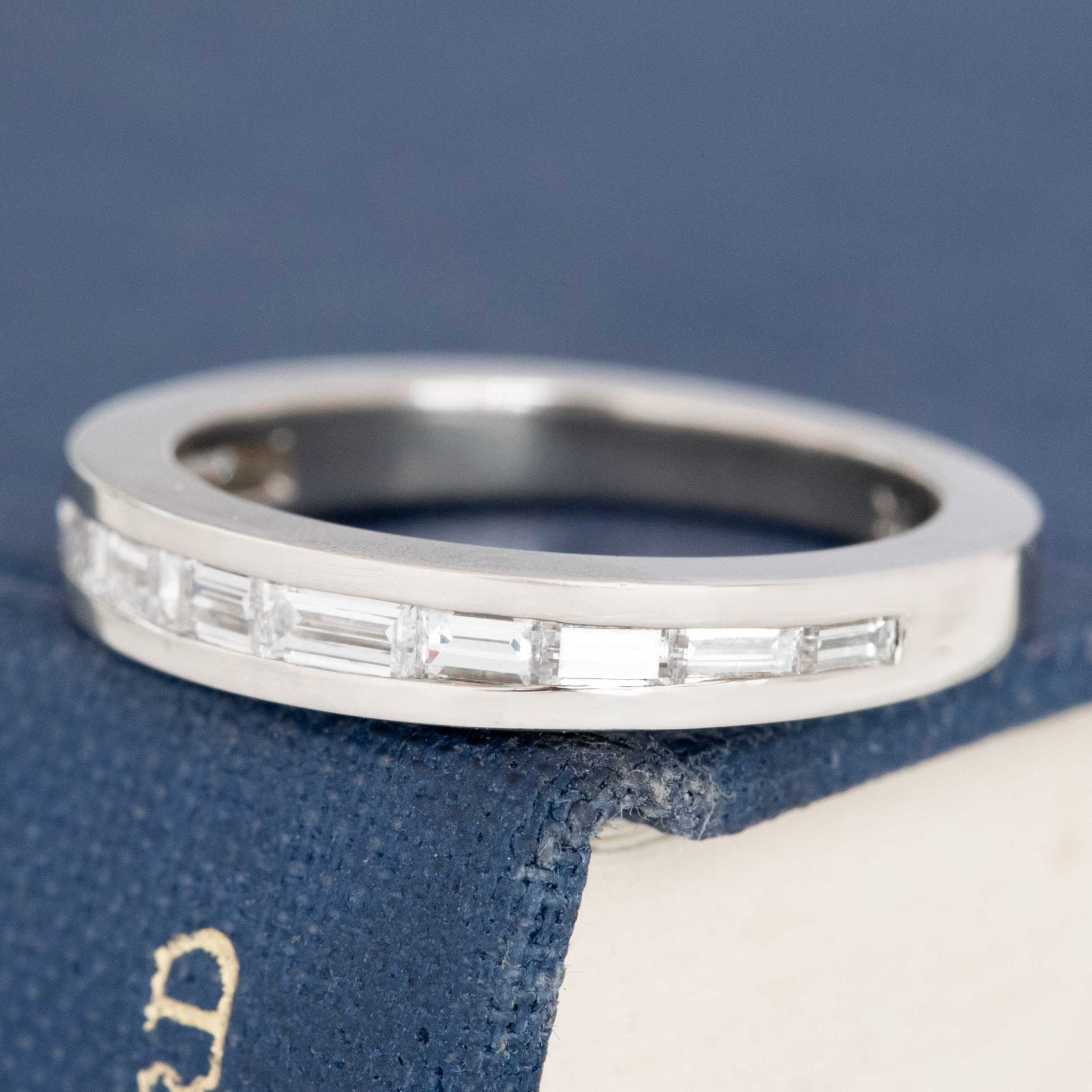 A vintage 14kt white gold band with a single row of baguette cut diamonds, all in a channel setting! The stones span across the finger beautifully and sit quite comfortably. We'd love to see this paired with a white metal engagement ring, or perhaps stacked with a chunky gold donut band.