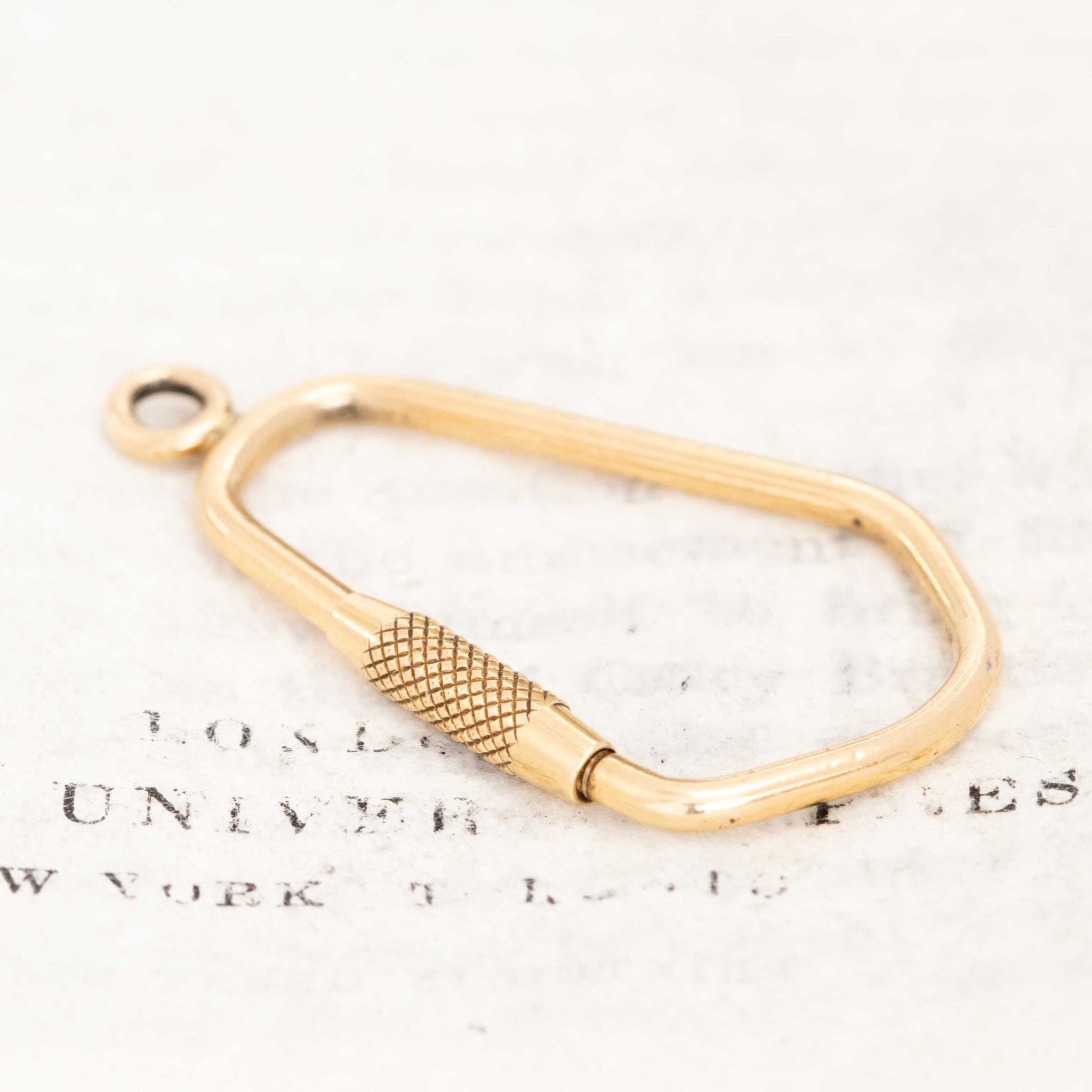 A vintage gold carabiner is the ultimate tool - both in your hardware and your jewelry box. This baby is an excellent size to wear on a long chain and a handful of your favorite charms - or perhaps an extender or jumbo clasp with your favorite antique link. 14kt yellow gold and in excellent condition.