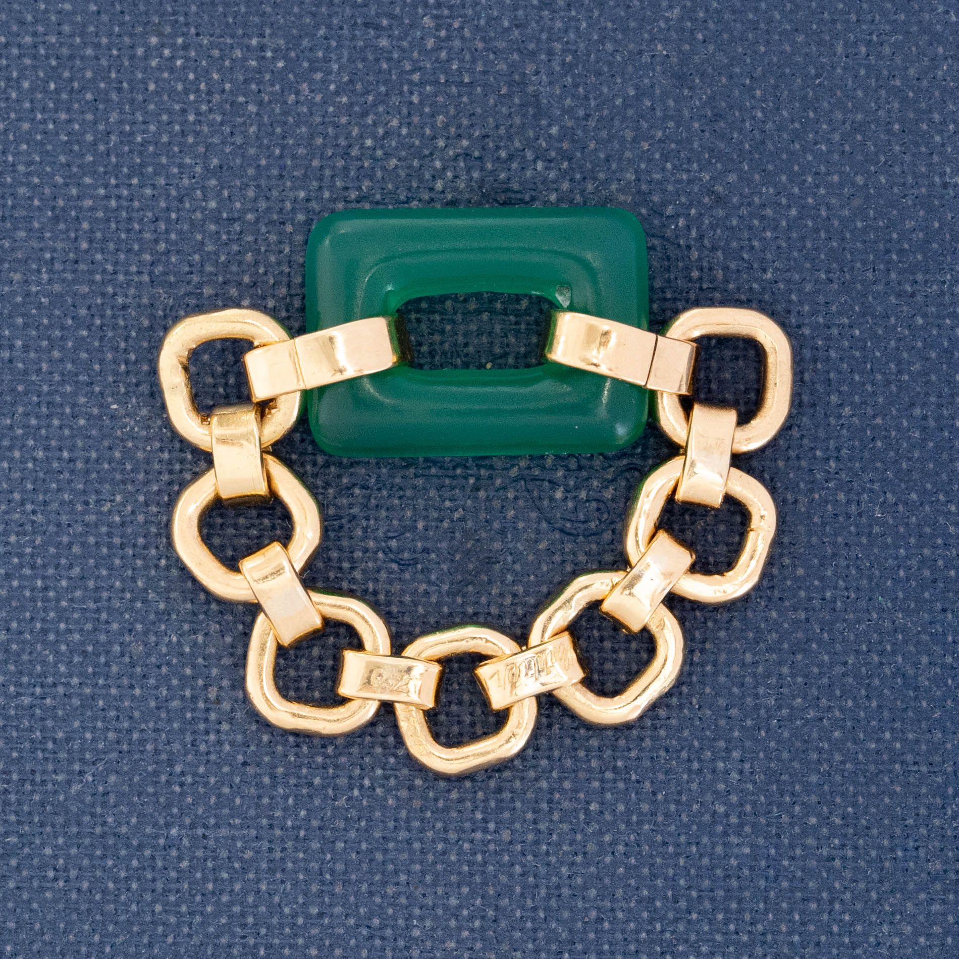 A really excellent chain ring from Cartier, centering on a carved chrysoprase in the center! It is comfortable and wears on the finger with ease, as the links are fluid and move like a normal chain link would. She’s giving big 1970’s vibes with the geometric links, bold color, and masculine-leaning design.