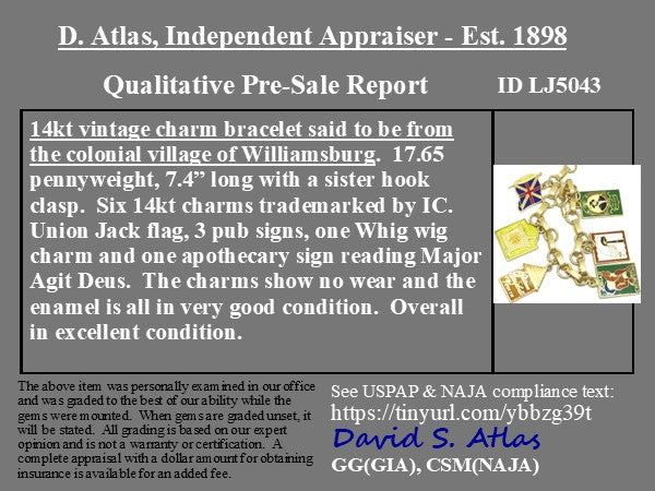 When we initially came across this bracelet, we appreciated the colorful enamel work and the great link for a bracelet. With a bit of research, we came to find out that this bracelet actually pays homage to Colonial Williamsburg: set with the British flag, and three popular taverns that are still standing to this day. The next is a flag with a latin symbol that reads "major agit deus," which translates to God is the more powerful agent/mover/actor - a common phrase used for apothecary signs. The last is emblematic of the Whig political party, which would have been the popular politcal affiliation in colonial times.