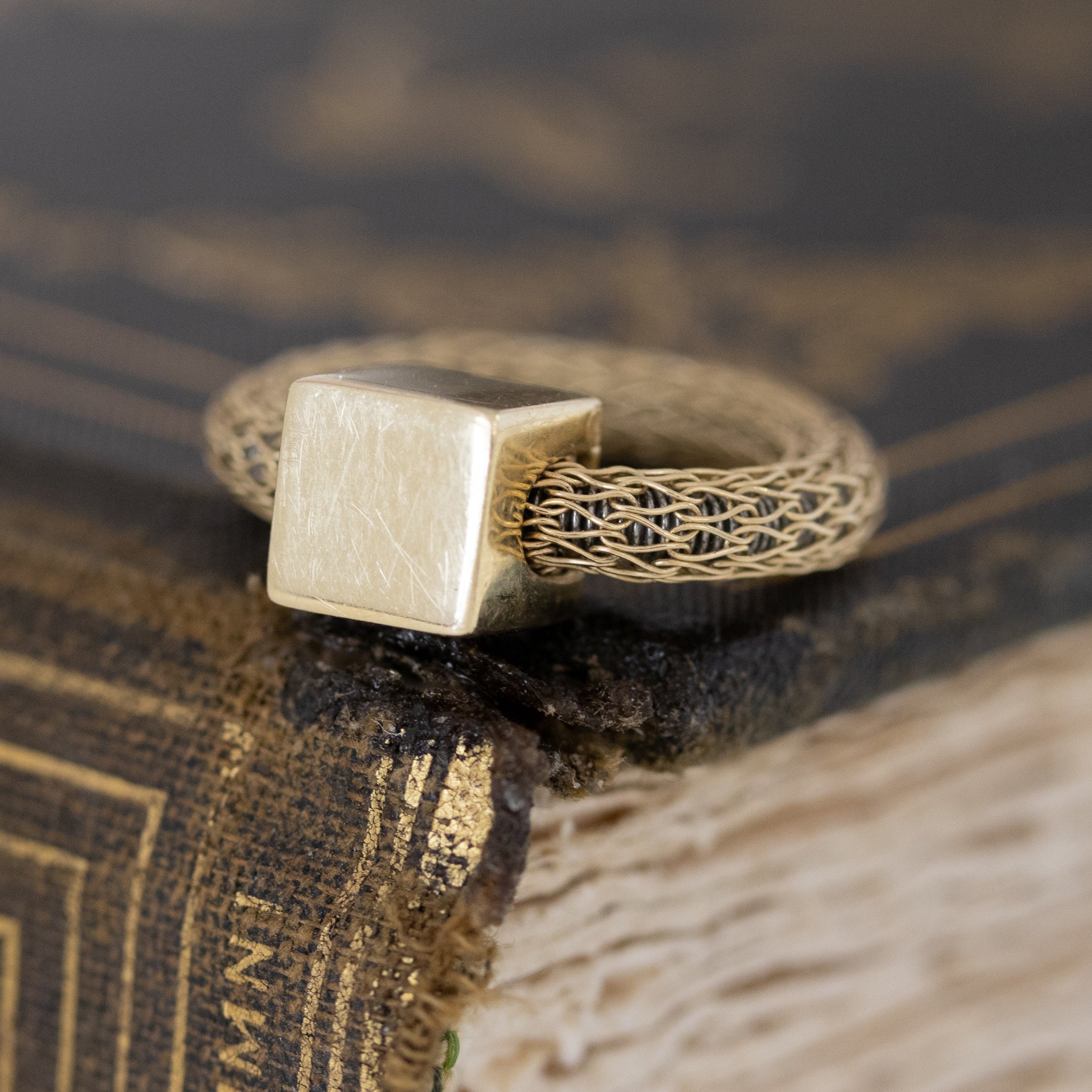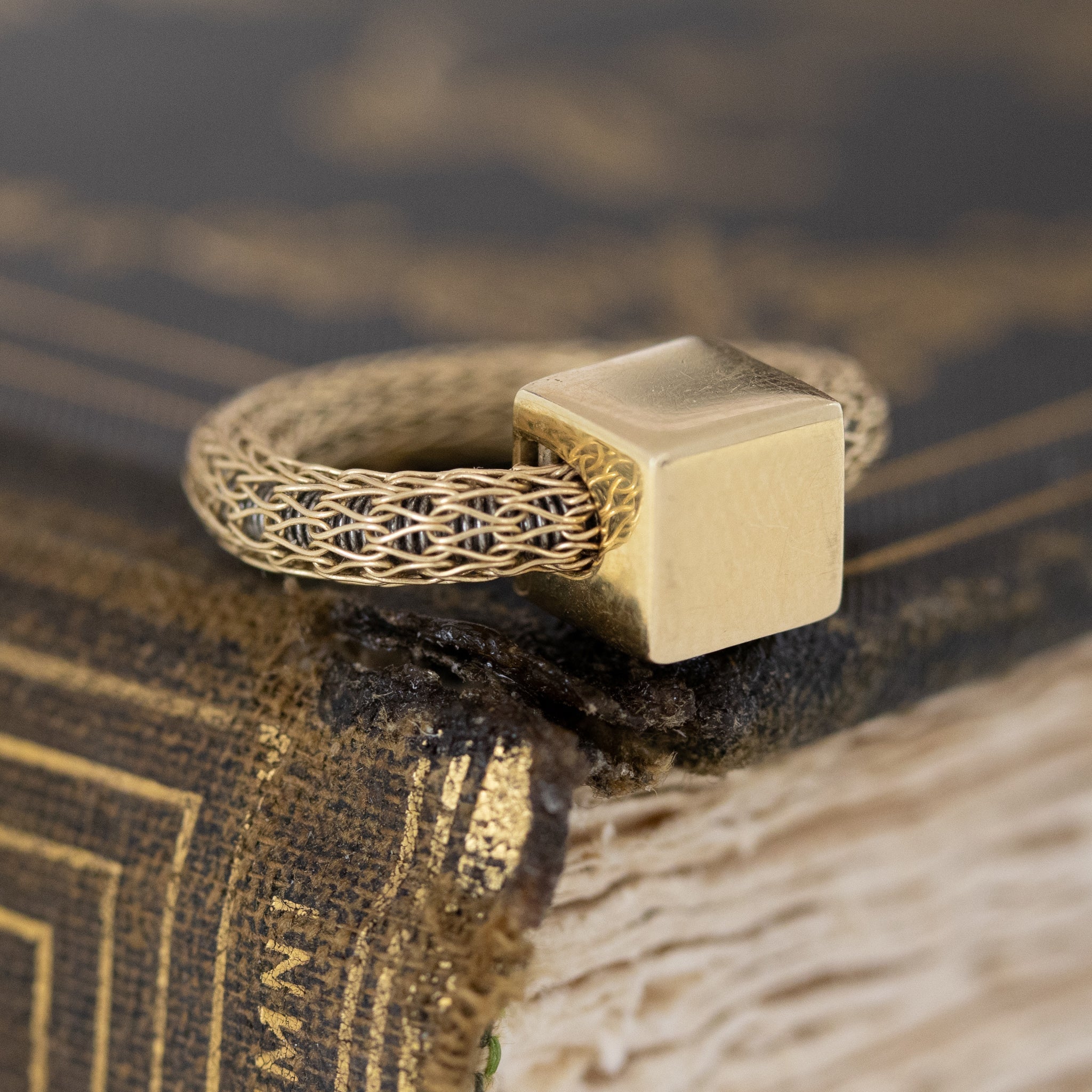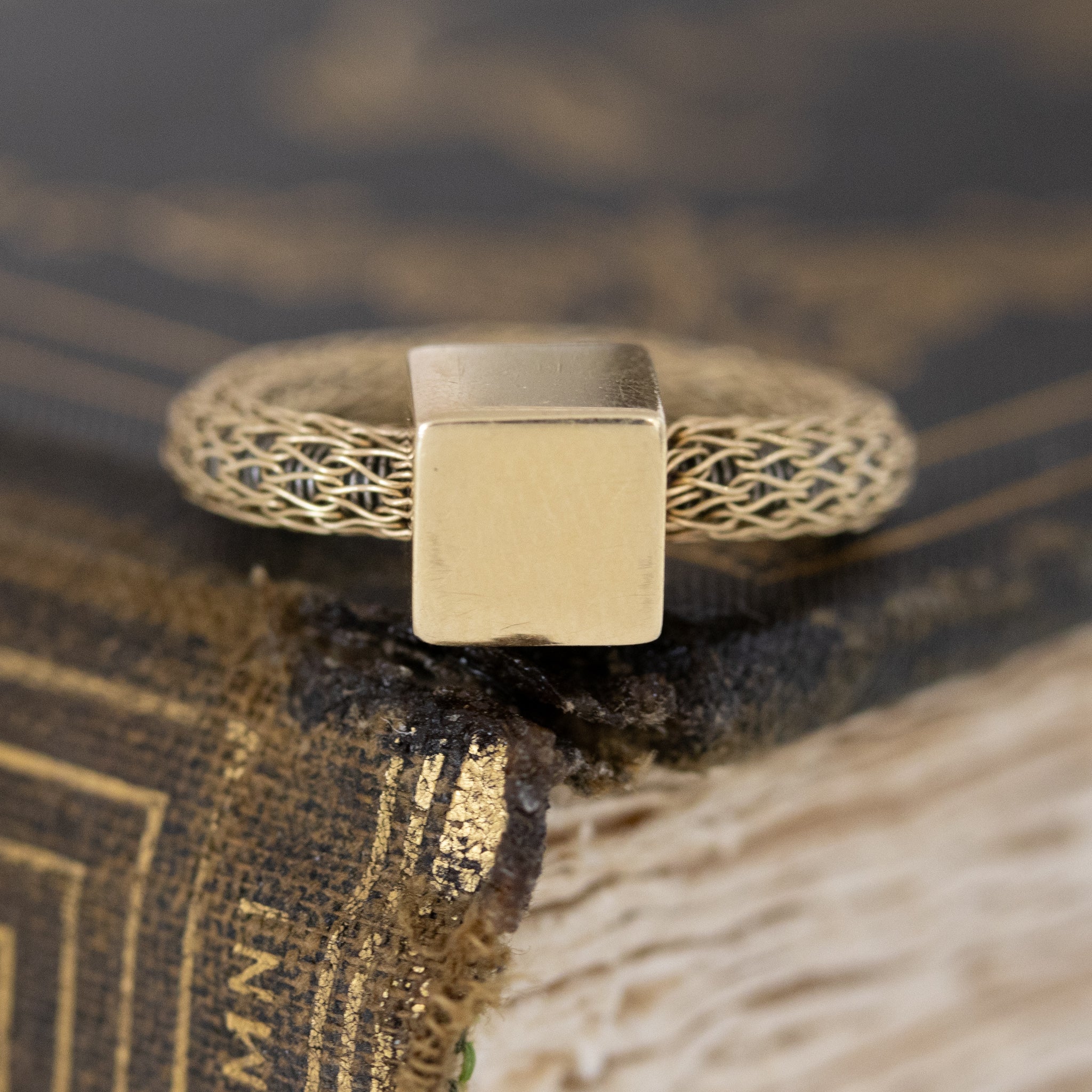 This gold cube and mesh ring can be an incredibly unique pinky ring situation - we’ve never seen anything quite like it! It’s got a really comfortable feel on the finger, and the gold cube gives it a cool geometric vibe. The gold mesh surrounds a white metal on the inside that gives the ring its shape and stability, but we love that it feels almost springy.