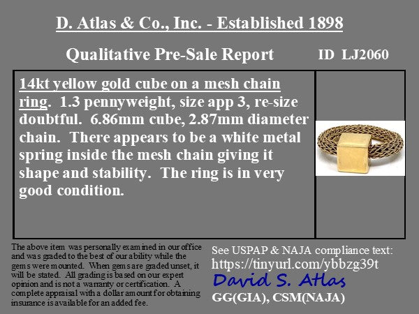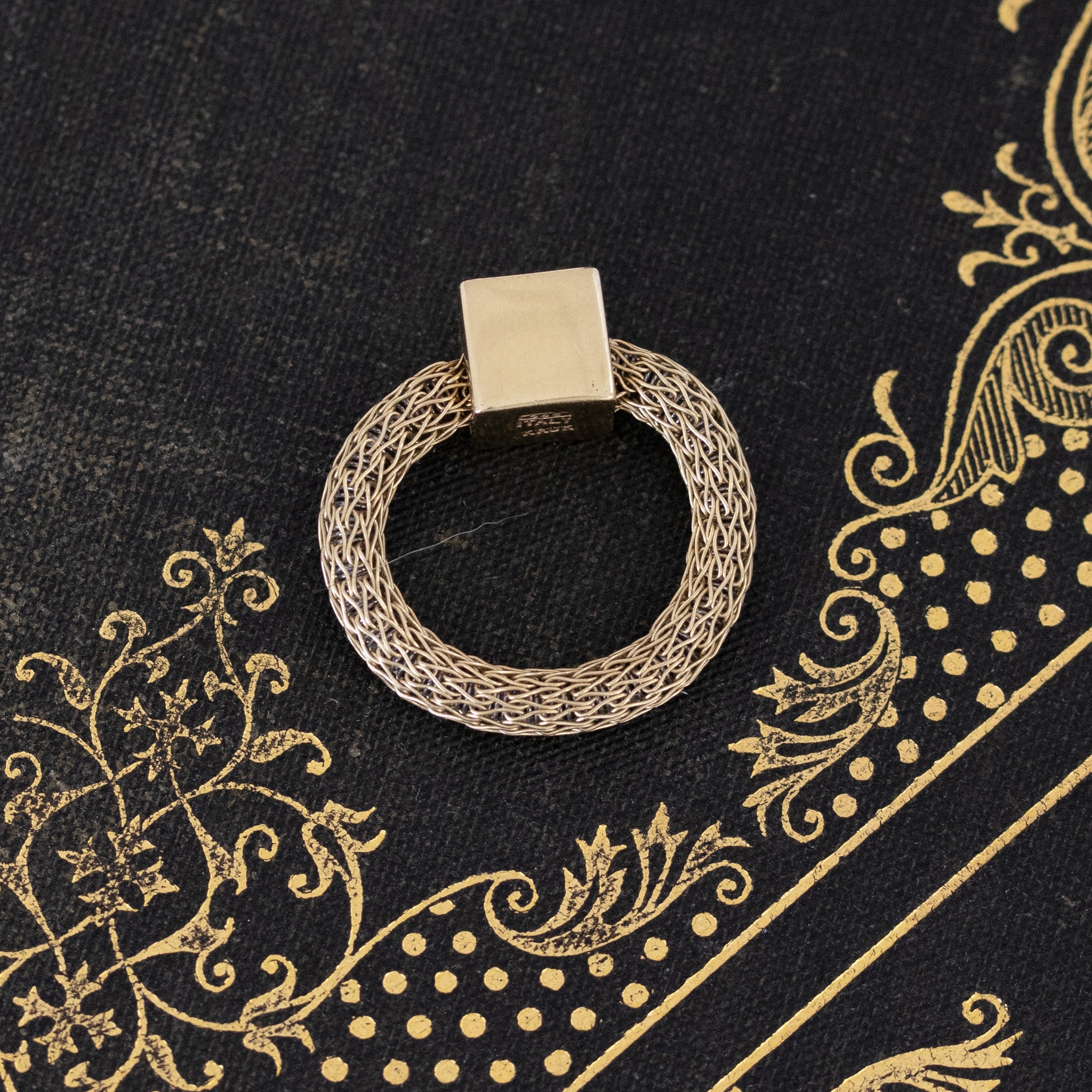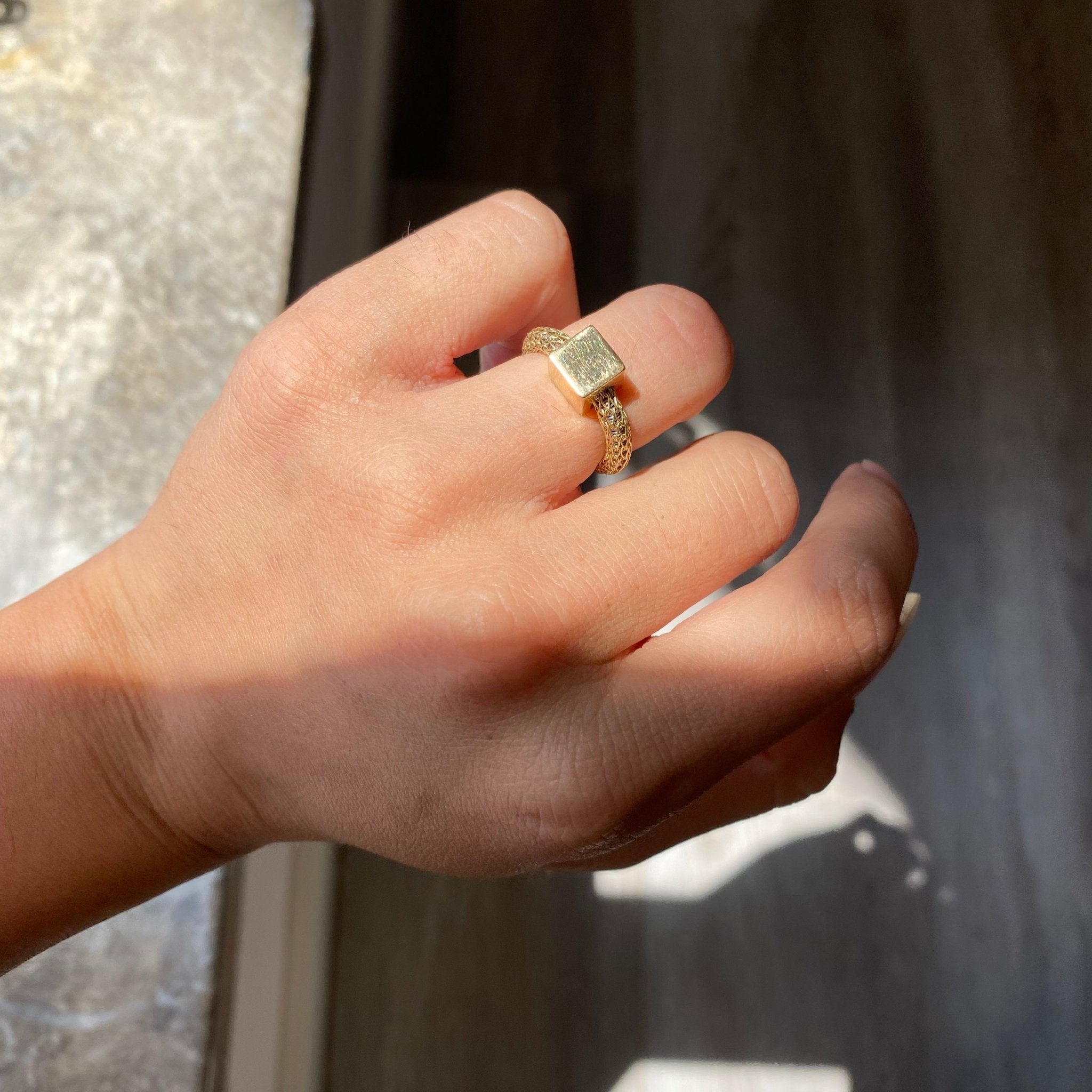 This gold cube and mesh ring can be an incredibly unique pinky ring situation - we’ve never seen anything quite like it! It’s got a really comfortable feel on the finger, and the gold cube gives it a cool geometric vibe. The gold mesh surrounds a white metal on the inside that gives the ring its shape and stability, but we love that it feels almost springy.