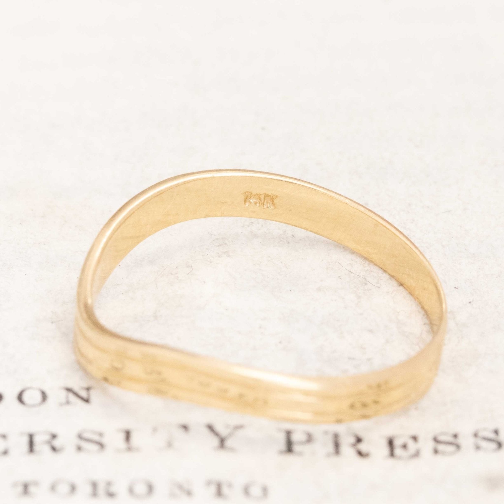 Super hard band to find, let alone one that is vintage! Flat and wide, with crisp grooves, the curve will hug a solitaire/engagement ring nicely.