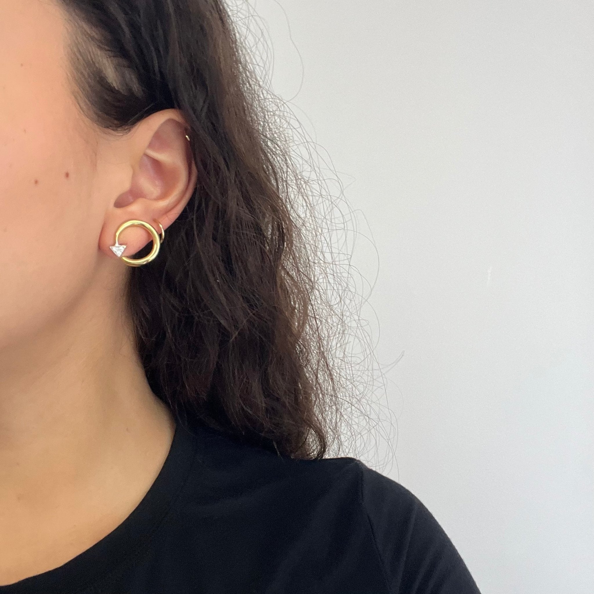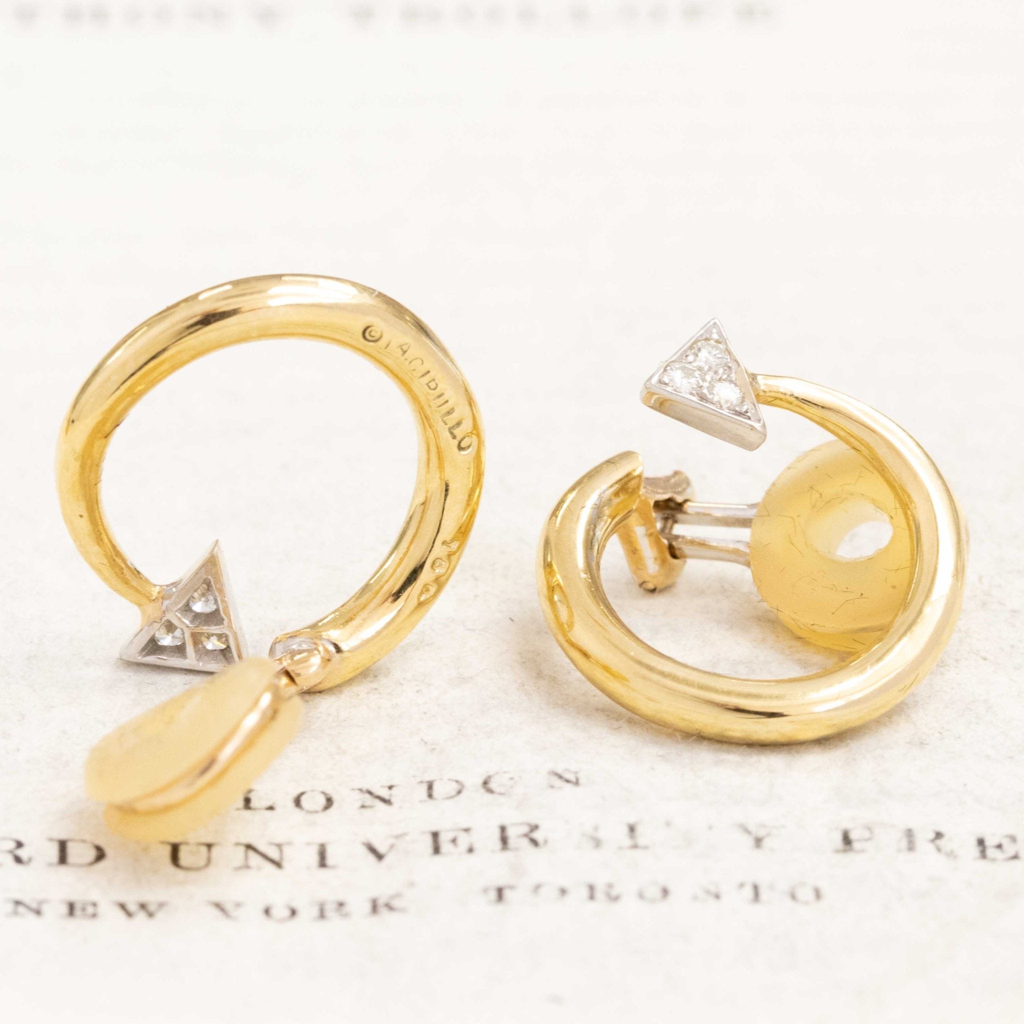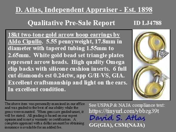 Another timeless design motif from none other than Aldo Cipullo of Cartier's "Love" series in the 70s. Beautifully proportioned so that its present on the lobes yet scaled for daily wear. The diamond studded arrow "tips" is simply the most whimsical touch!