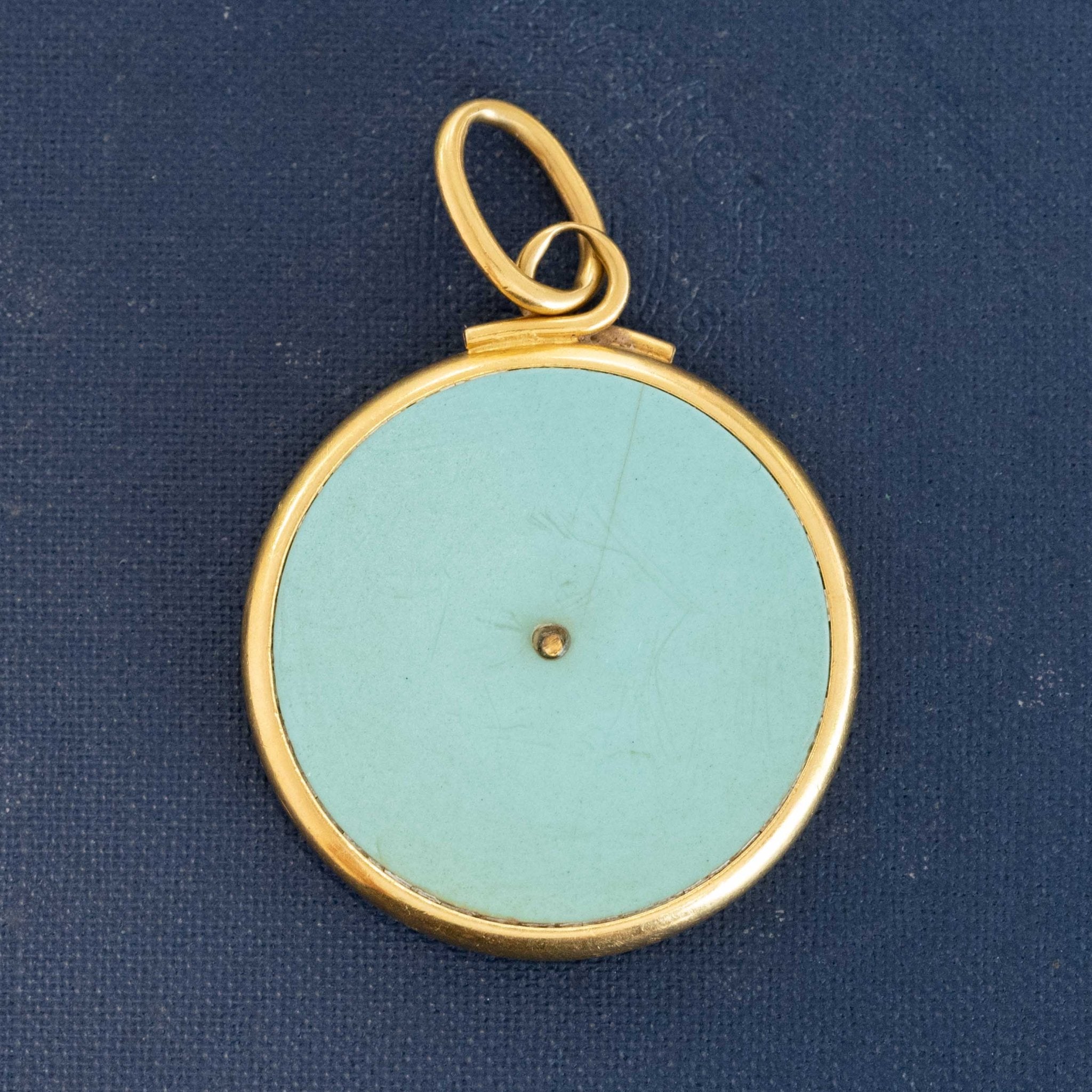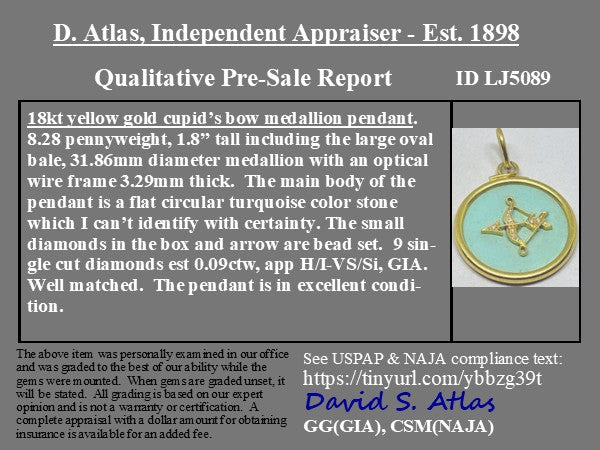 A diamond cupid’s bow sits on a turquoise medallion, all wrapped in a buttery gold bezel. A sweet and bold piece, and excellent option for those who want the scale of a medallion but with a touch of color and sparkle.