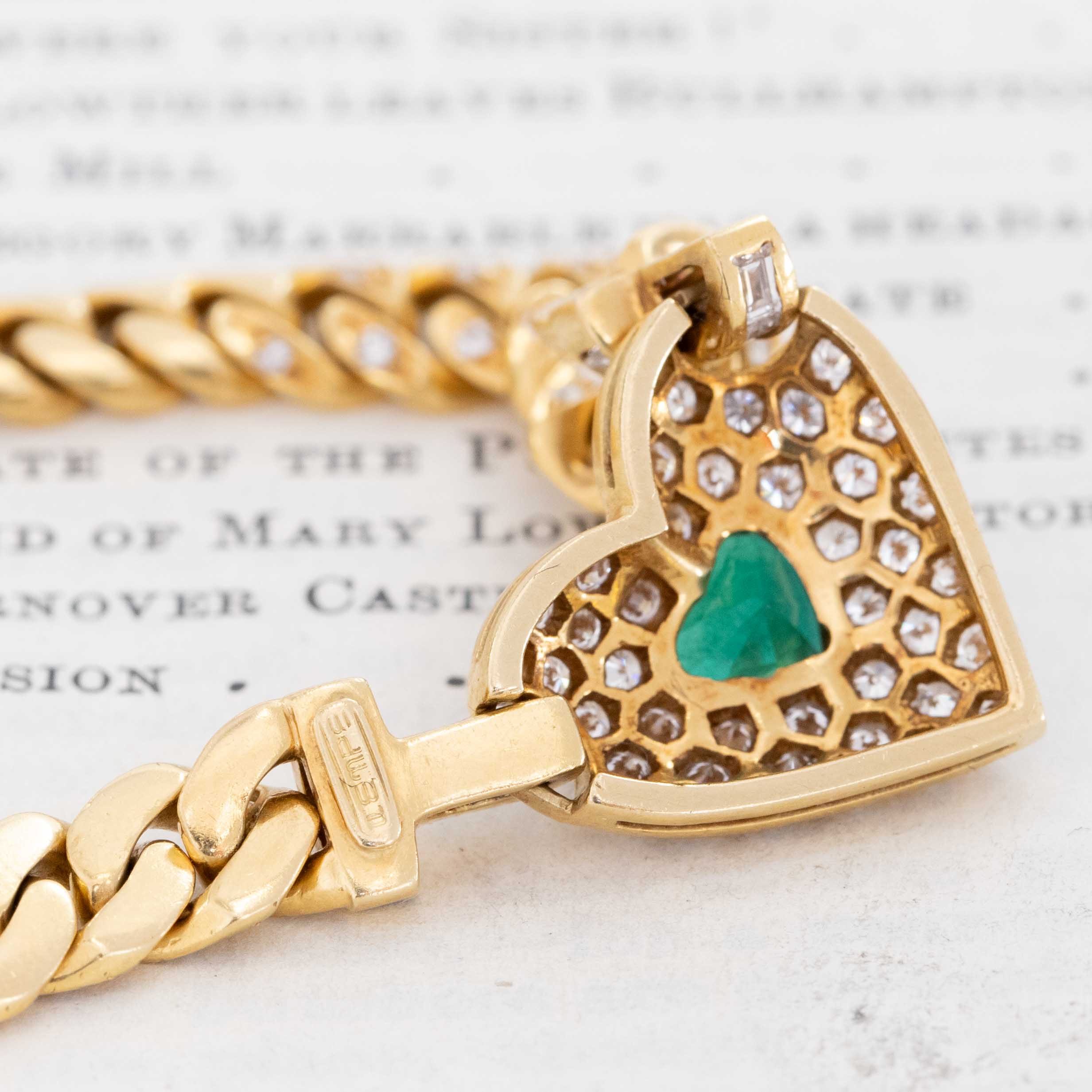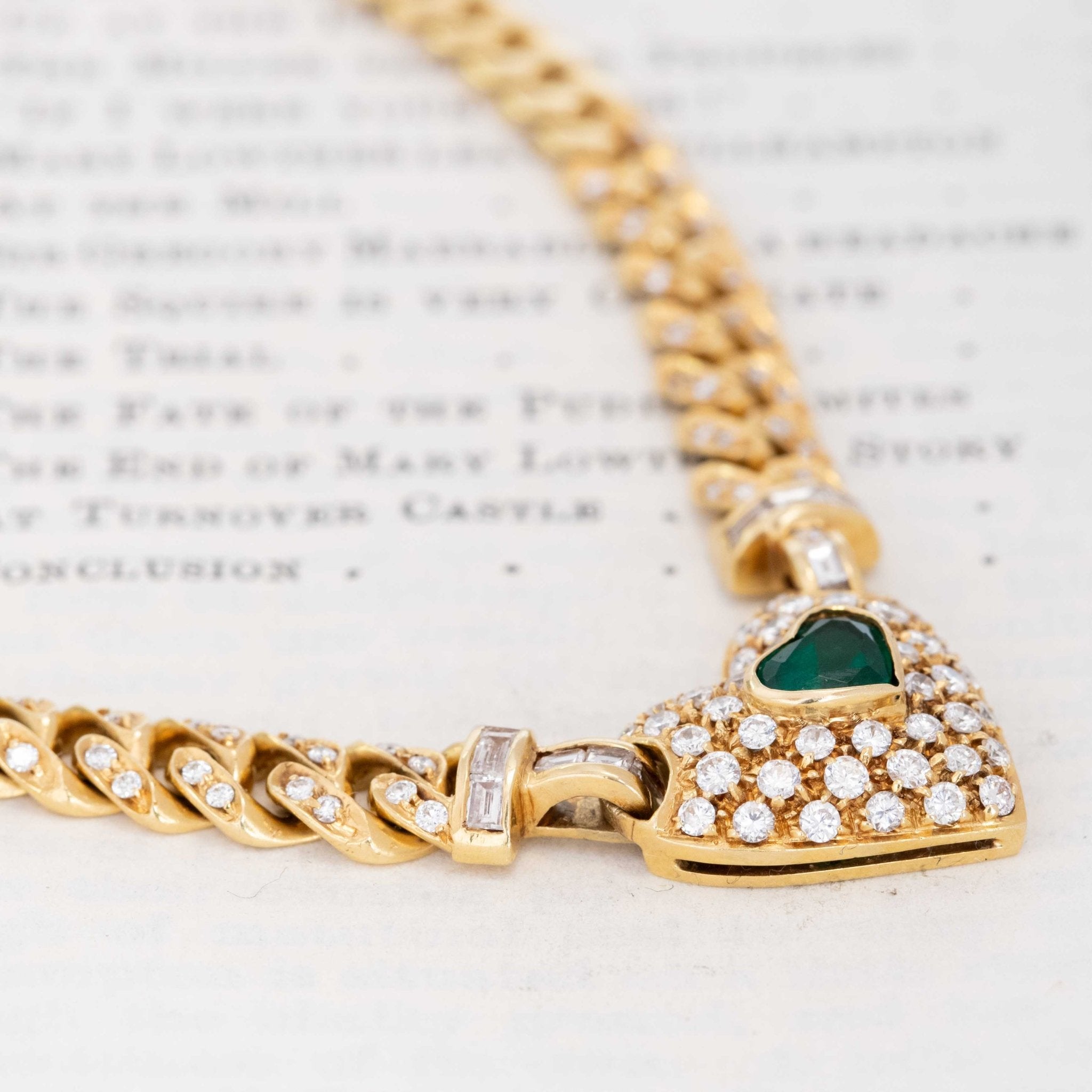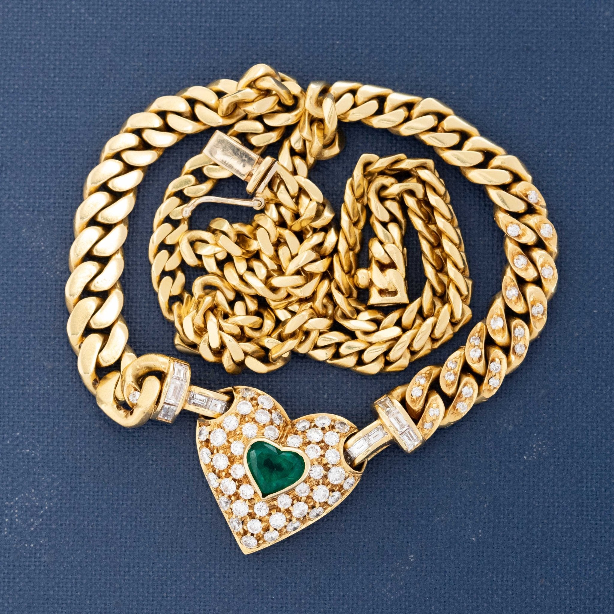 The chunky gold necklace of my 1980’s jewelry dreams. She centers on a gold, pave-diamond studded heart with an emerald center. It is suspended on an equally chunky curb link chain, ALSO accented with pave diamonds, with bales that happen to be channel-set with baguettes. It is weighty and bold, with a great amount of color contrast. That sparkle? Delicious.