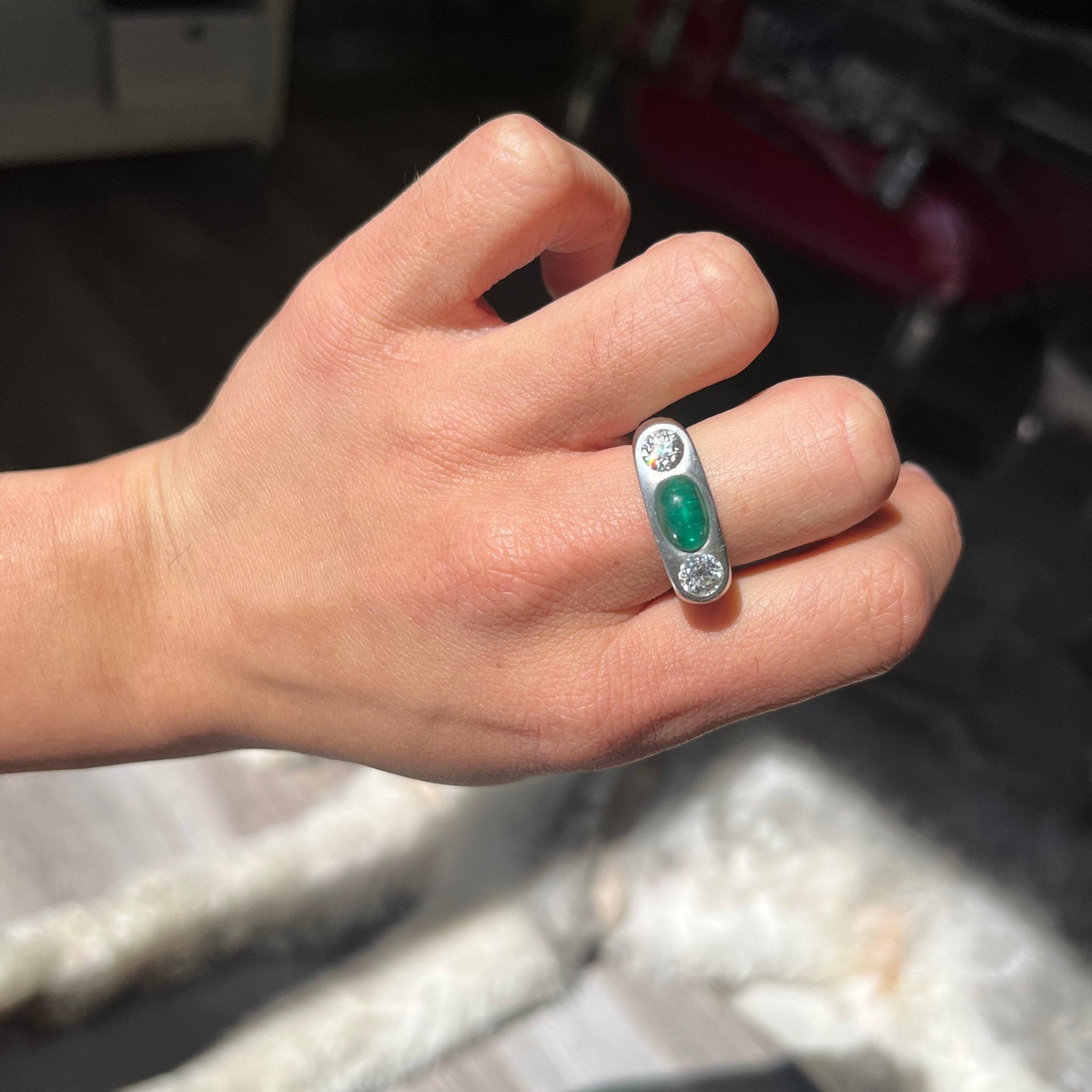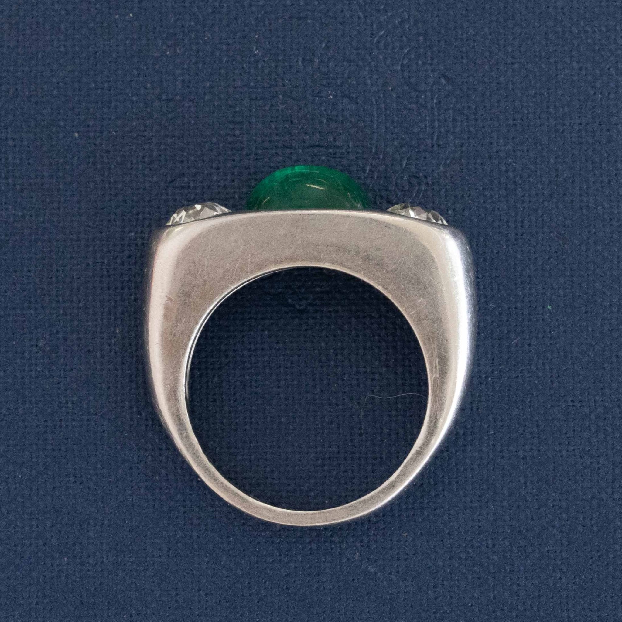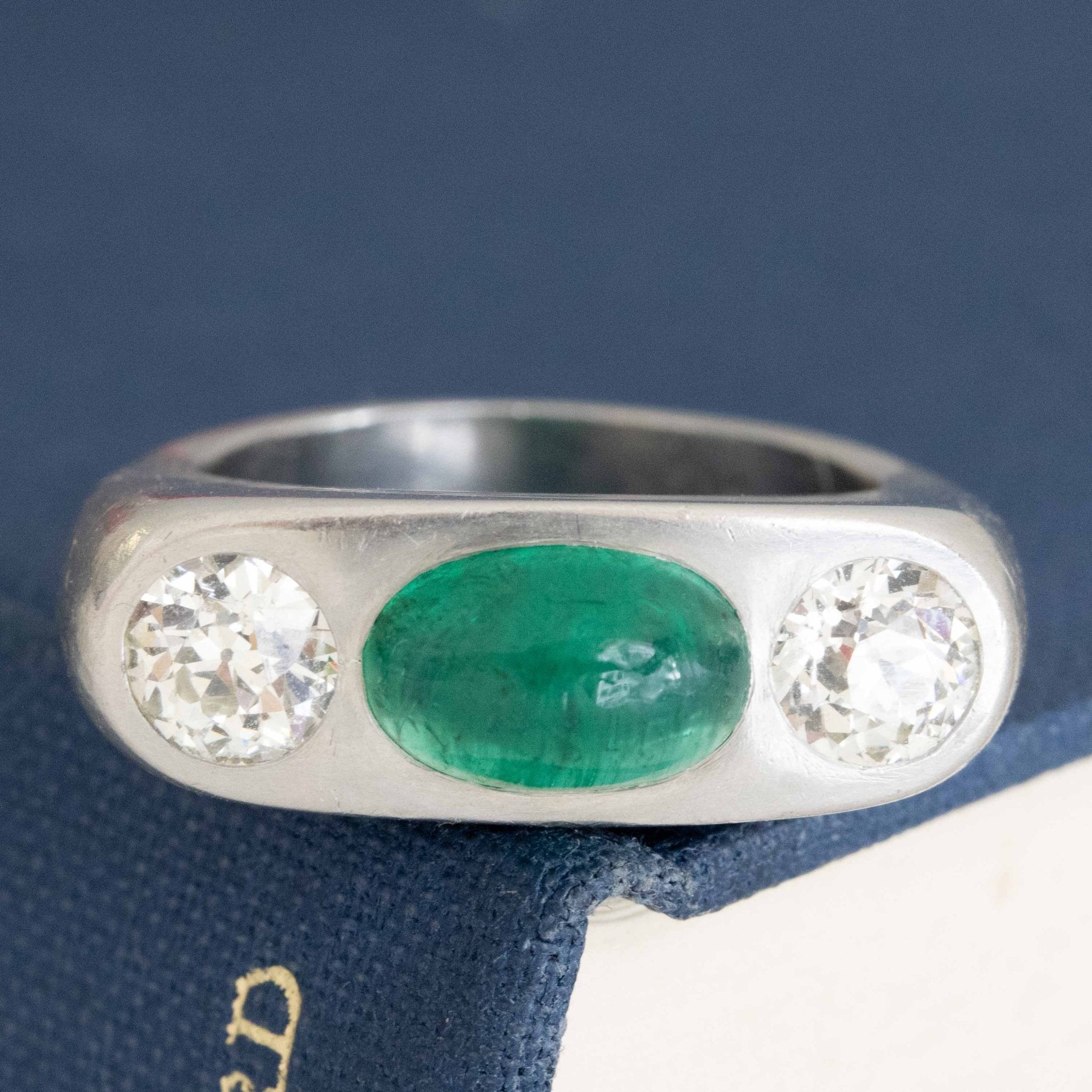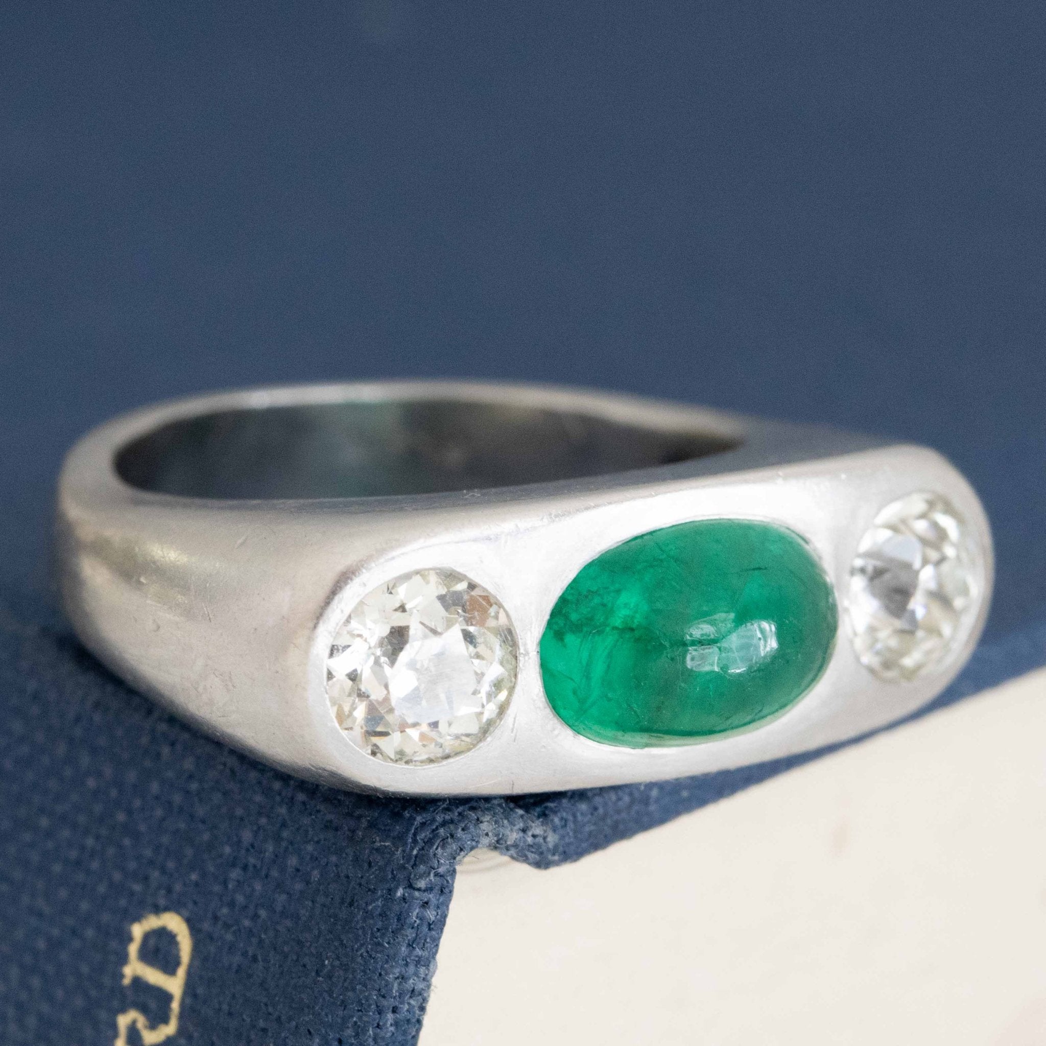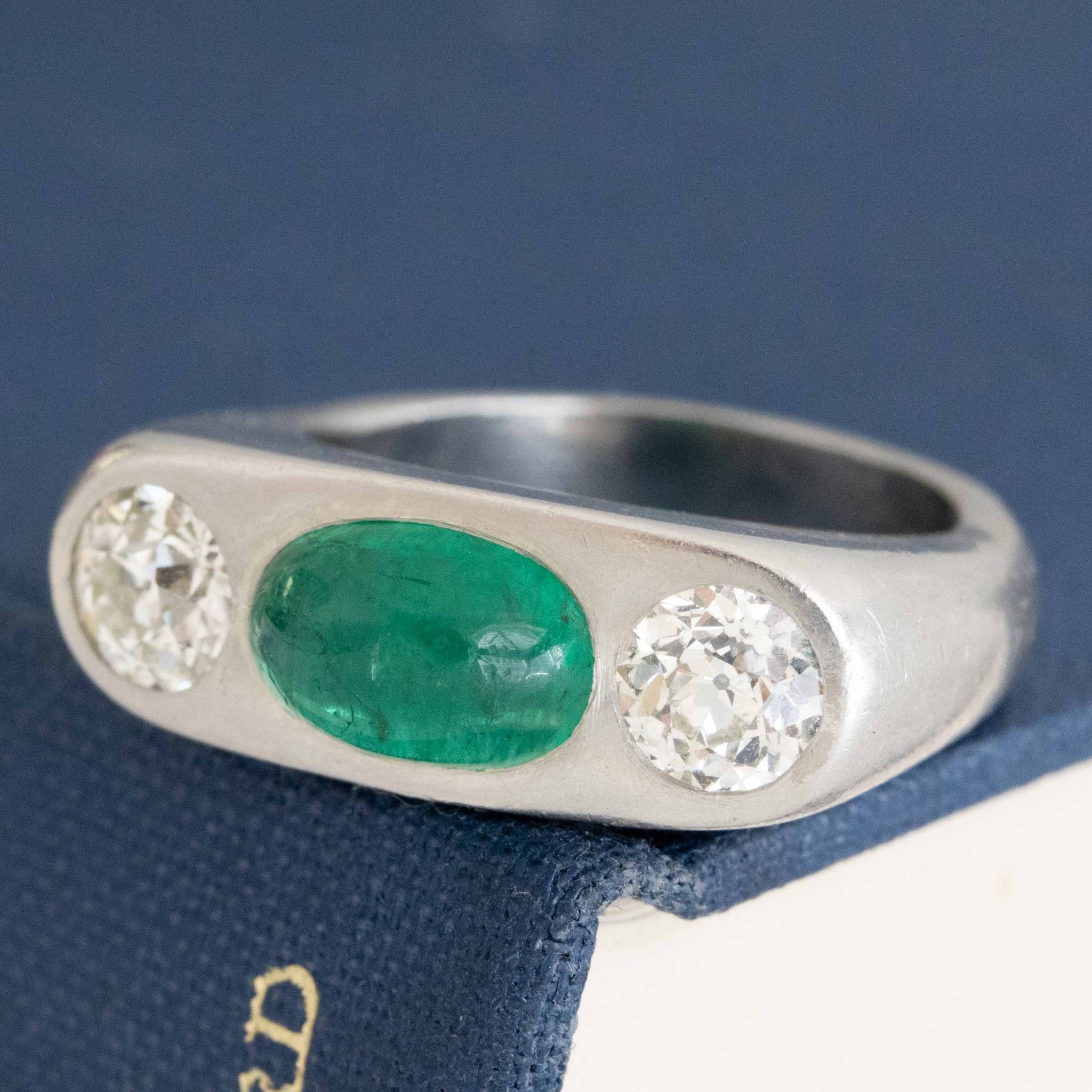 A most special vintage trilogy ring with a super bright and richly-hued cabochon emerald (GIA certificate confirms its origin being Russia) in platinum. Another gender-free ring option - super chic and timeless. The ring's patina only adds to its charm, not to mention its nice heft! Low set and just so elegant on the finger.