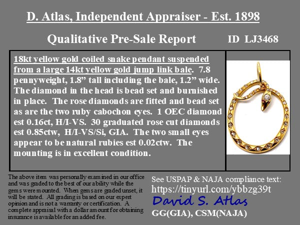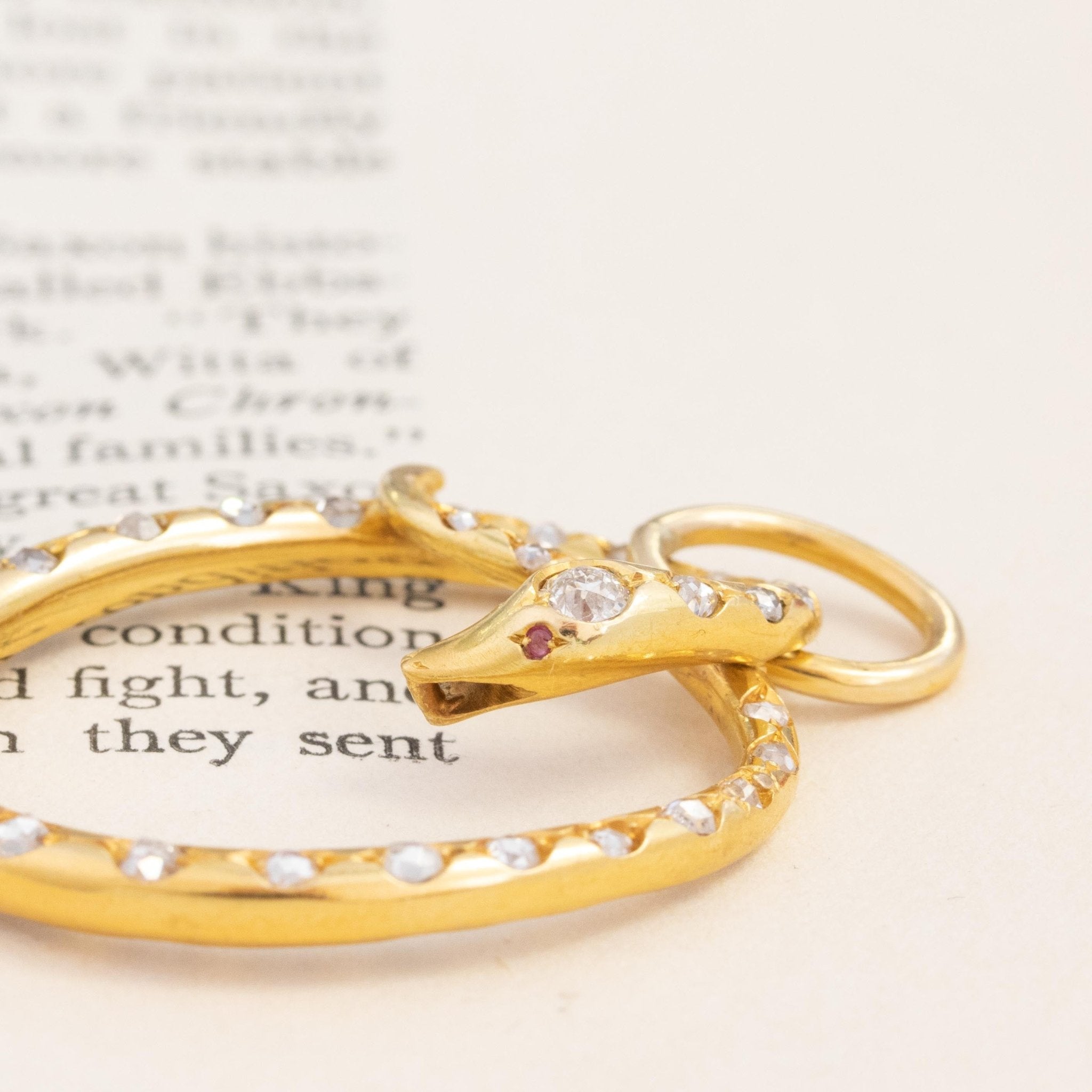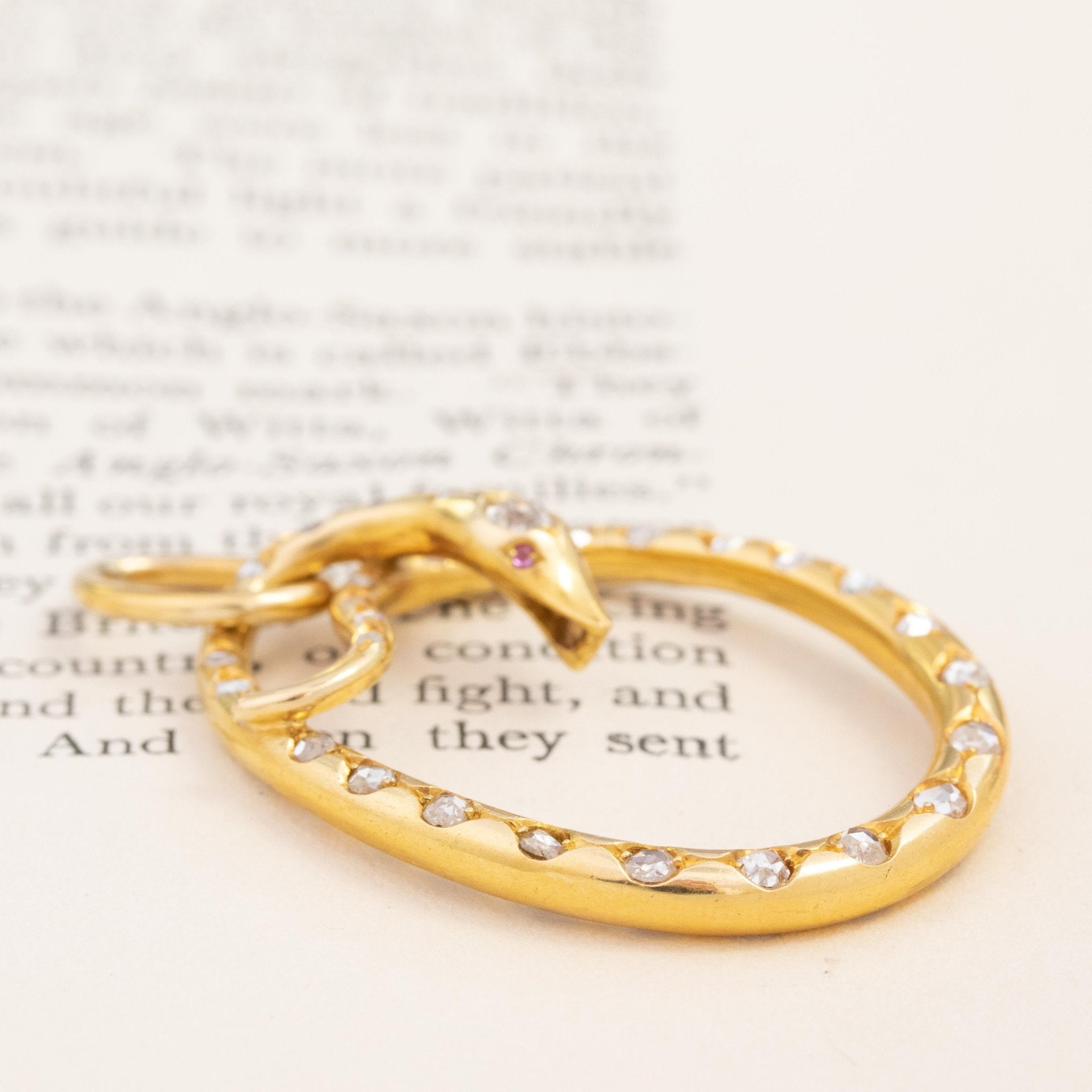 One of the sexiest serpents we have the pleasure of offering of late! The love the bolder size, the rose cut diamonds shimmering softly on its body, and the chonky old mine cut on its head. A solid 187kt yellow gold piece, the pendant is a great example of a vintage jewel with modern vibes!