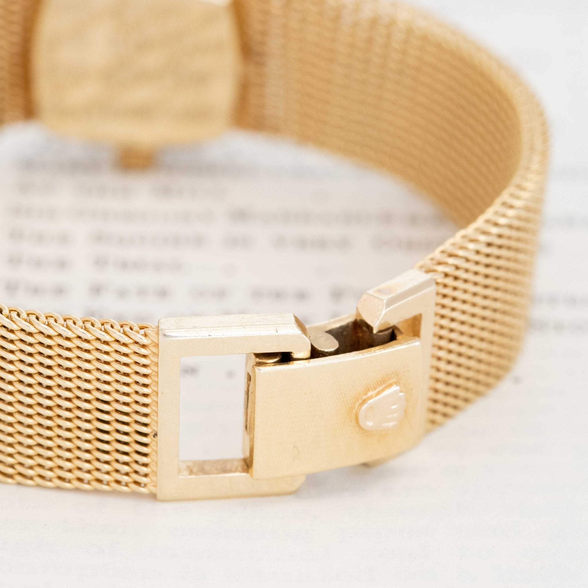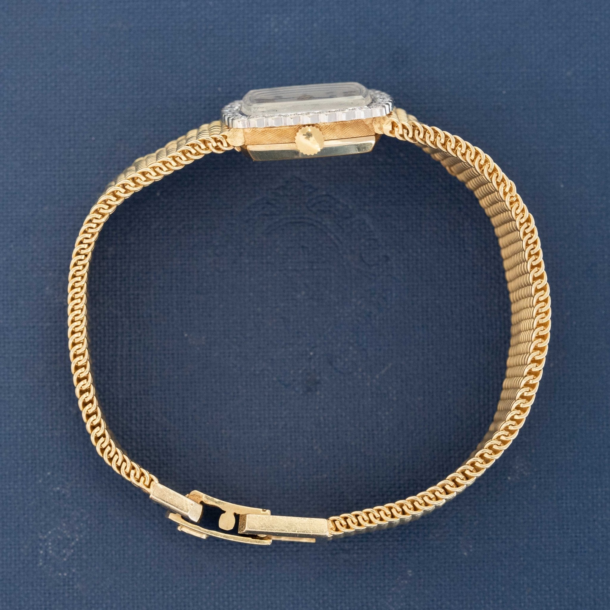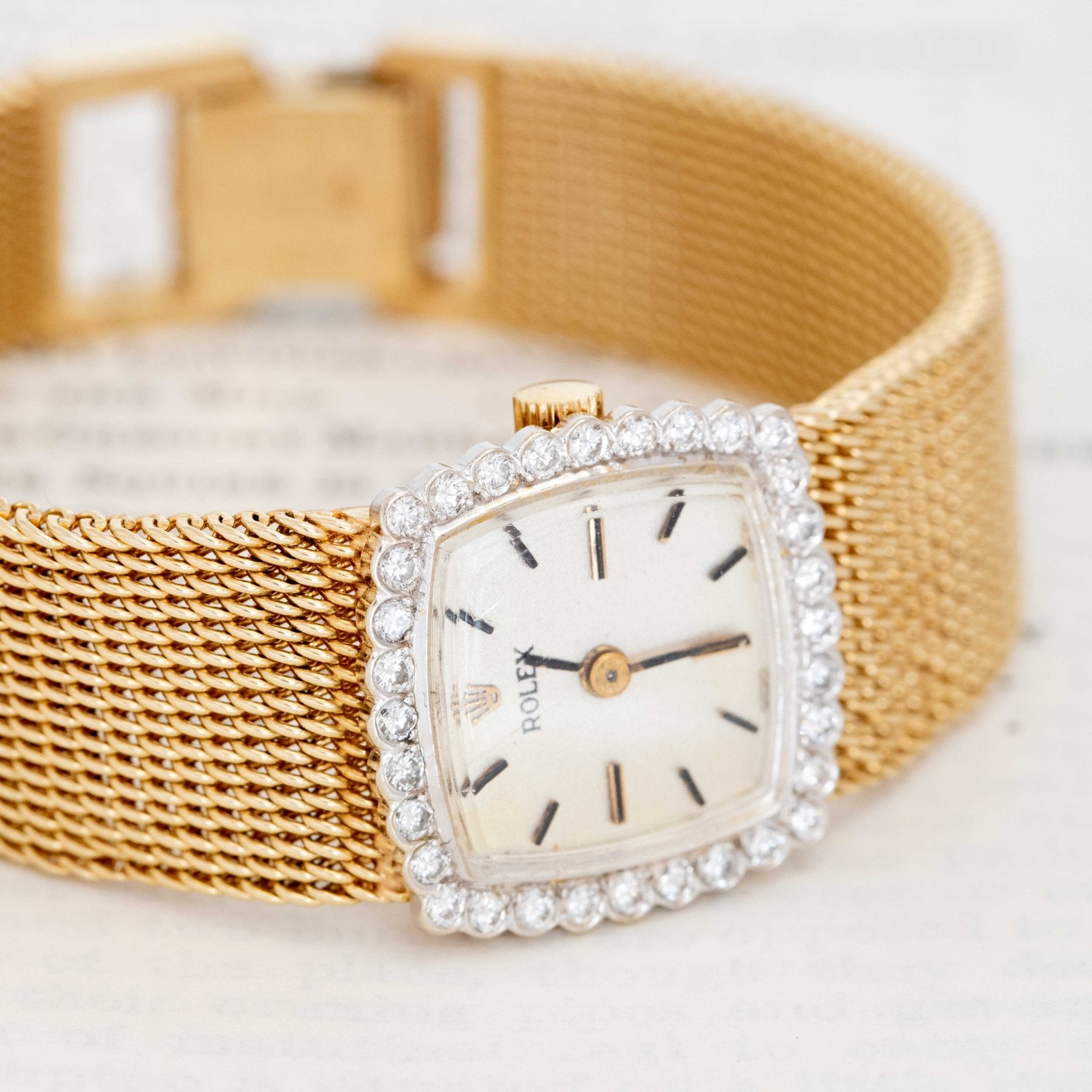 A vintage gold and diamond Rolex watch - classic in its' make and design, making for the perfect timepiece! The strap is a chunky, woven gold situation with a cushion-shaped dial and diamond-studded bezel. It has an excellent presence on the wrist and we love how I sits solo or stacked with a gold link bracelet.