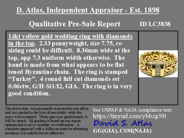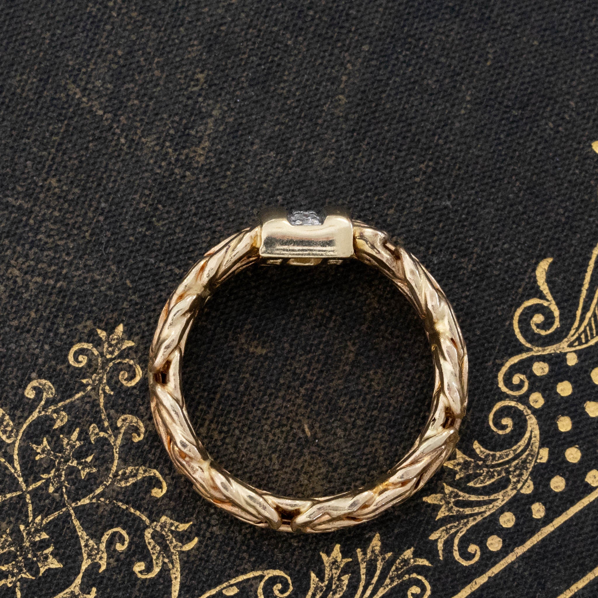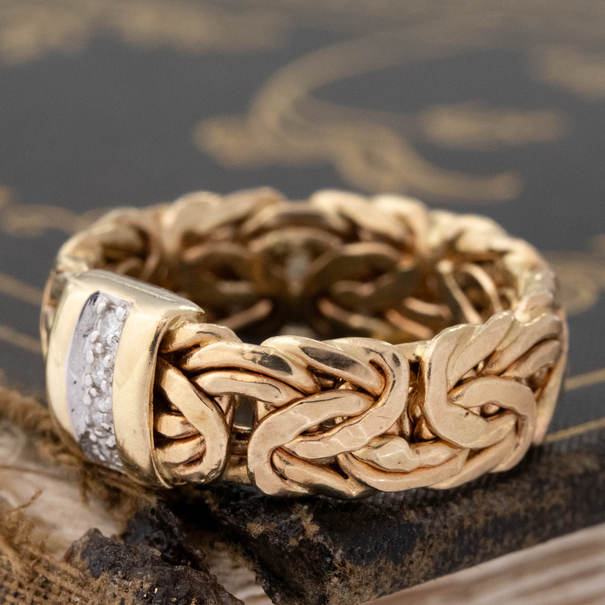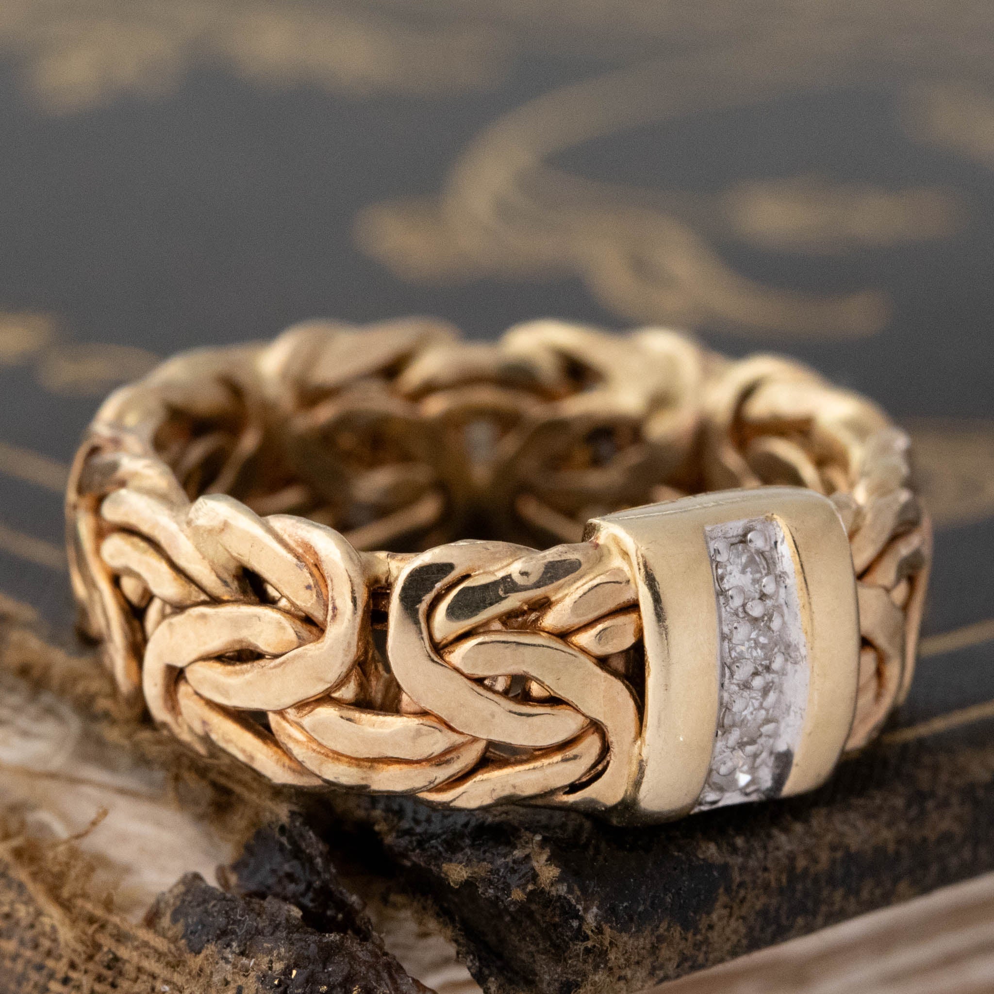 A unique gold band with a woven design motif and diamond detail! Perfectly chunky and bold, comfortable to wear solo or with other rings.