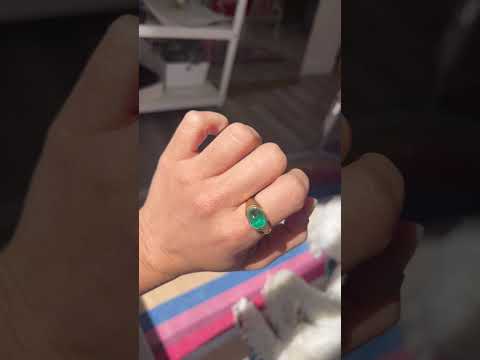 One of the prettiest natural emerald rings we have seen of late! The emerald has the prettiest jolly rancher green color - super vibrant and simply glows. Set in a classic 18kt chunky bezel ring, most likely to be from the 70s/80s, with grooved shoulders. Just fabulous and oh-so chic all around!
