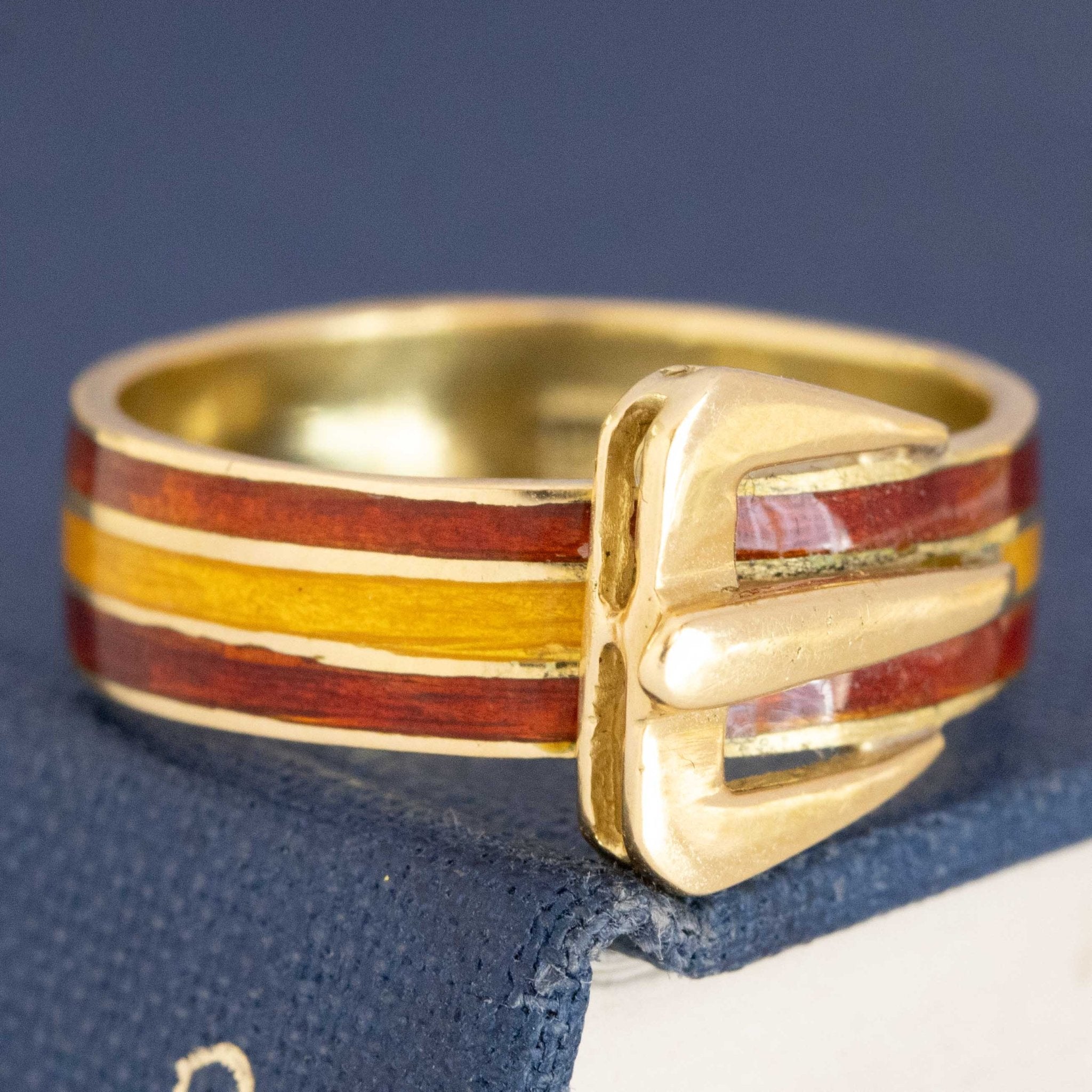 A sleek but bold buckle, with three rows of enamel in a delicious colorway. The enamel and tones are giving 70's Gucci in the best way: luxe Italian vibes and a chic gold moment.