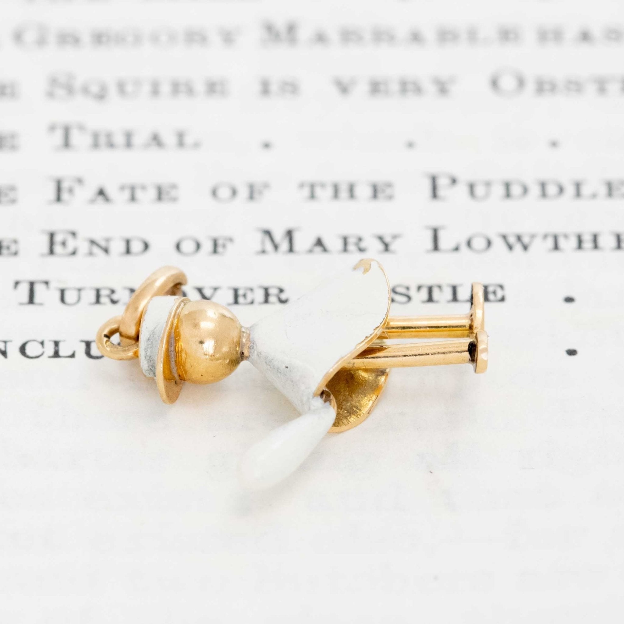 A charming mid-century gold and white enamel figural charm, likely depicting a French police officer, rendered in a playful, folk-inspired style. The figure features a flat-brimmed uniform cap and an outstretched arm holding what appears to be a baton, a common identifying detail in European occupational charms of the period. Beyond adorable!