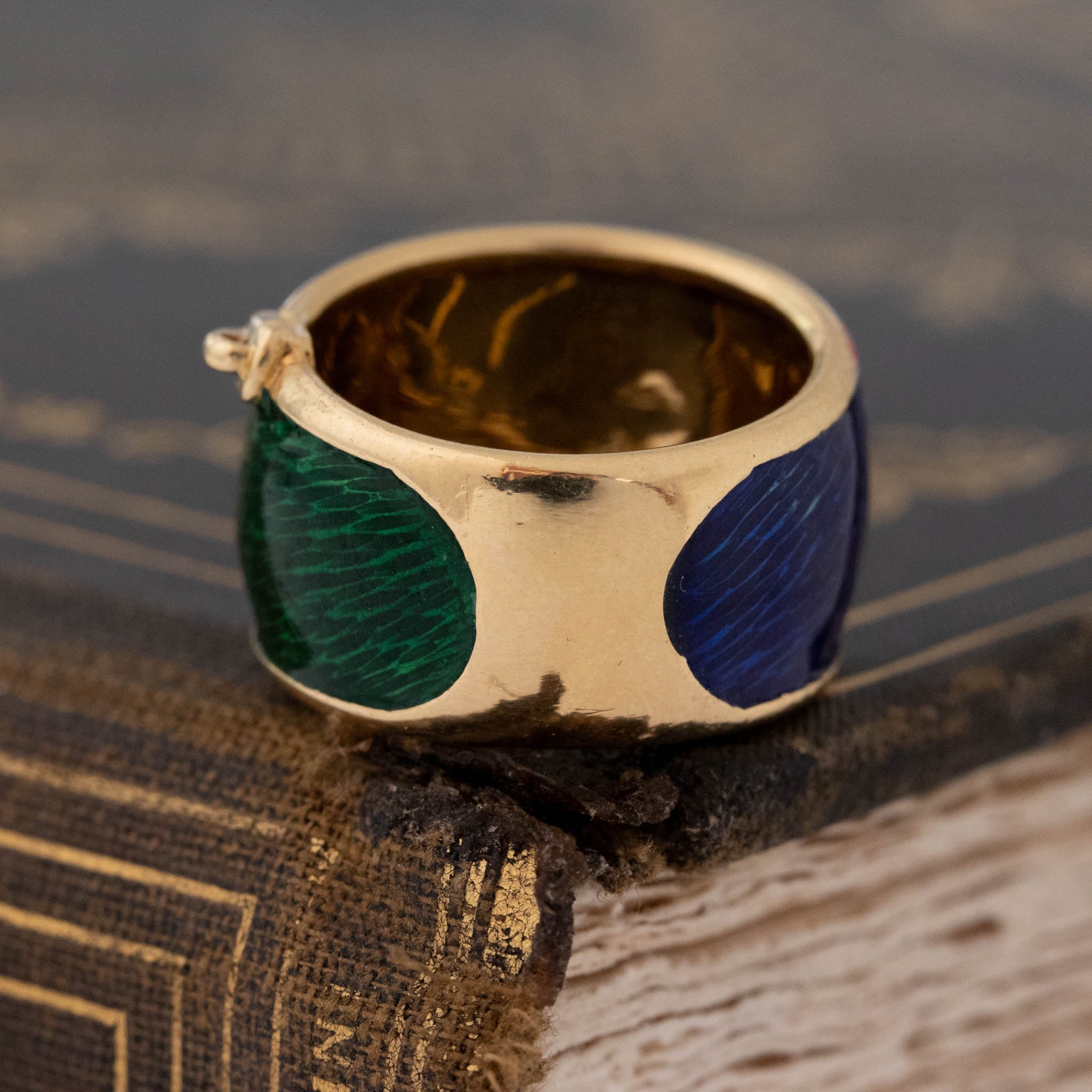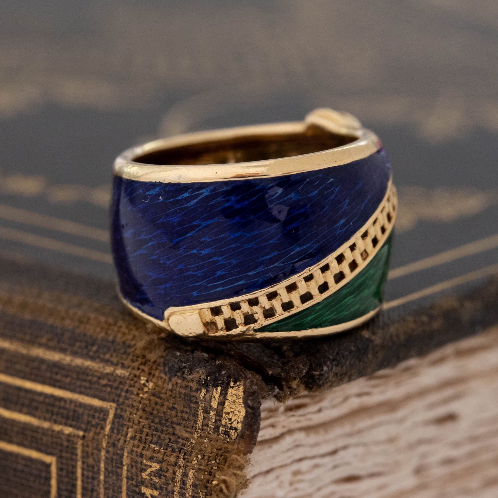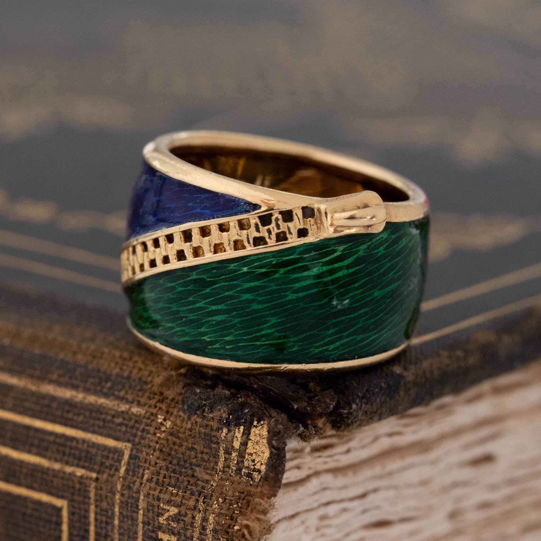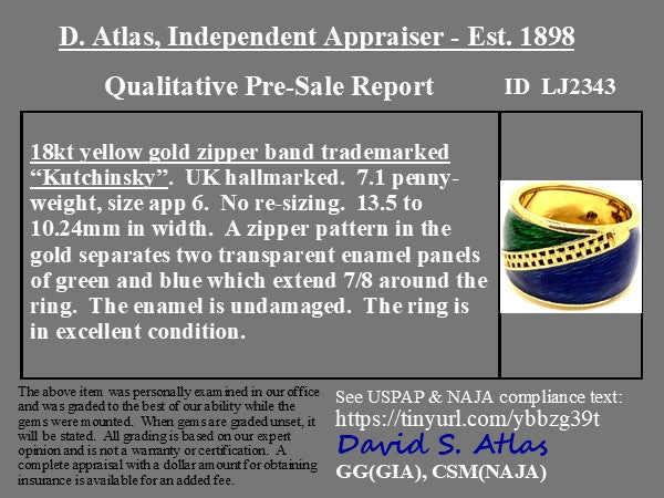 A highly collectible "zipper" ring by London-based Kutchinsky. Often referred and compared to David Webb, Kutchinsky is a polish immigrant who found great success in the UK, opening its doors in 1893, remaining popular to this day.