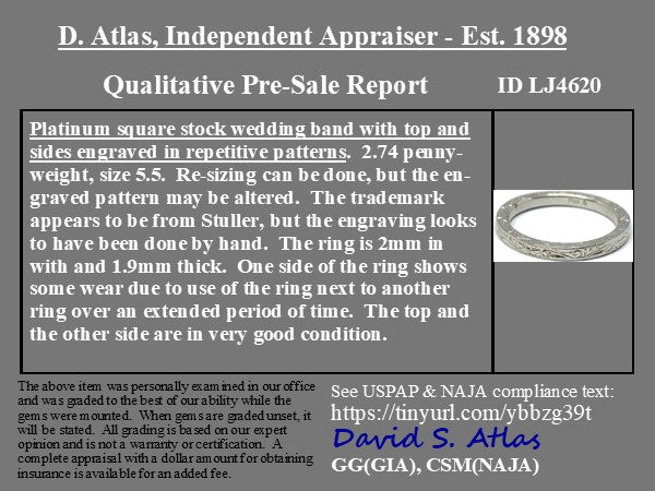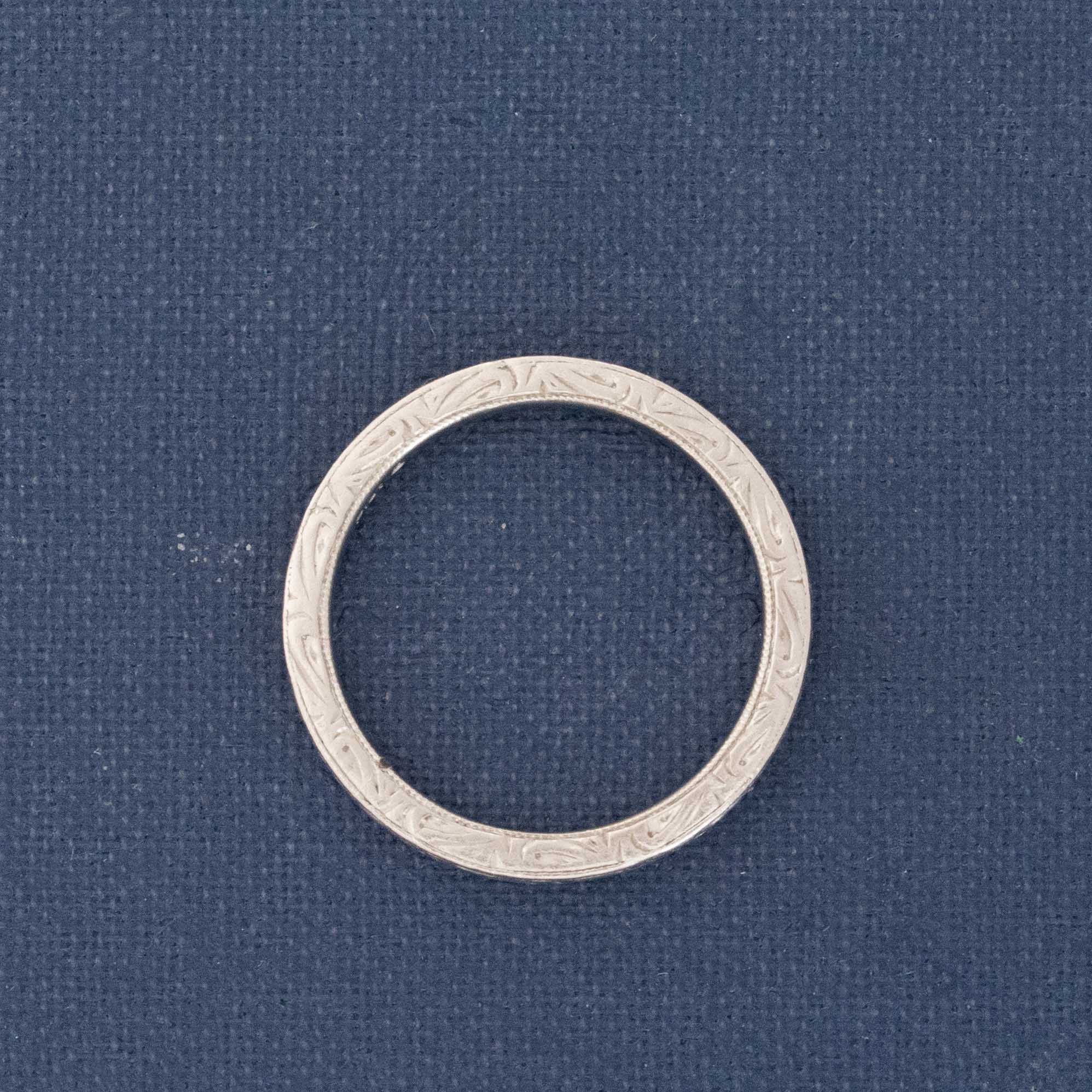Charming and beautiful antique platinum band, with gorgeous engraved details all throughout. Will stack perfectly with your engagement ring, or other bands.