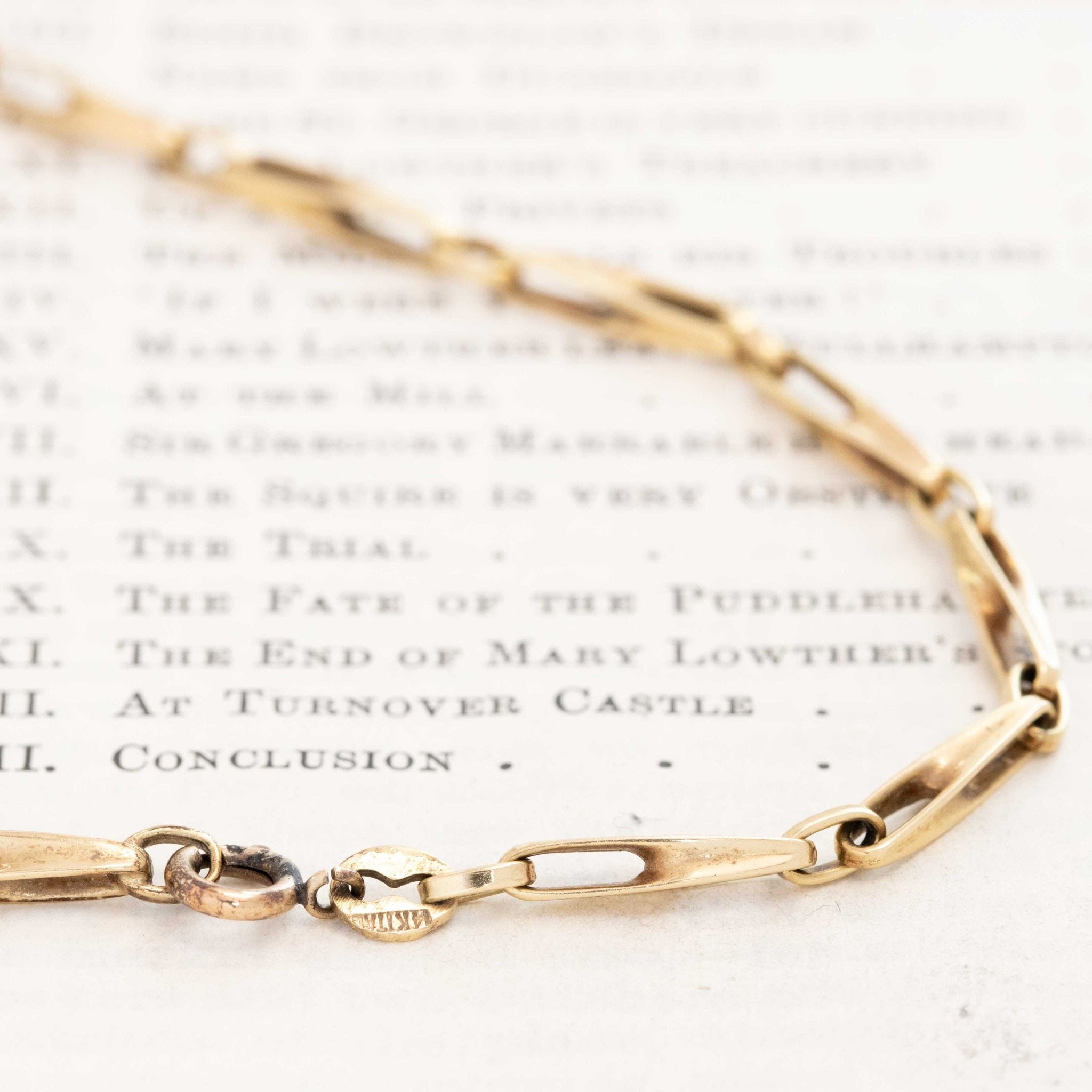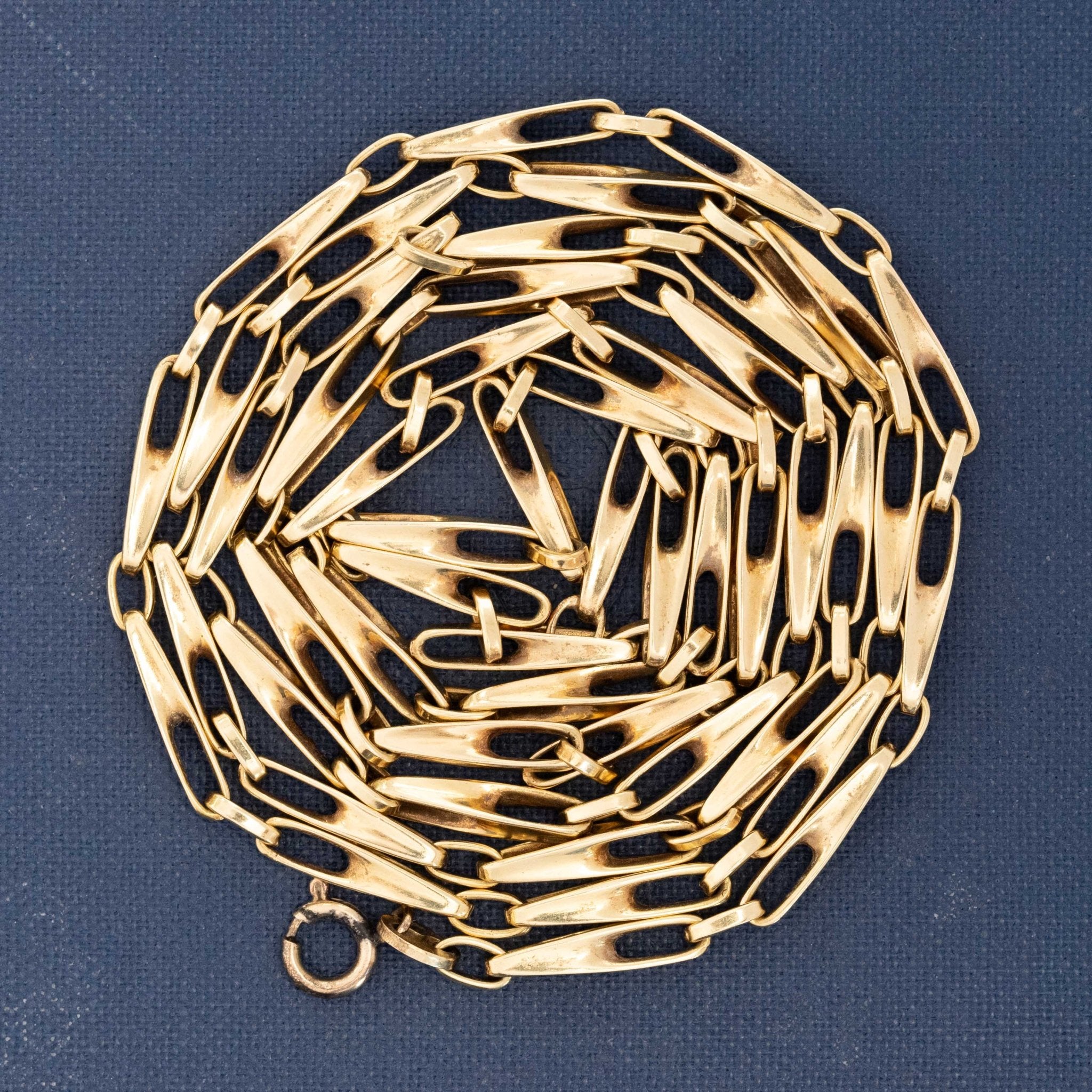 A charming fancy link chain with elongated bar situations - slinky, long, and oh so perfect at 32" in length! It feels sturdy and weighty but in an elegant, slender link which pairs wonderfully with pendants and other chains.