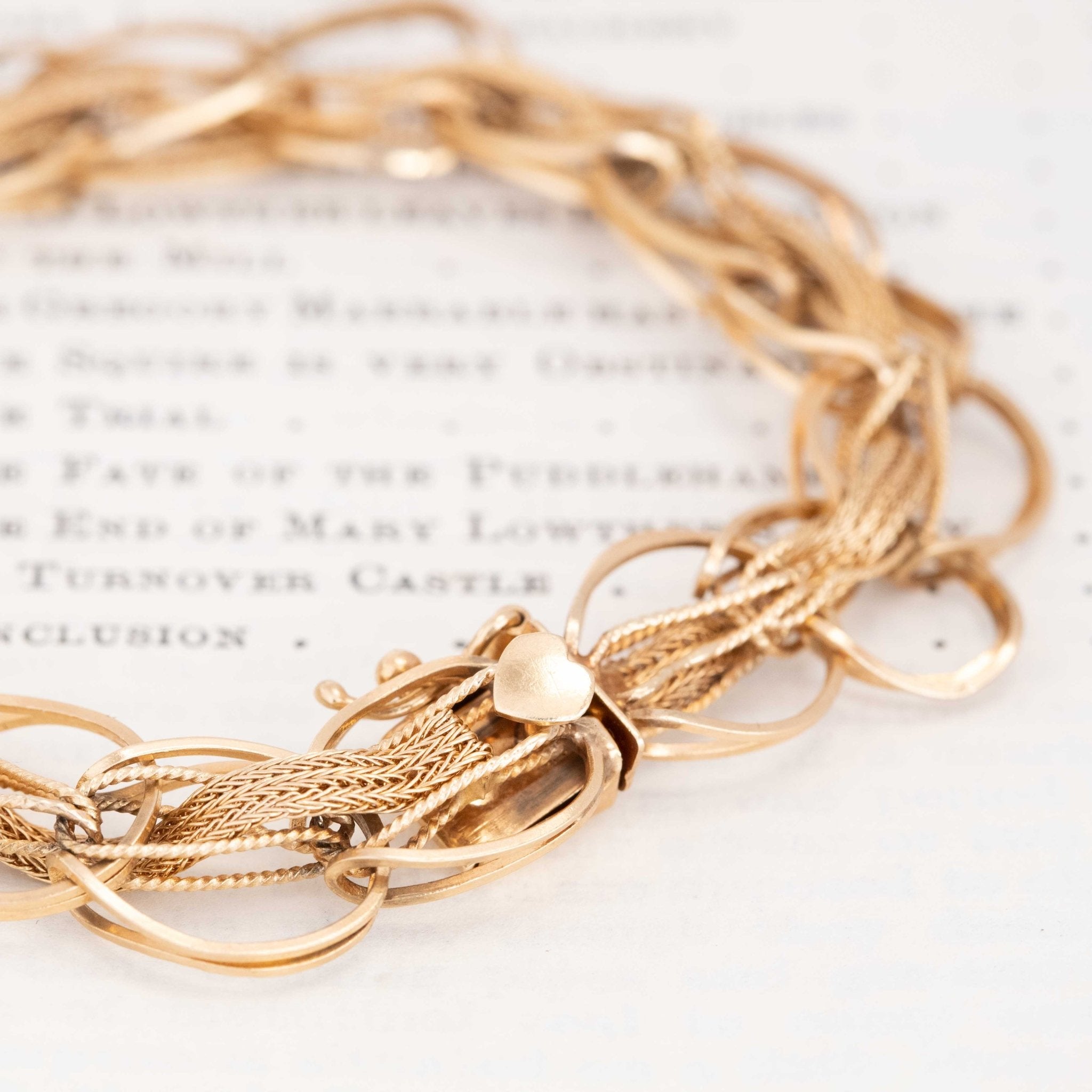A 1950's/60's gold heart link that lived its first life as a charm bracelet! We've never seen a chain or link quite like this guy - a combination of open, jumbo-sized wire links wrapped together with a woven, almost ribbon-like section in the center. It makes for quite the unique wrist situation, and that little gold heart on the box clasp is too sweet.