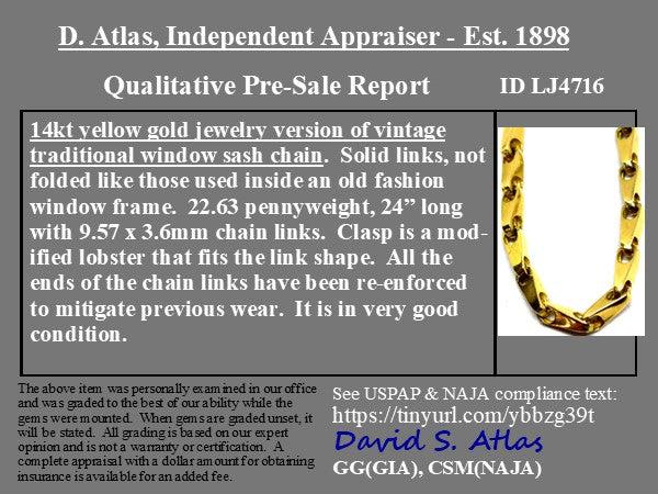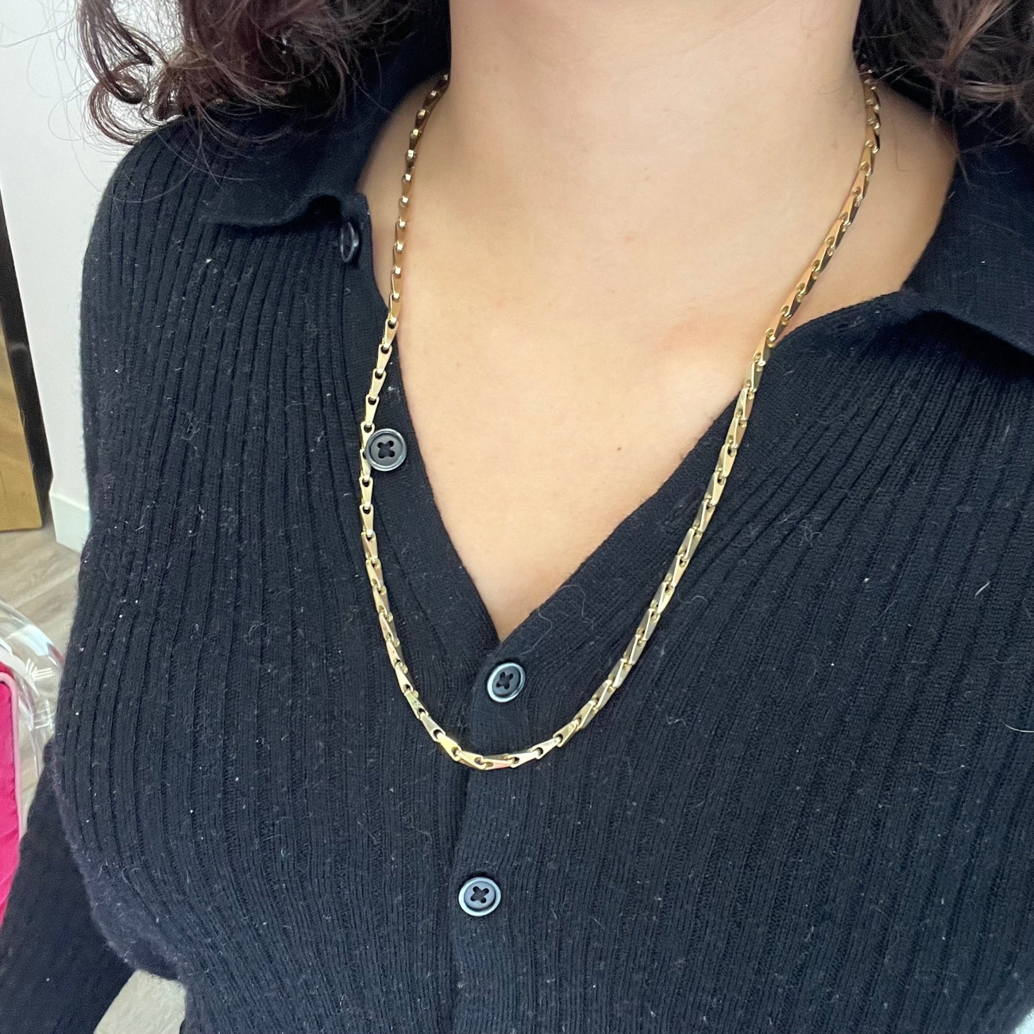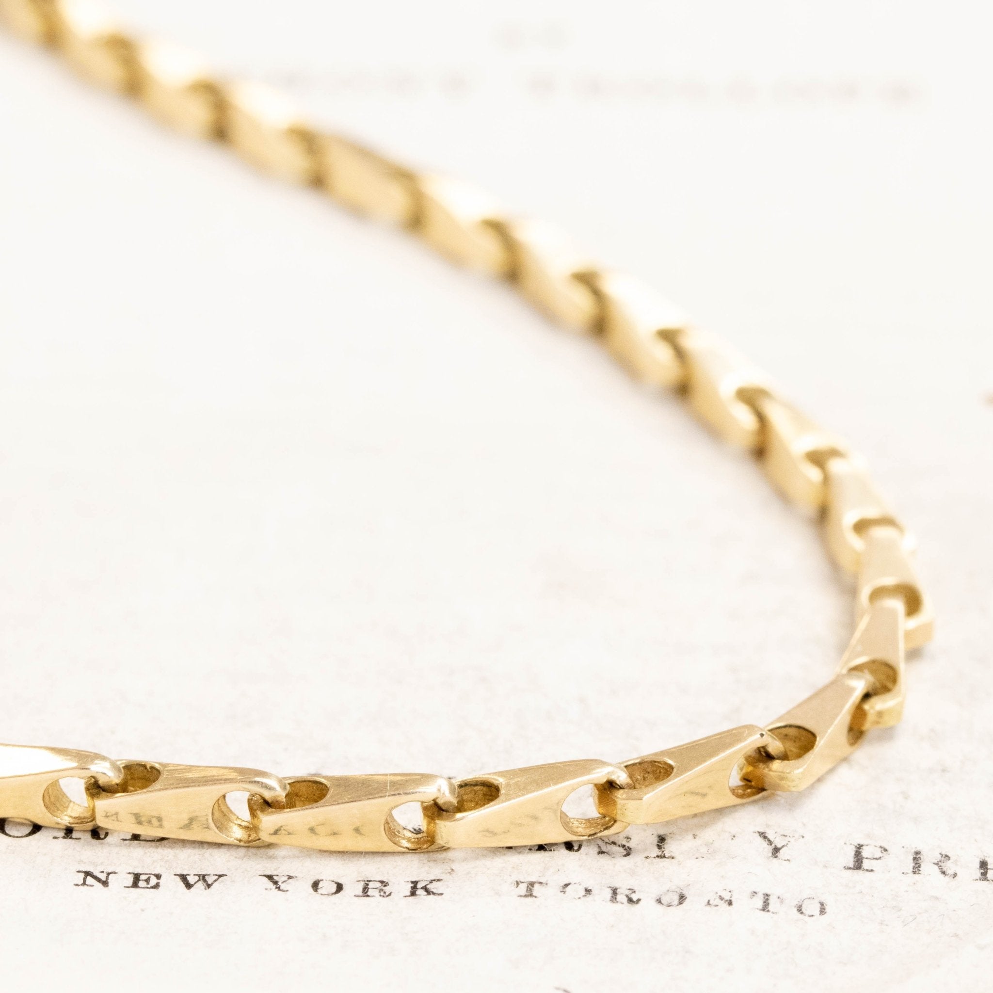 In the style of vintage window sash chains, this vintage and lefty gold chain is not just incredibly beautiful but also one of a kind! Gorgeous tapered links in solid gold, with each one looking like a zipper pull. Beautiful worn on its own, or layered with other pieces.