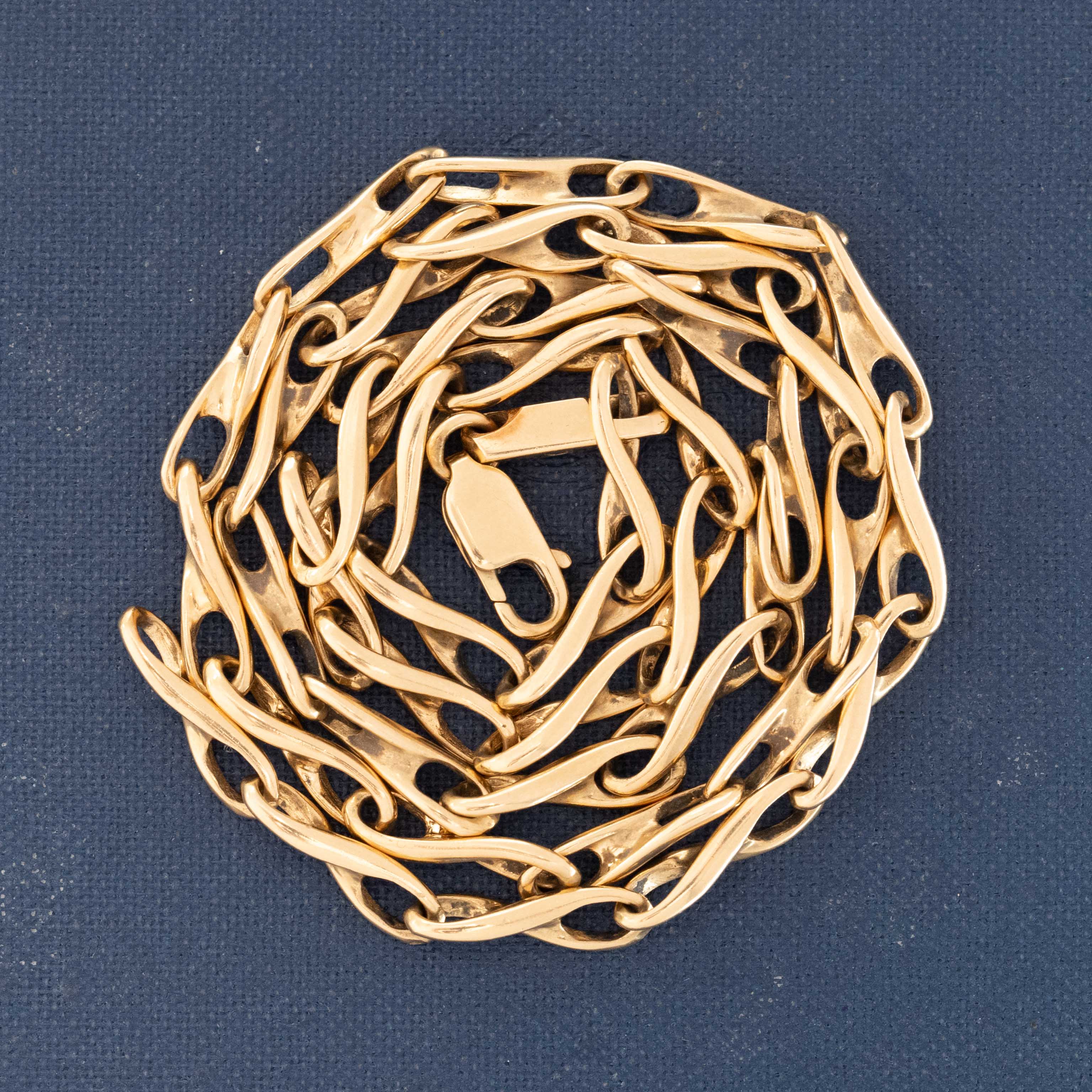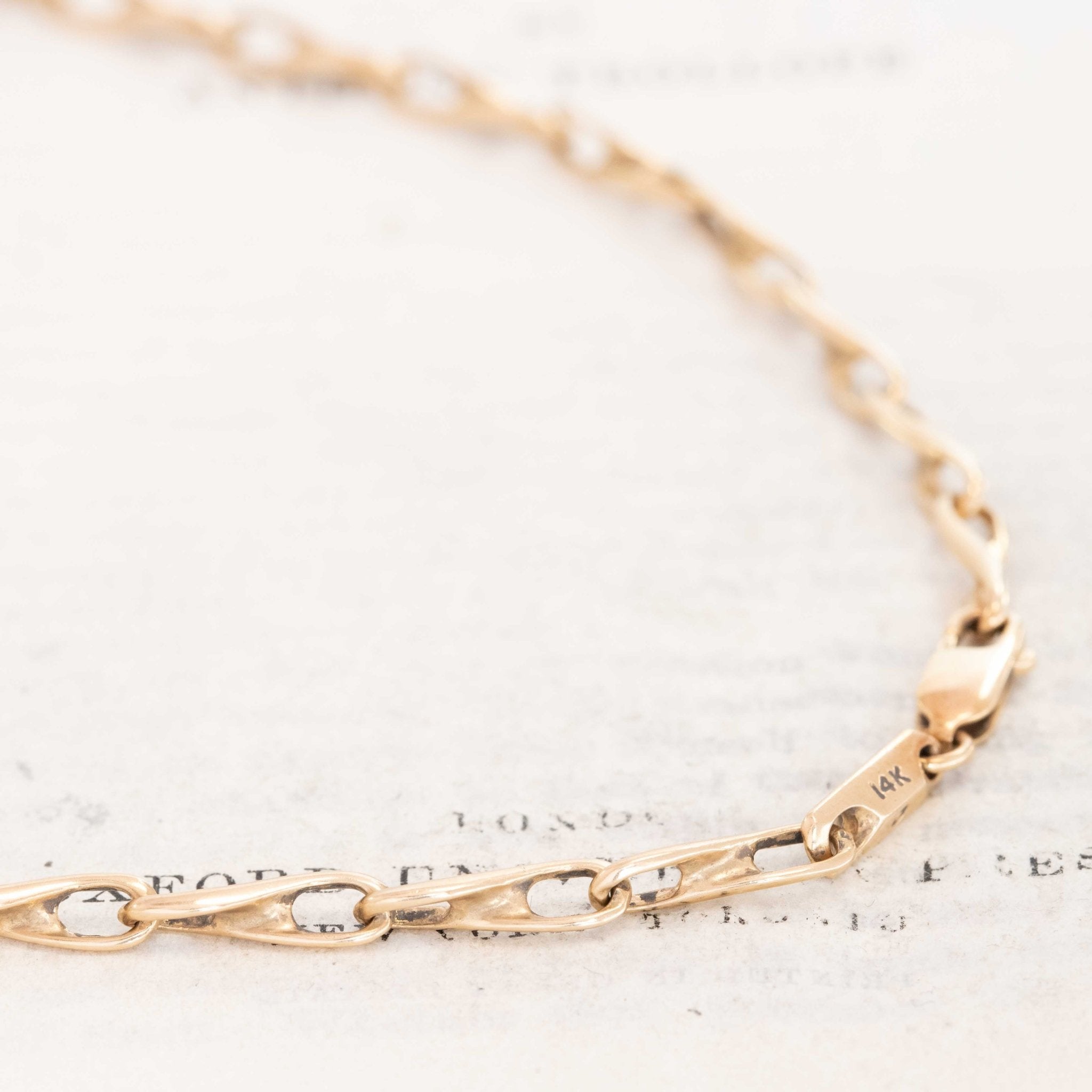 A golden fancy link chain, elongated in make and quite pretty when worn! I love a unique link, I find them to add so much character and charm to a neck stack. This one is detailed enough to look present on its' own, but also would be a great anchor for a jumbo pendant or medallion.
