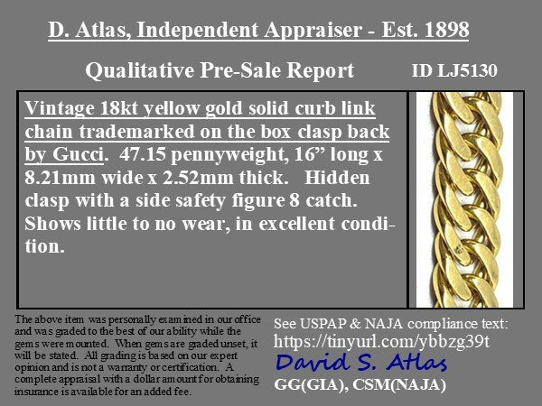 Made from rich 18kt yellow gold, the chain has classic curb links that are flattened, tightly interlocked, and polished so the necklace rests smoothly on the skin. Gucci often used this style in the late 1970s and 1980s, when bold gold chains became a signature look and a symbol of power dressing, Italian glamour, and jet-set style.