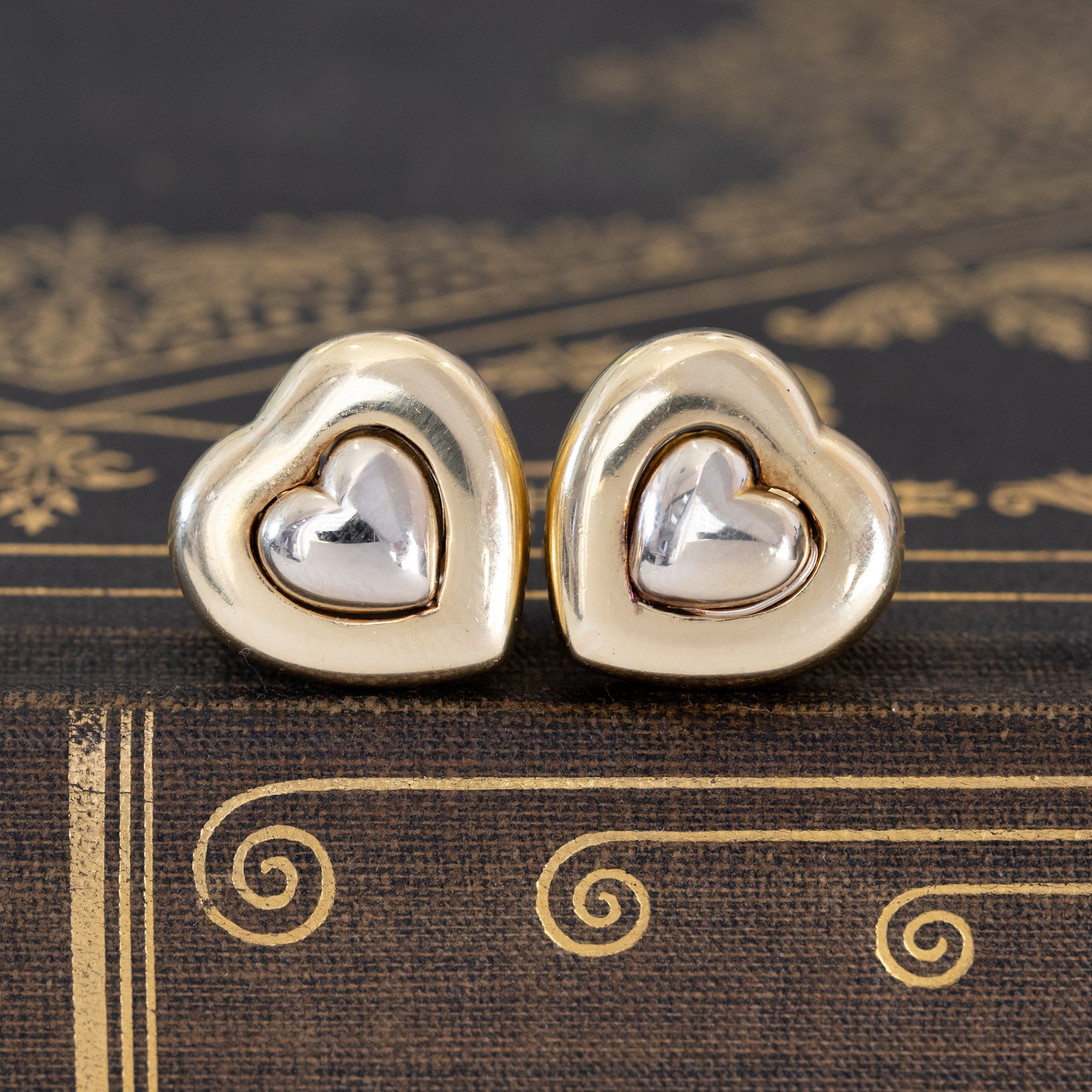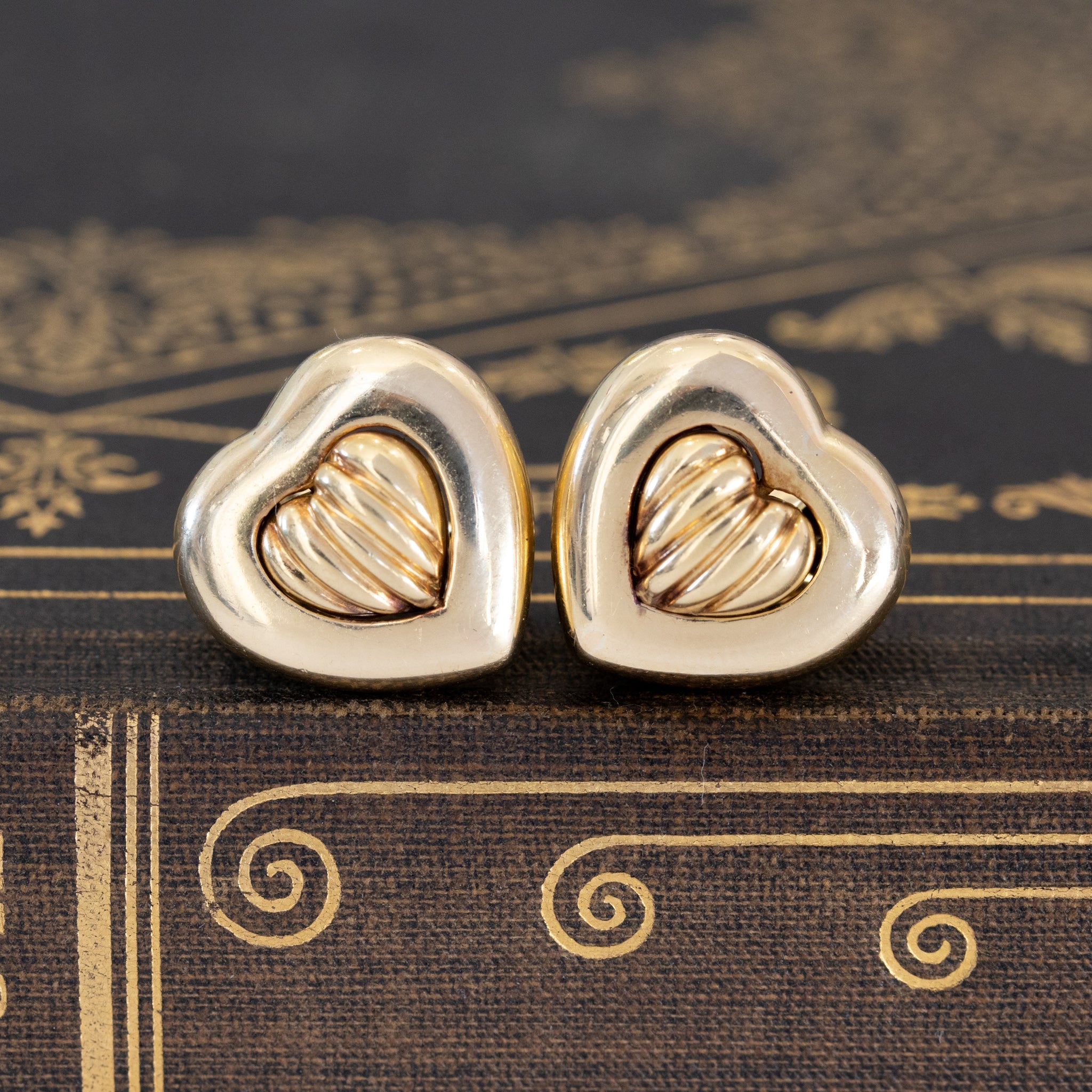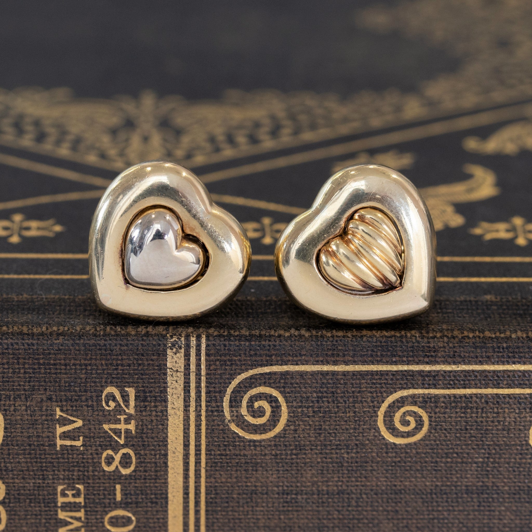 The inner hearts on this pair actually rotate to reveal to sides - one smooth, white gold heart and the opposite a yellow gold fluted side. We love a good convertible piece, making these perfect for switching up with your outfit and mood.