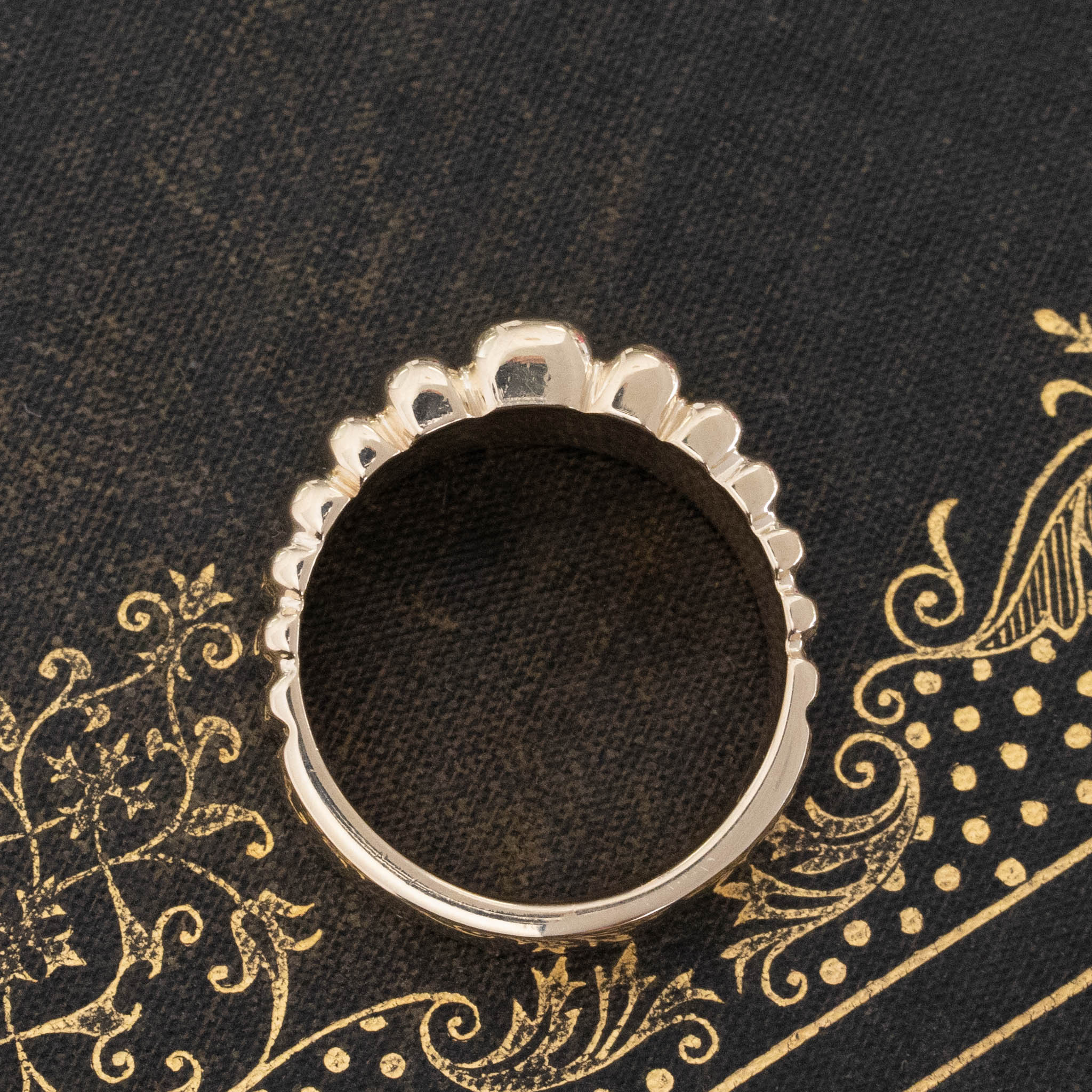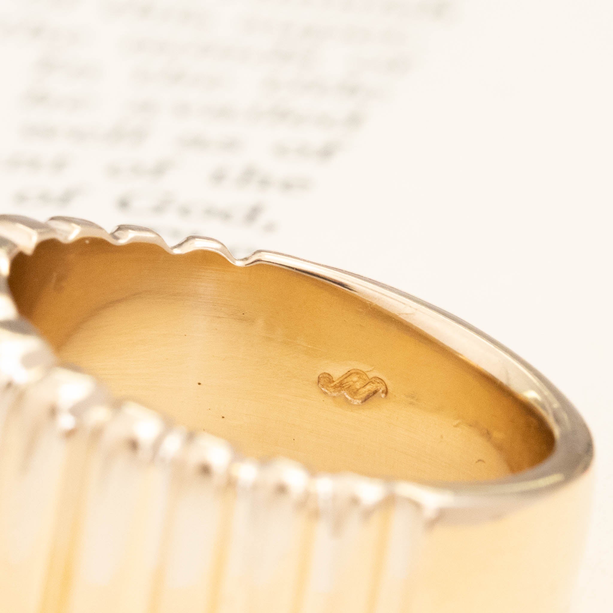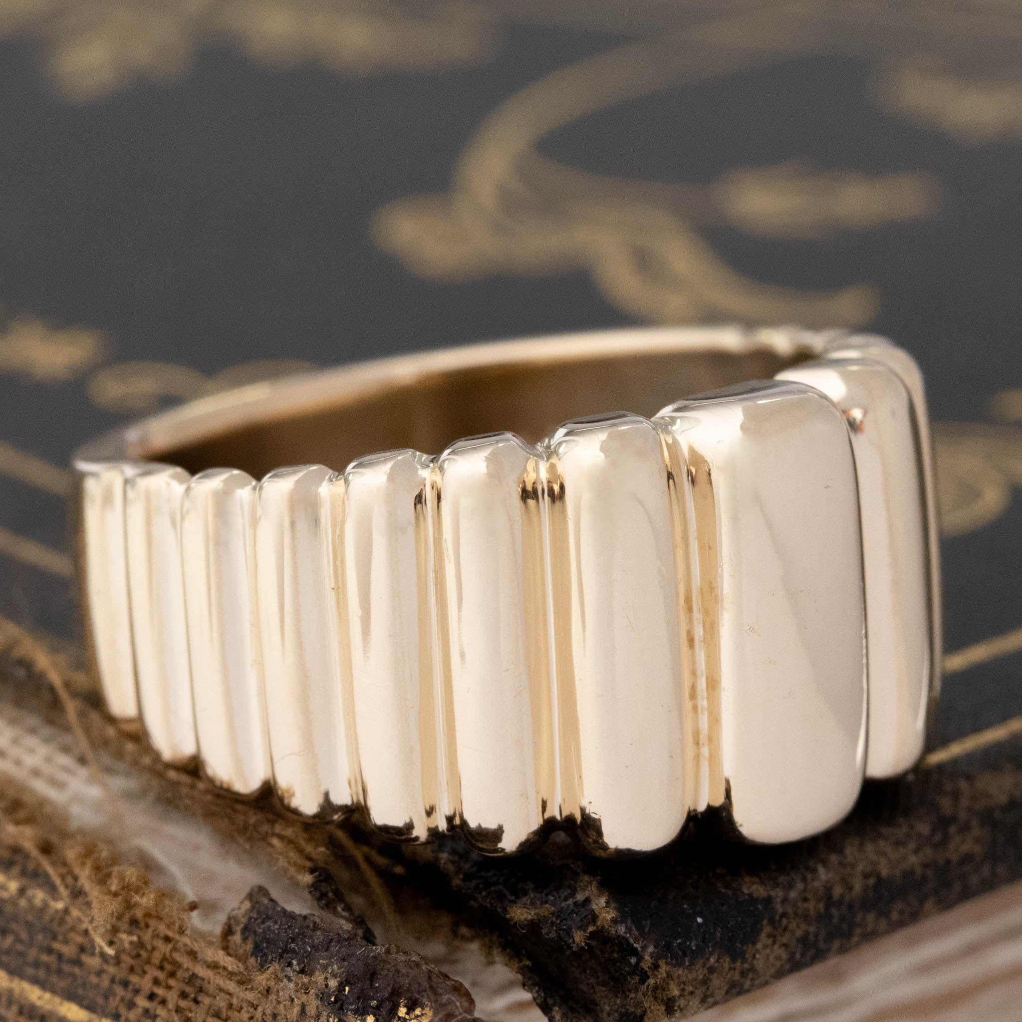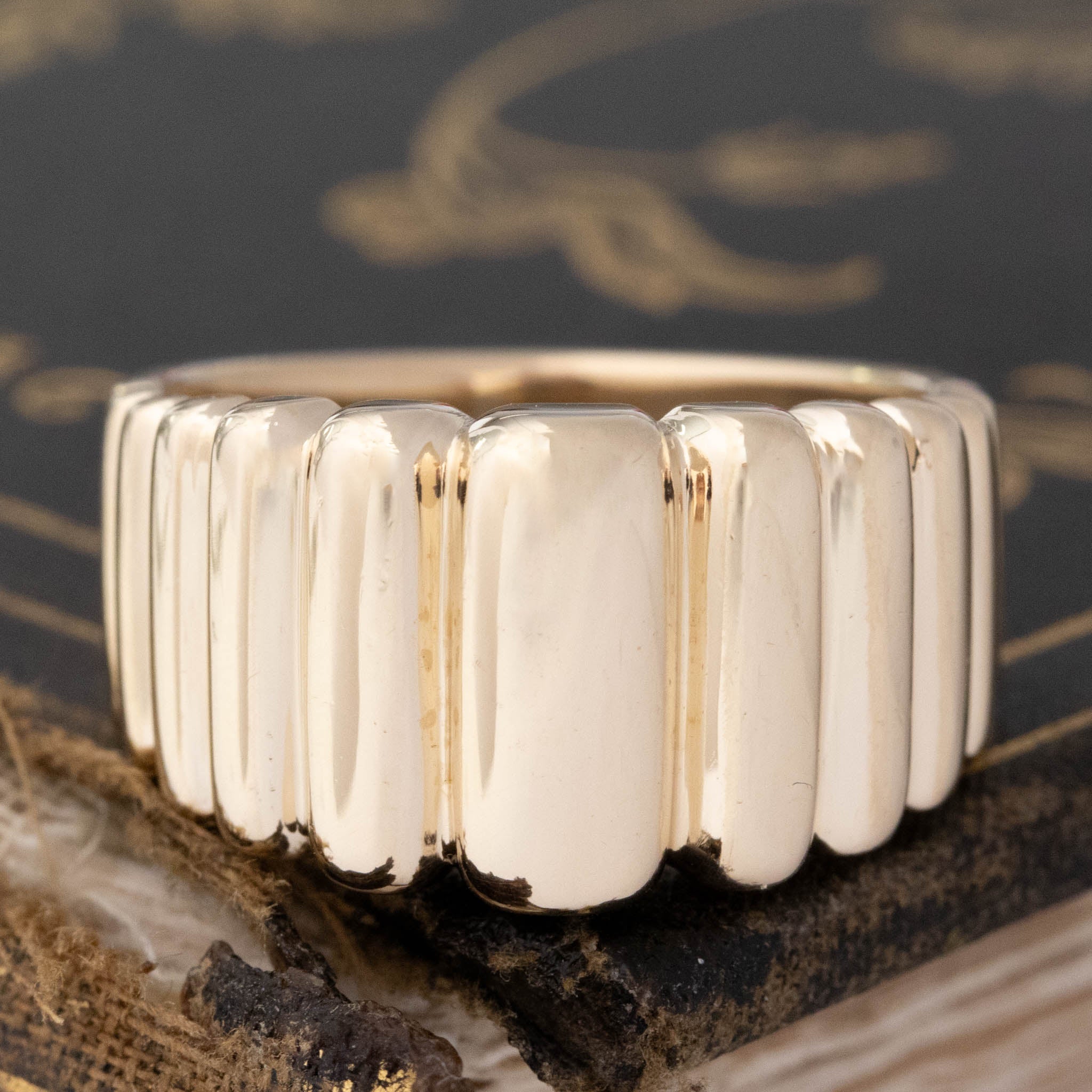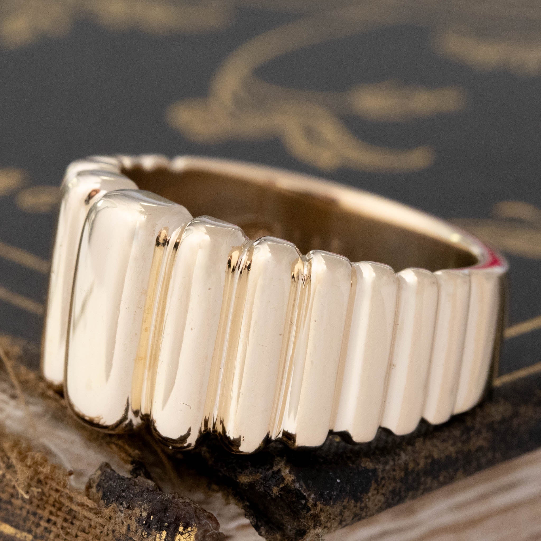 This chunky vintage grooved ring is a bold gold specialty, which we were instantly drawn to! She feels heavy and buttery, sliding on and off one's finger like gold. The wide but graduated fit makes for a set of armor on one's hands but in a much more comfortable way. Perfection!