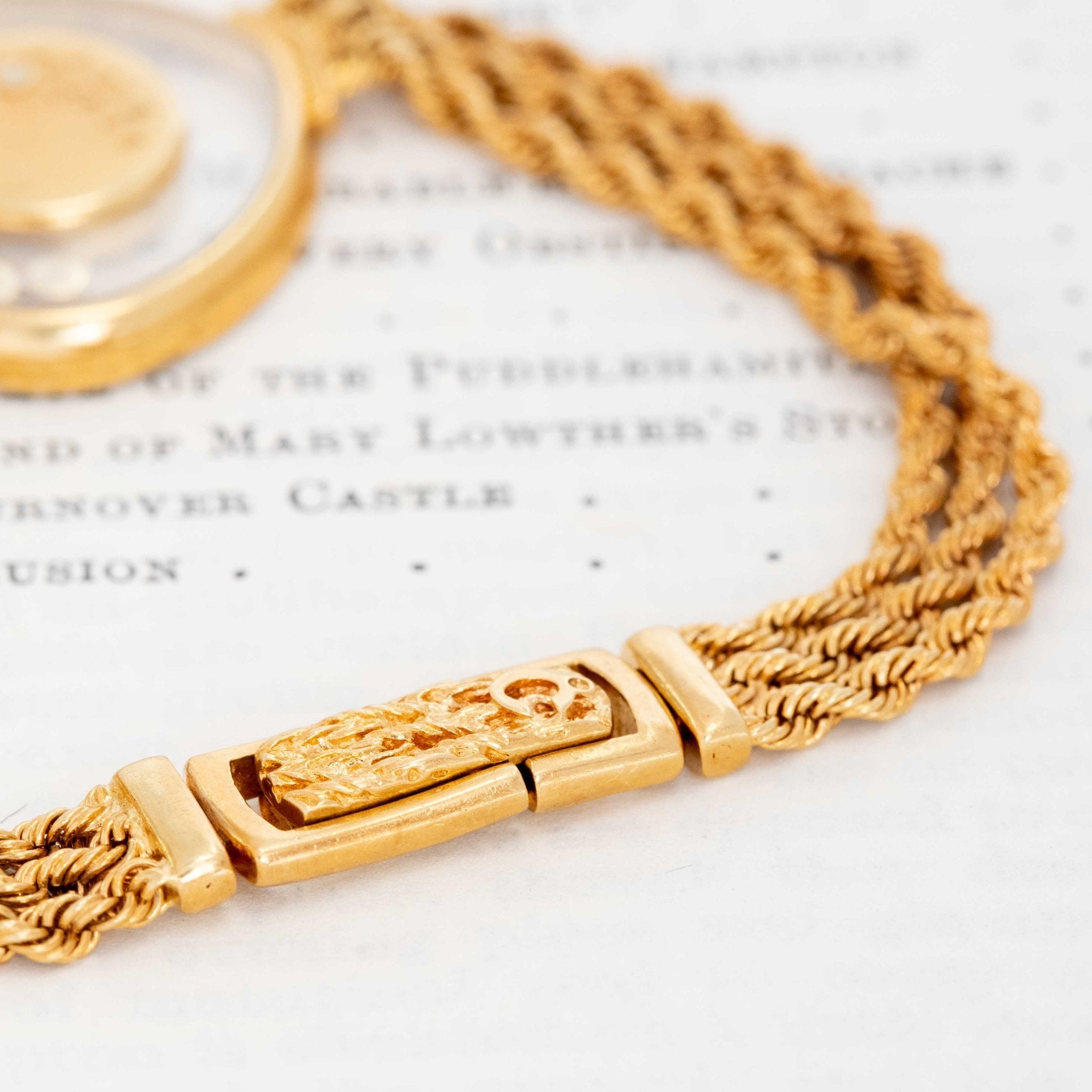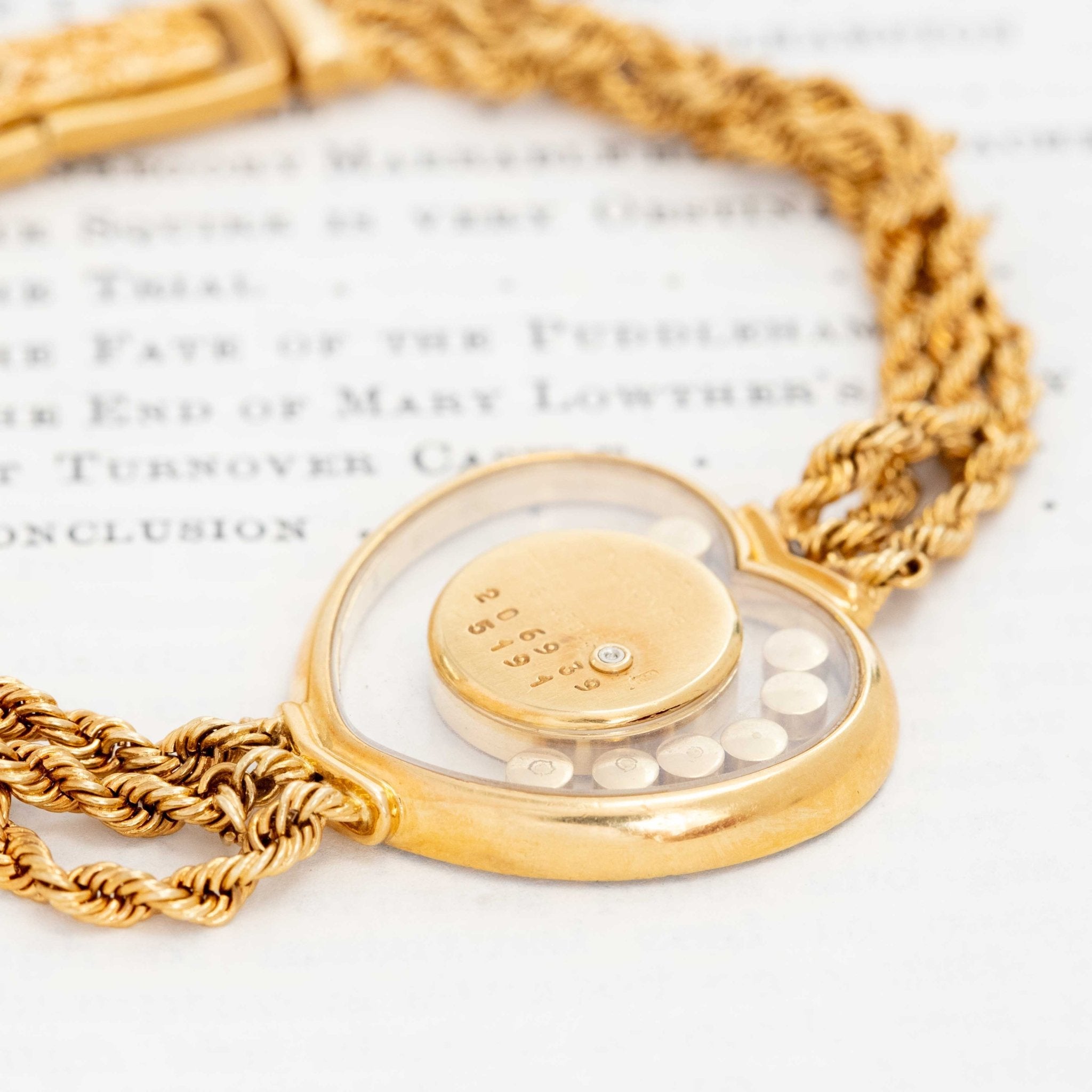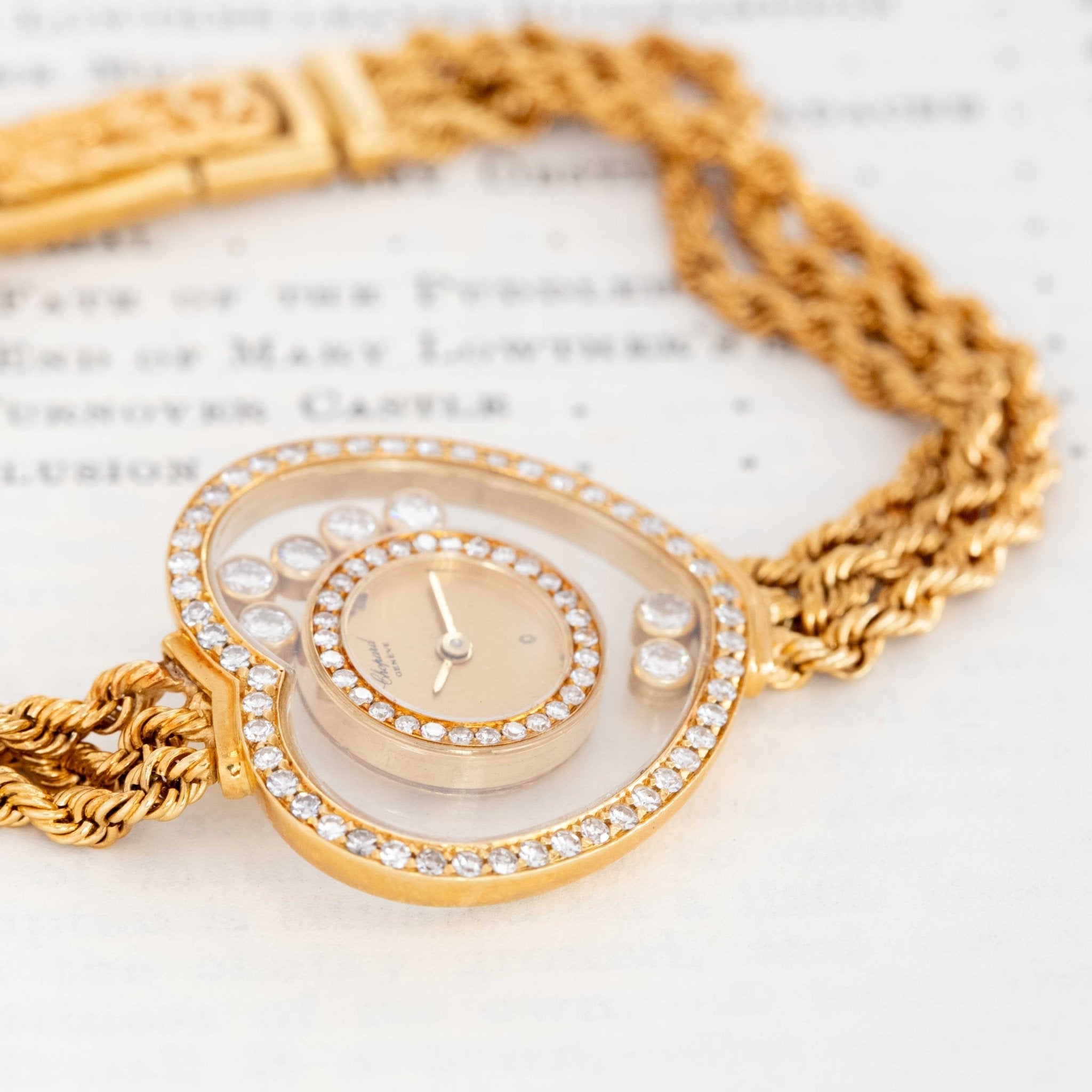Chopard's Happy Diamond Collection came to be in 1976, when it was first introduced as a men's watch design with bezel set, freely moving diamonds seated between two sapphire crystal faces, along a black leather strap. The concept took off immediately, combining Chopard's craftsmanship with a design rooted in a more playful and eclectic vibe.