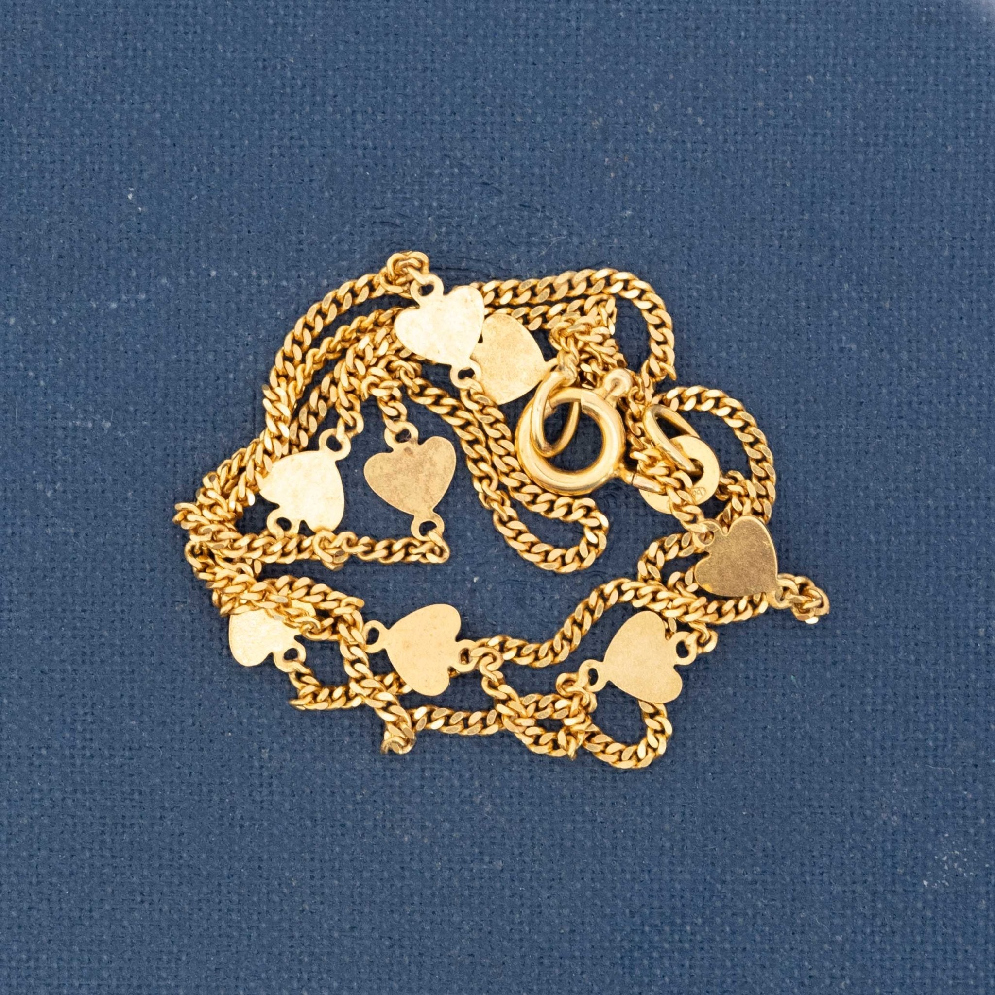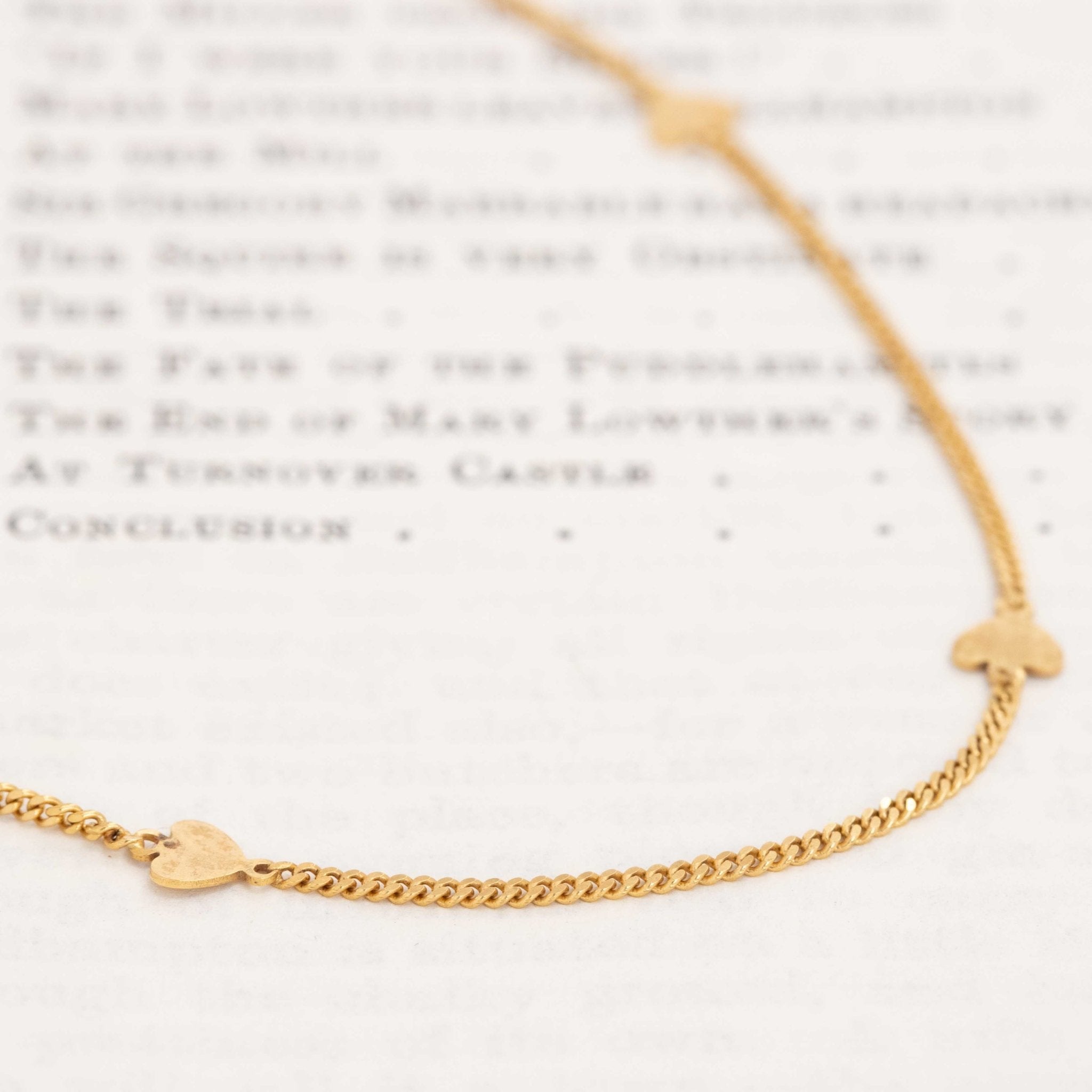 A sweetie pie gold station necklace with gold hearts peppered throughout this petite curb link chain! 15" in length, she is an excellent daily piece and would sit nicely solo or stacked with other chains.