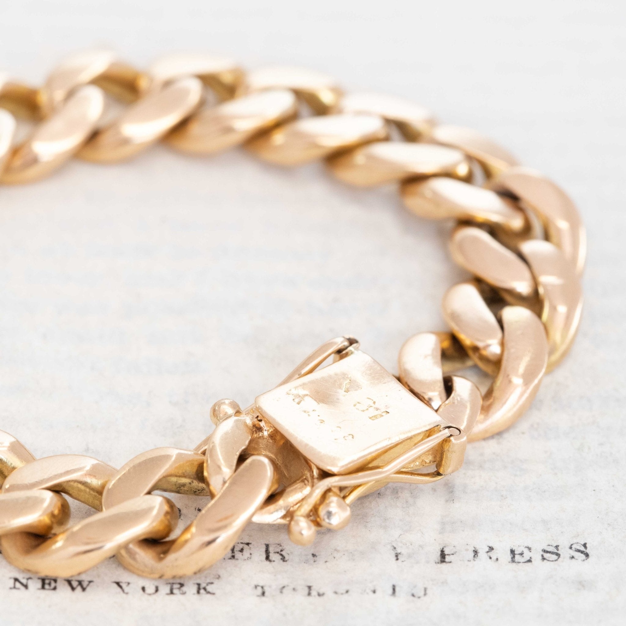 This solid gold curb link bracelet is too classic, beautifully made, and hefty beyond belief! She comes in at just about 11.5mm in width and 71.6 grams, perfect for anchoring the rest of your wrist stack or for solo wearing. Either way - it'll become your new favorite piece, as it is everything one would want a curb link bracelet to be.