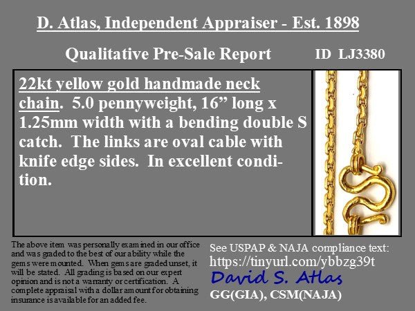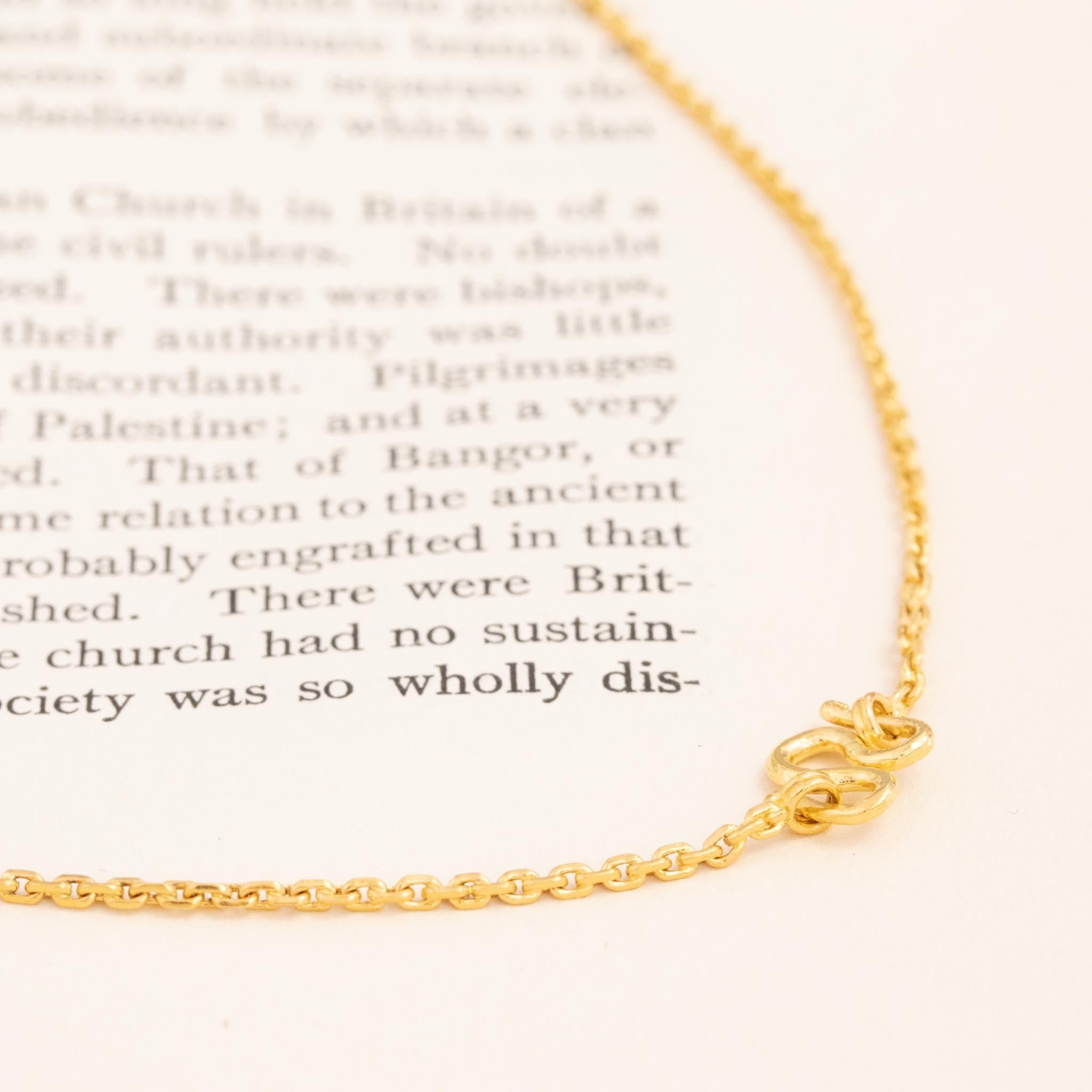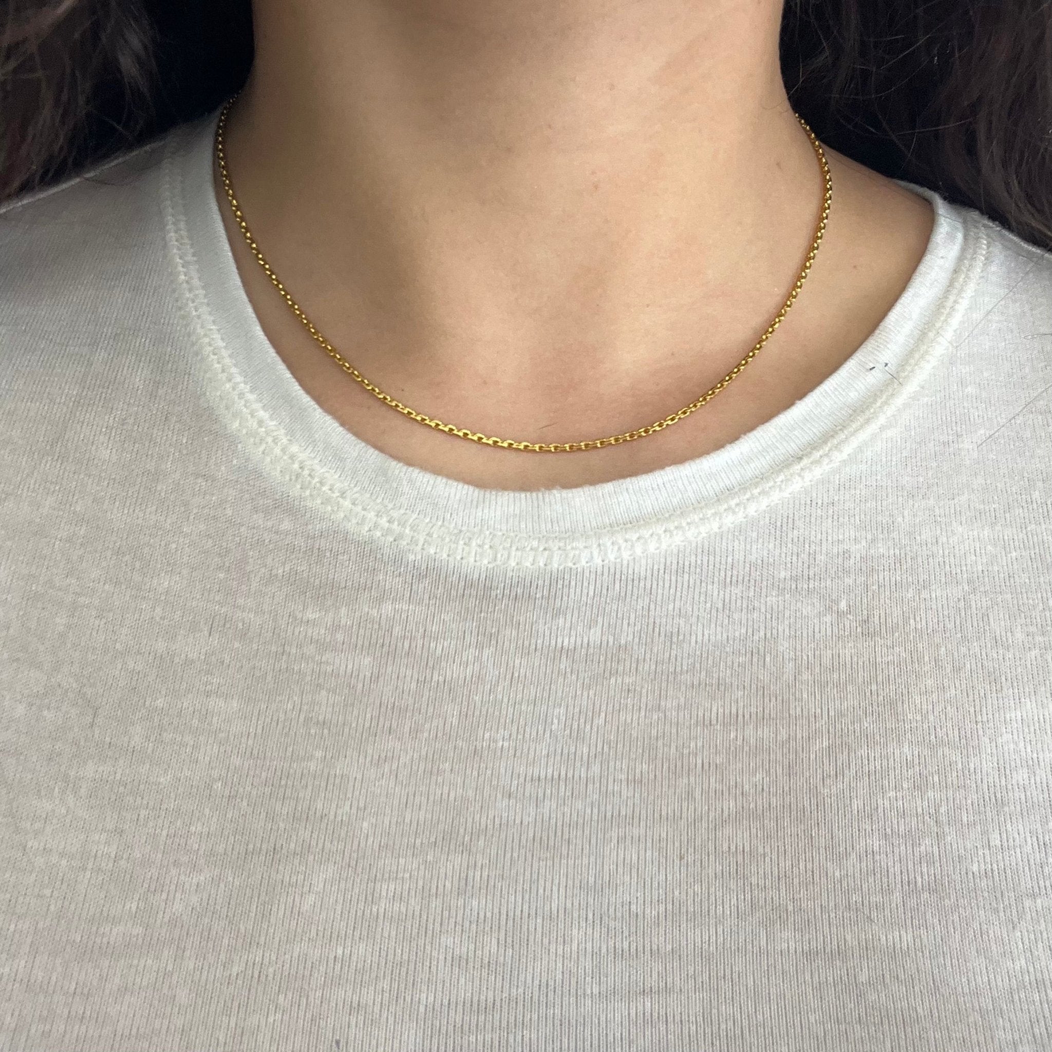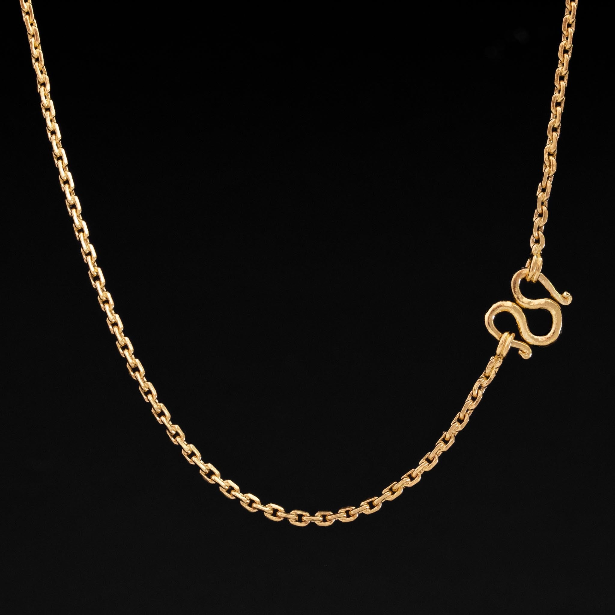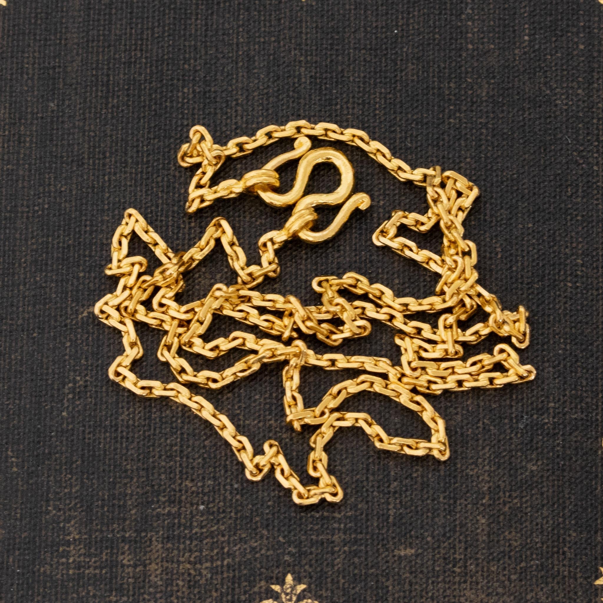A luxe, high karat gold version of a classic gold link chain! A petite (but chunky) cable link necklace in 22kt gold, with a double S clasp/catch, in the warmest of gold tones. We’d love to see this baby layered with other favorite chains of yours, but she looks quite fab when worn solo. A great addition to one’s collection of gold link chains, or perfect for you high karat gold lovers.