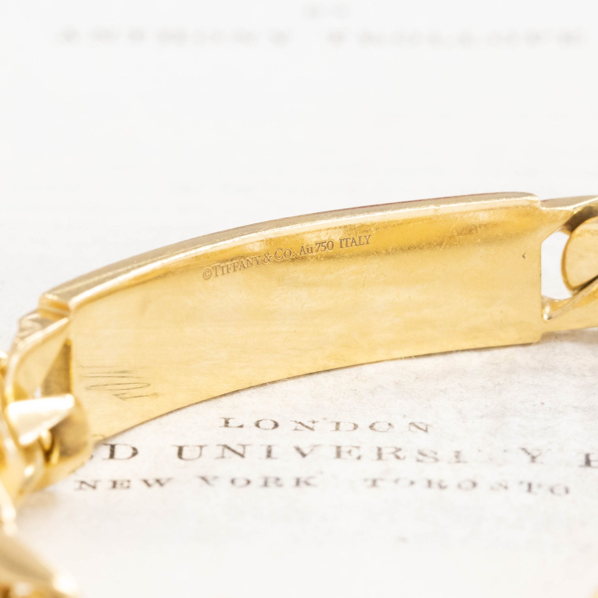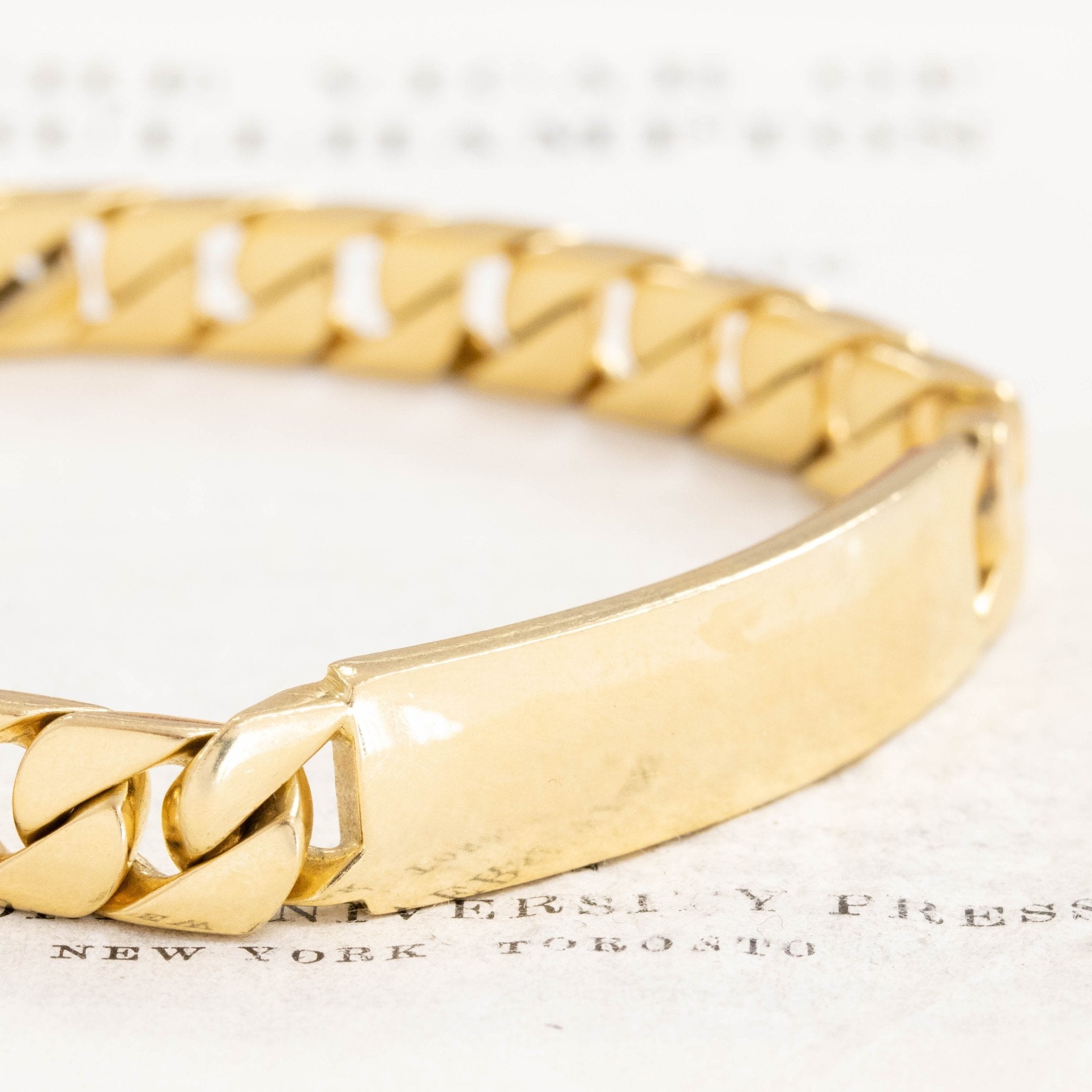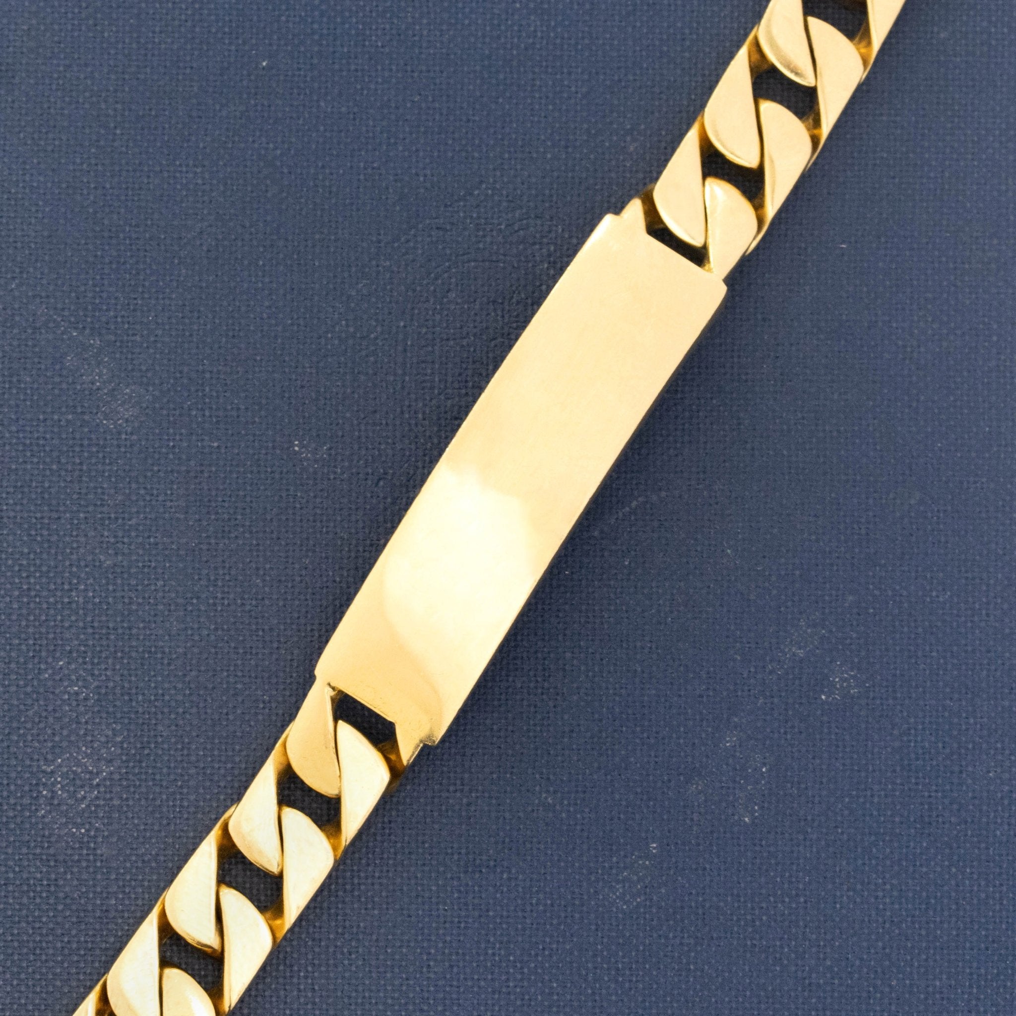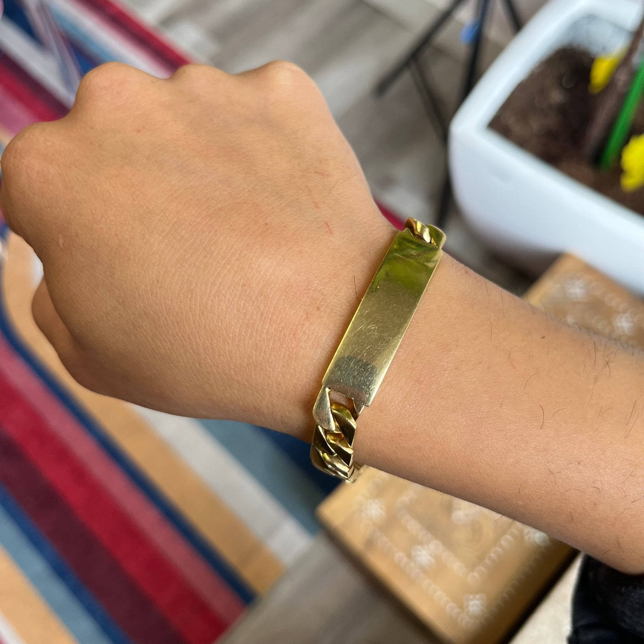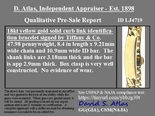 THE perfect ID bracelet in terms of scale and size! And while this is a man's model (guessing by the length), she is just as perfect for the woman who likes her gold pieces bold and heavy! No longer carried at Tiffany, the name plate is blank and ready for whatever name, message, or date you wish to engrave. Trust me, this is a GOOD one!