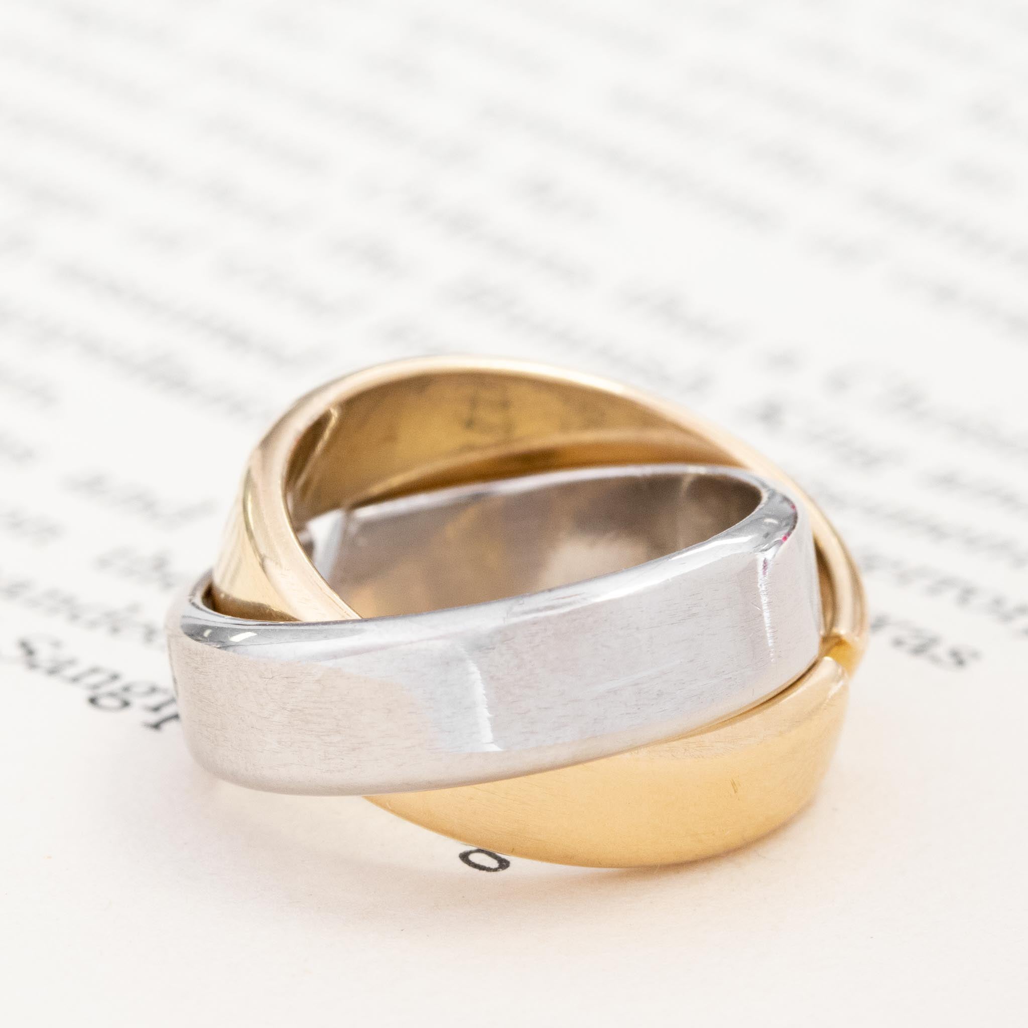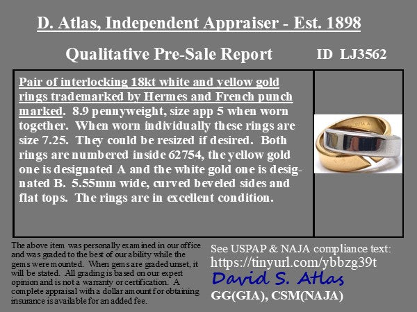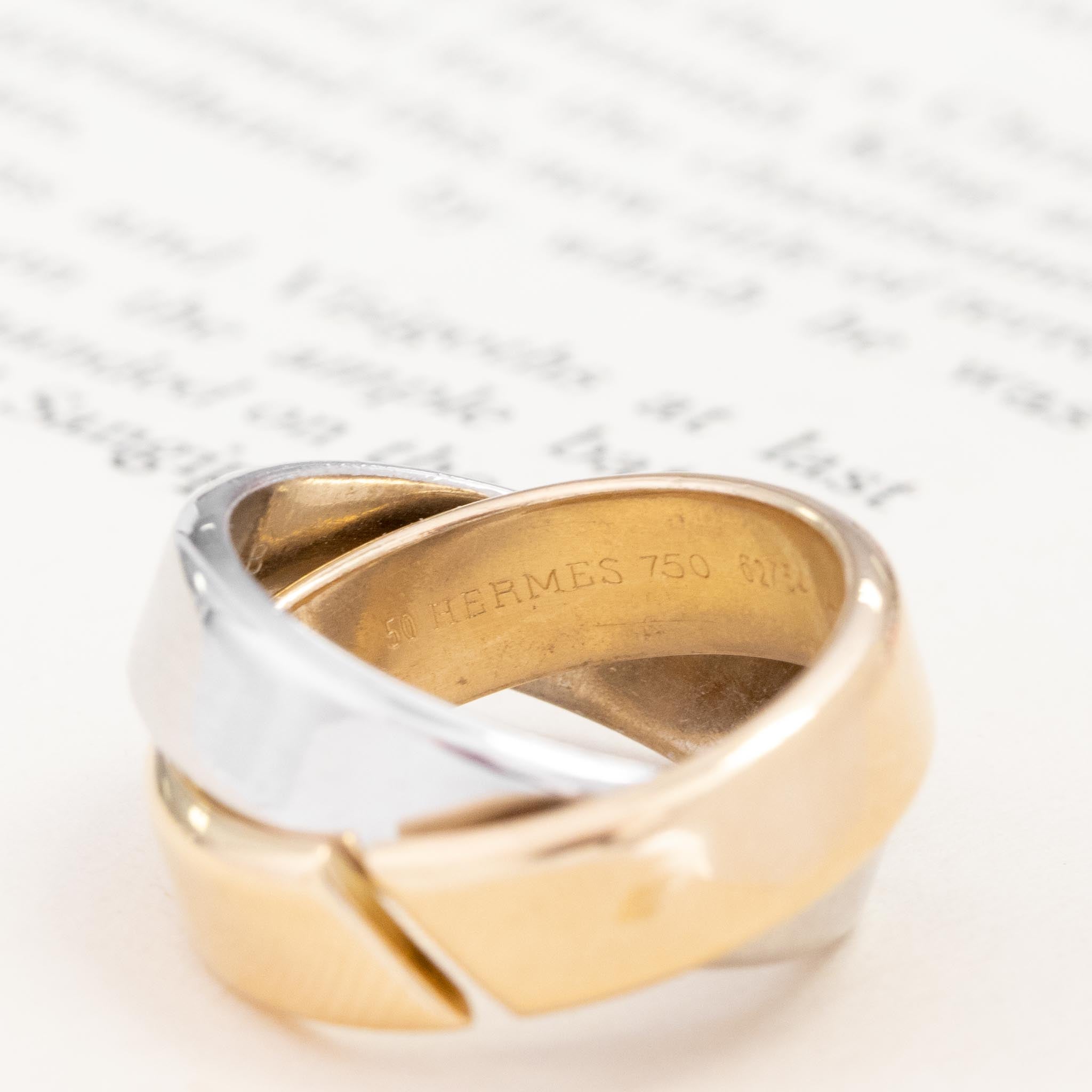 Super chic interlocking bands fro Hermes - one in 18kt yellow gold and another in white. Designed to lock together - the design is elegant and easy to wear, not to mention steeped in romantic sentiment! Stamoed Hermes, size 50 and numbered. French hallmarks.