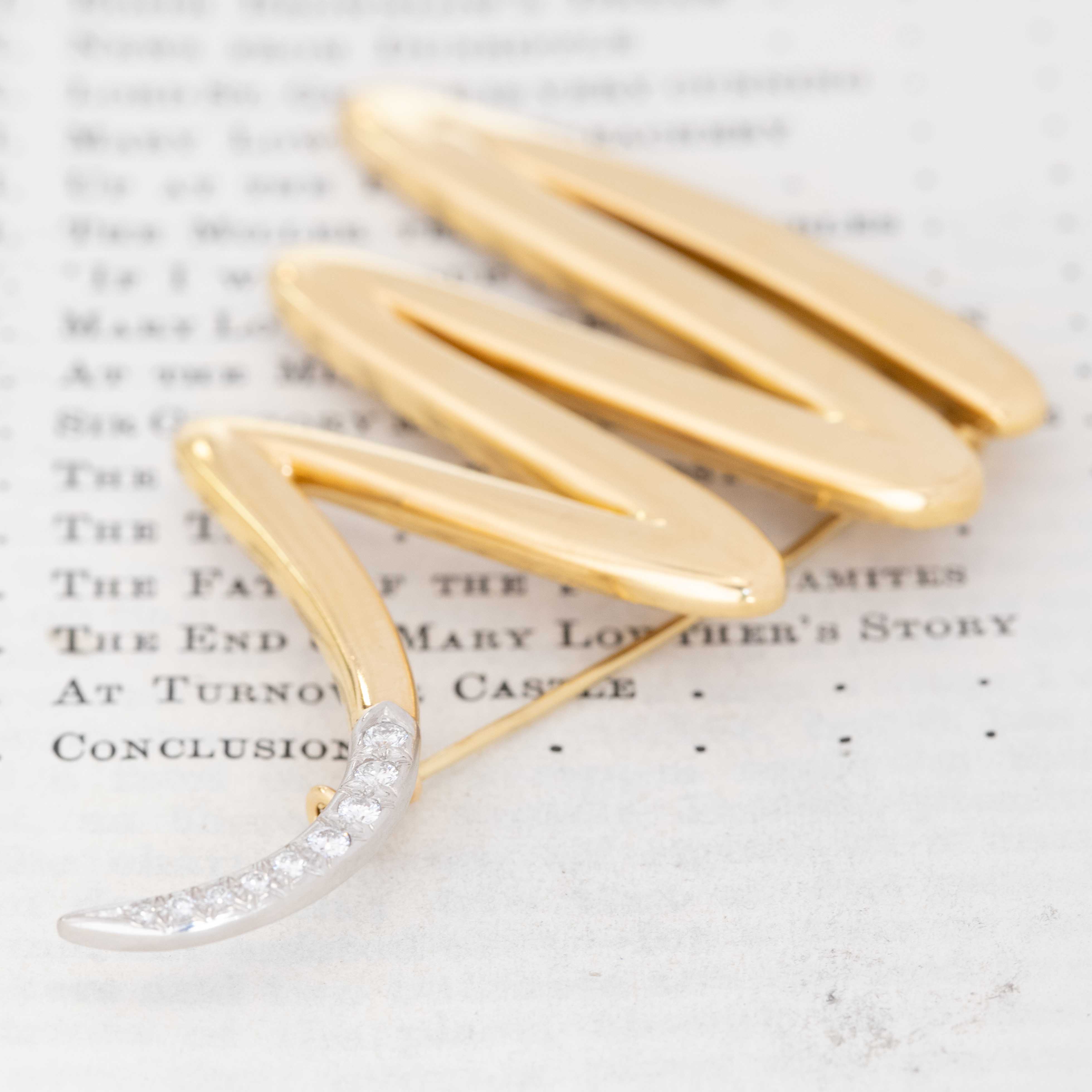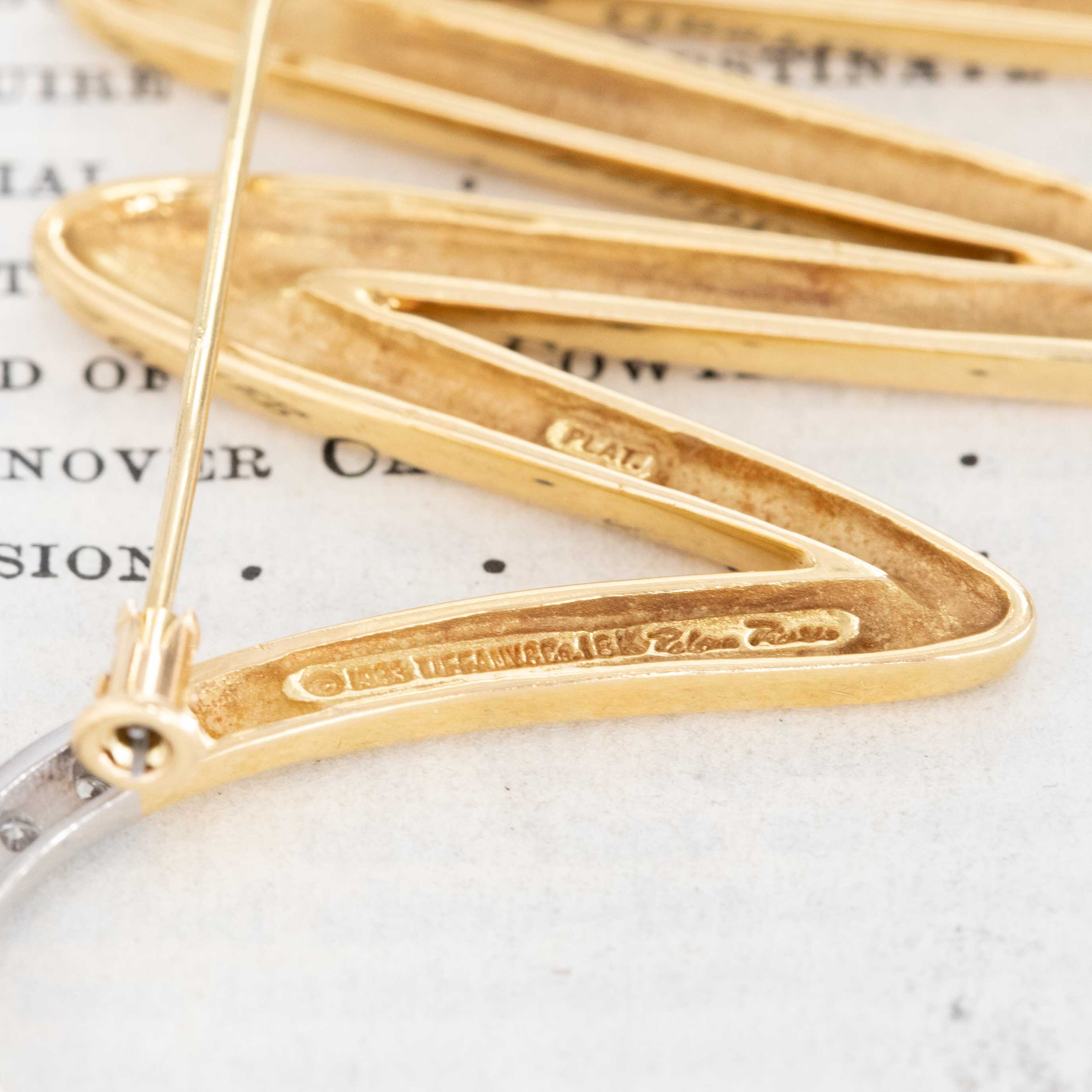 This brooch is part of Paloma Picasso’s modernist sculptural jewelry designs, introduced in the 1980s–1990s, a period when her bold gold forms and graphic silhouettes defined a new era at Tiffany & Co. Pieces from this time are highly collectible, prized for their strong design language and exceptional craftsmanship. This partciular brooch, with a diamond "tail" is a rarer form of the brooch as most are in solid gold without diamonds.