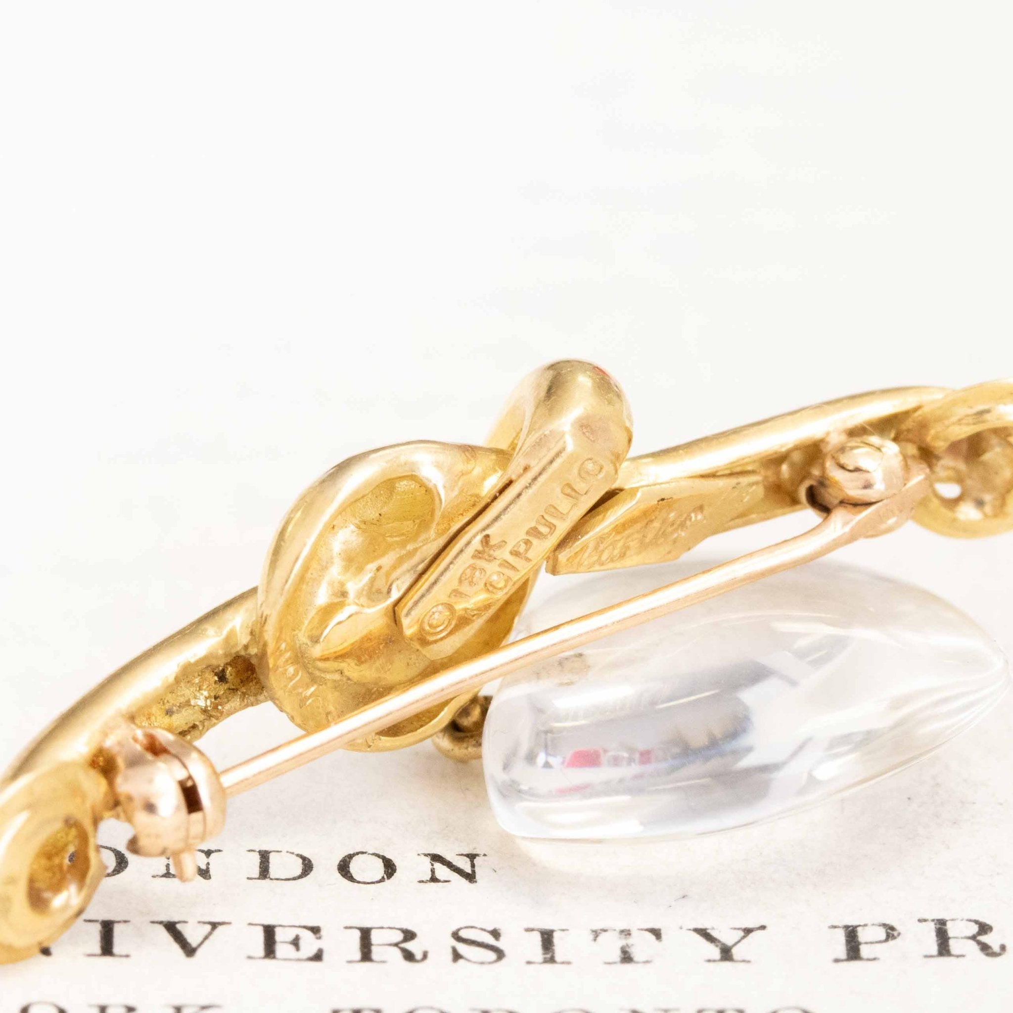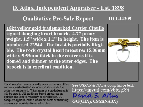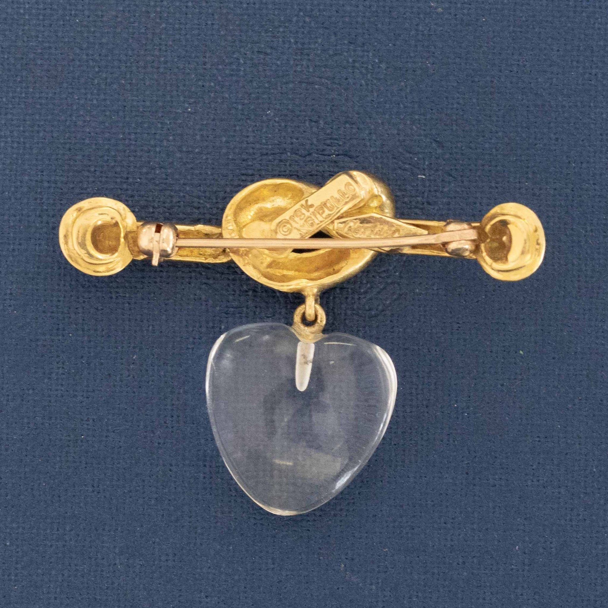Aldo Cipullo is one of the most iconic jewelry designers of the 20th century, and his limited work under Cartier has become quite the coveted and collectible lot! More known for collections like the Love pieces or Juste en Clou, he's got an underlying theme of androgynous designs, simple motifs, and impeccable craftsmanship. This lover's knot in buttery gold and a carved rock crystal heart is a beautiful piece with lovely movement coming from the suspended heart.